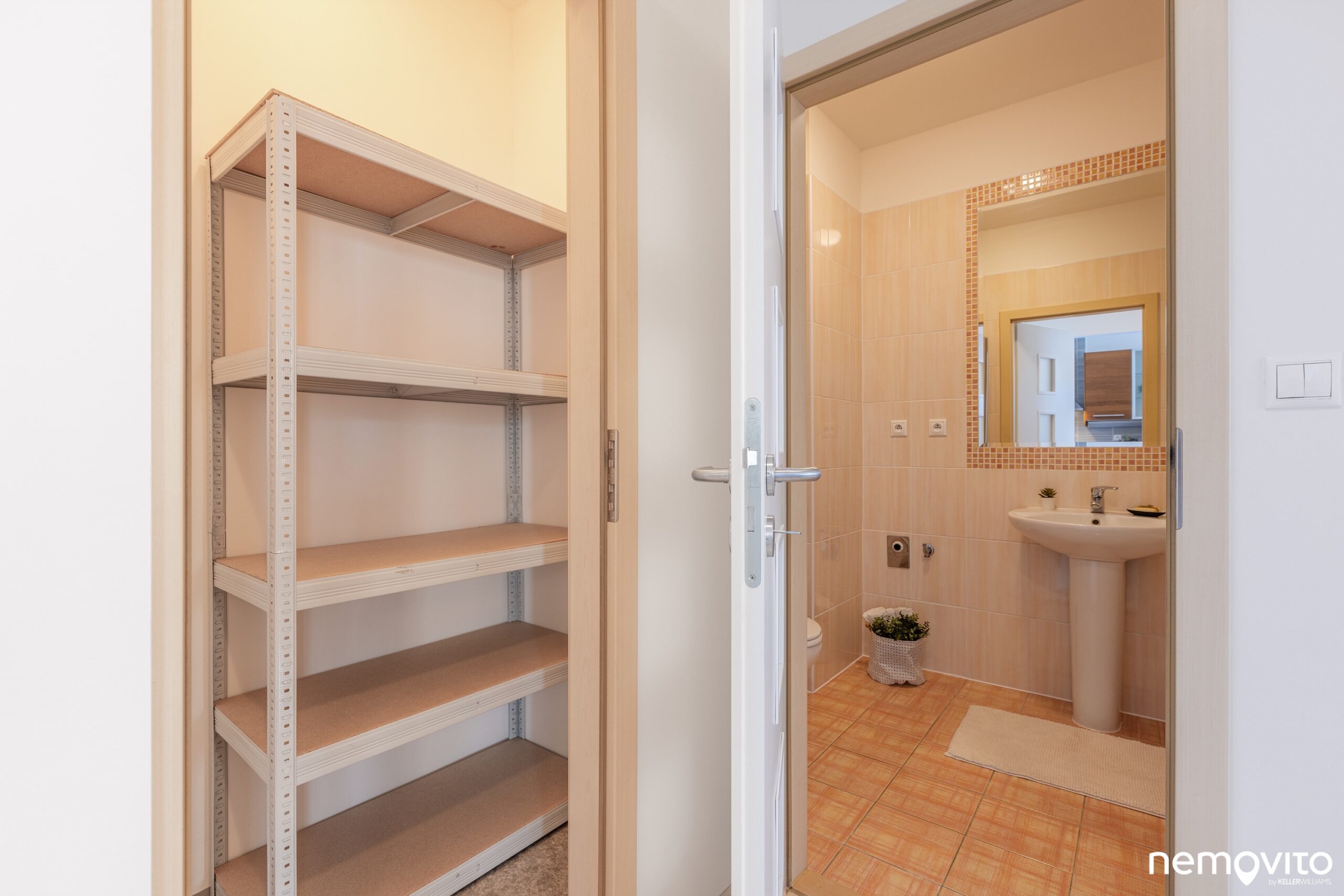 Ještě než vběhneme do koupelny, po cestě si můžete všimnout komory. Ano, ani komora tomuto bytu nechybí. Prostor o velikosti lehce přes 1 m2, který se ale dost možná stane tím nejcennějším metrem celého bytu. Konec vypadávání věcí z přeplněných skříní!