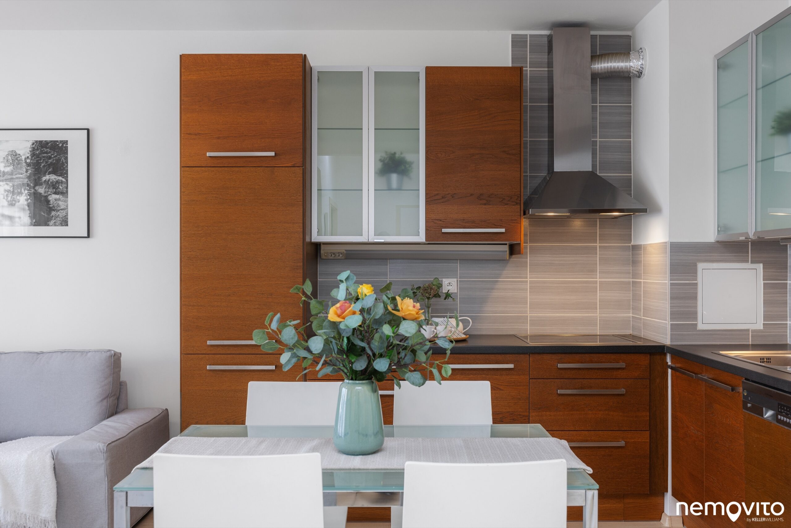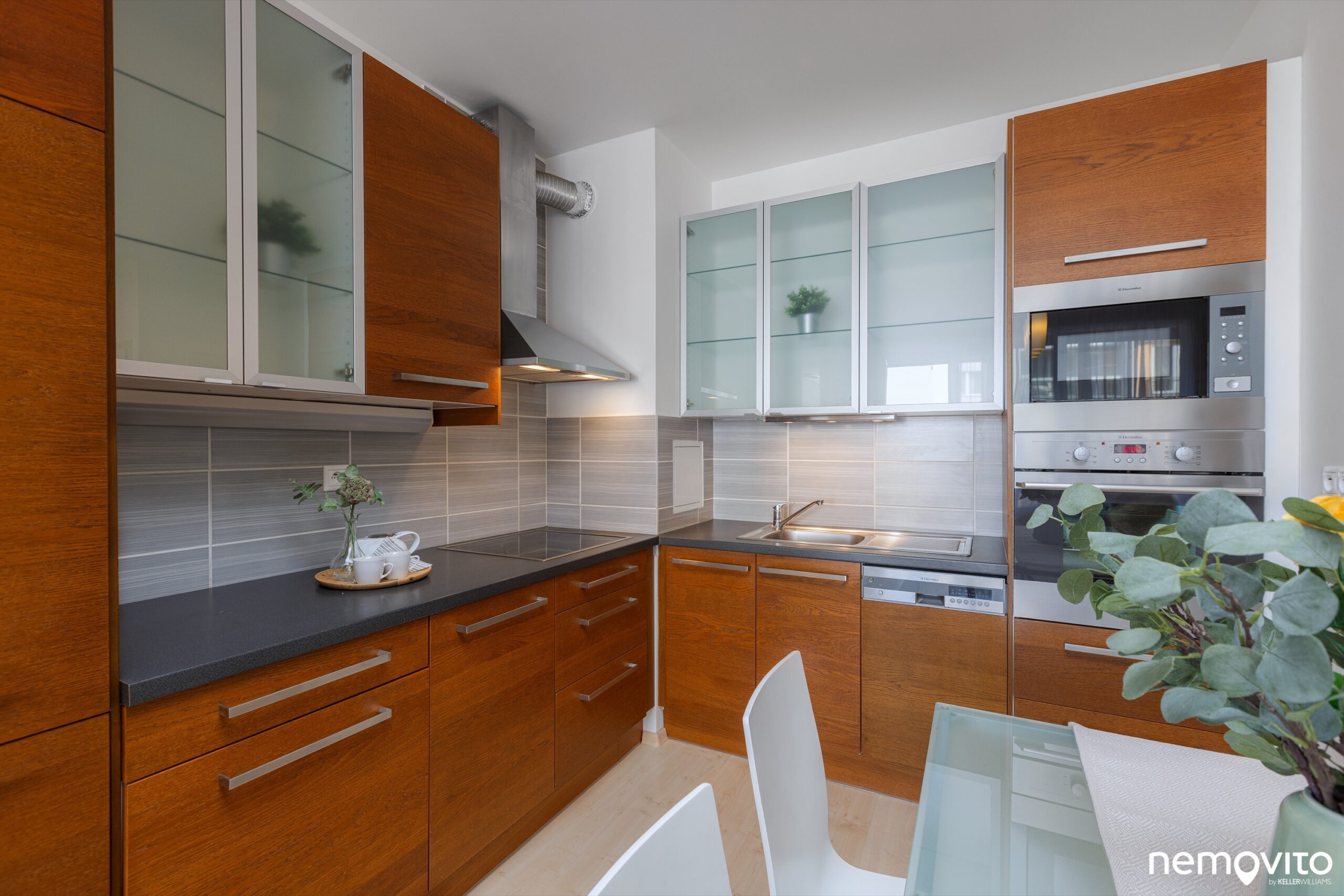 Jaká je častá bolest těchto bytů? Malé kuchyně. Tady je však plnohodnotná linka, za kterou by se rozhodně nestyděl ani rodinný byt.