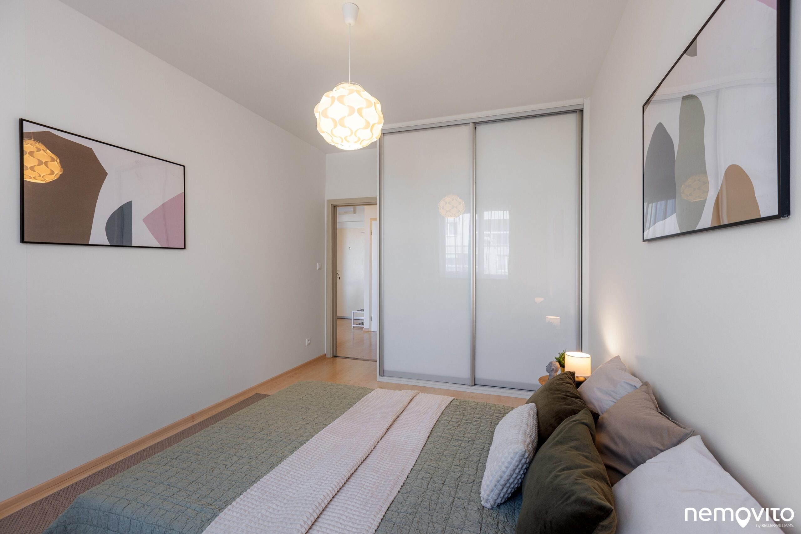 Hlavní místnost bytu bychom tímto měli prohlédnutou. Ten se přes posuvné dveře s mléčným sklem, které šetří místo, podíváme do ložnice.