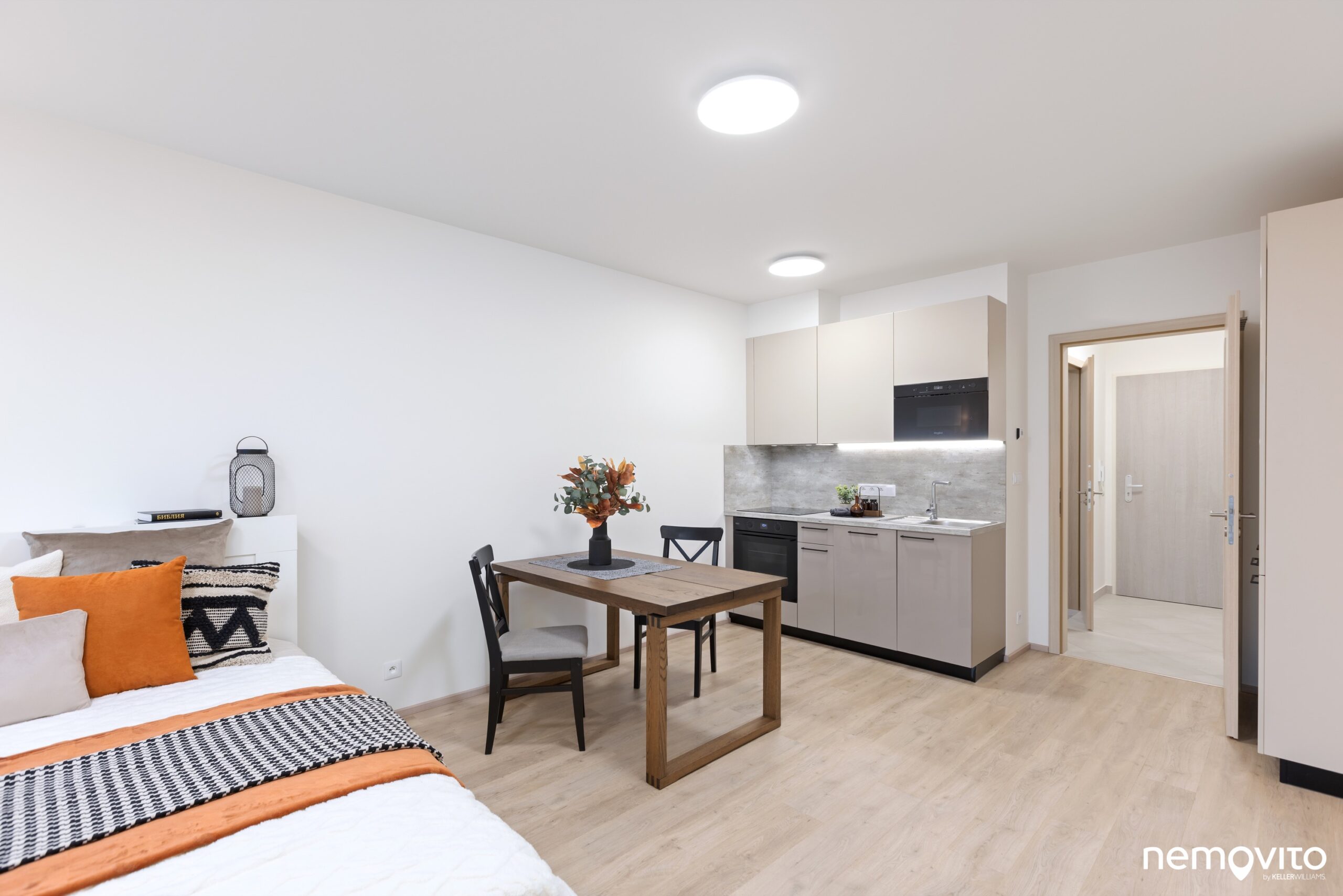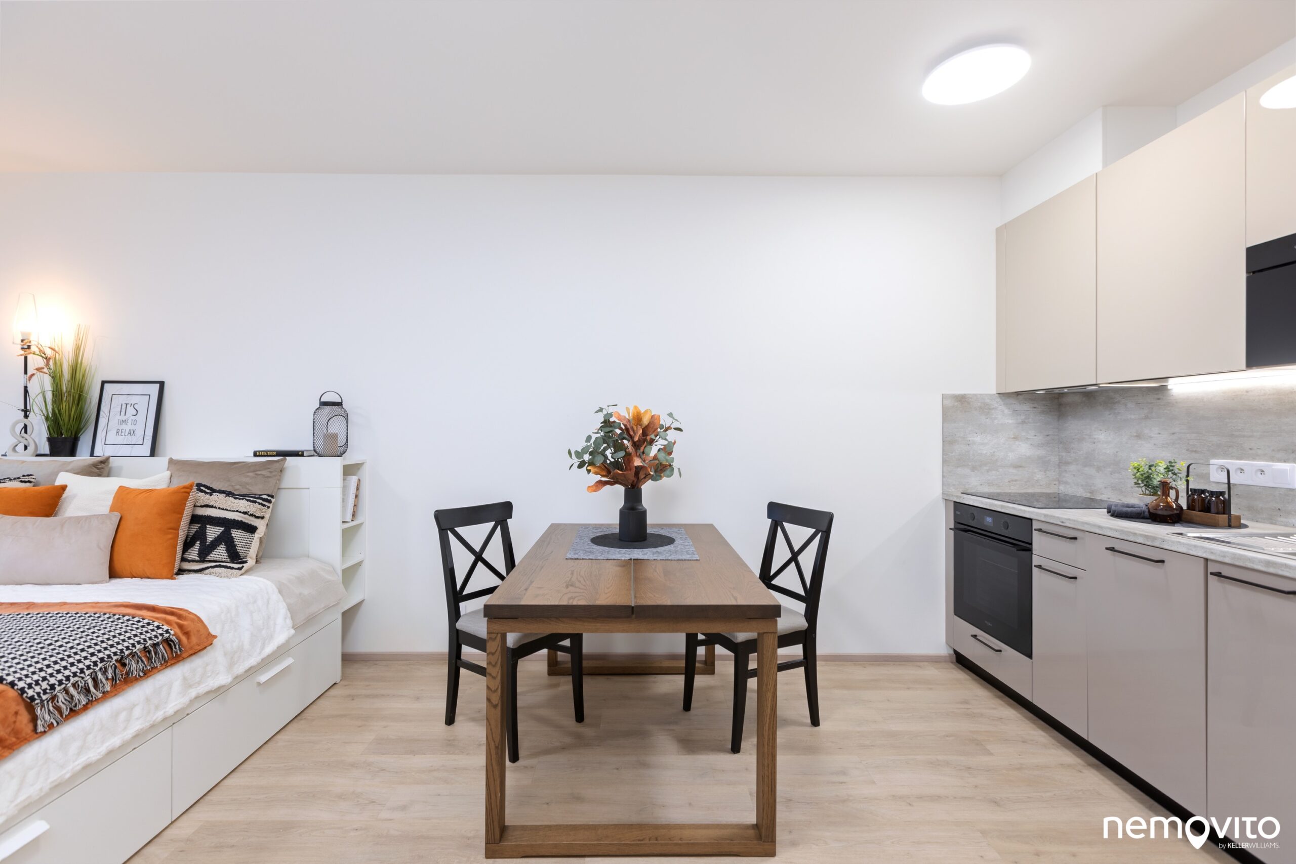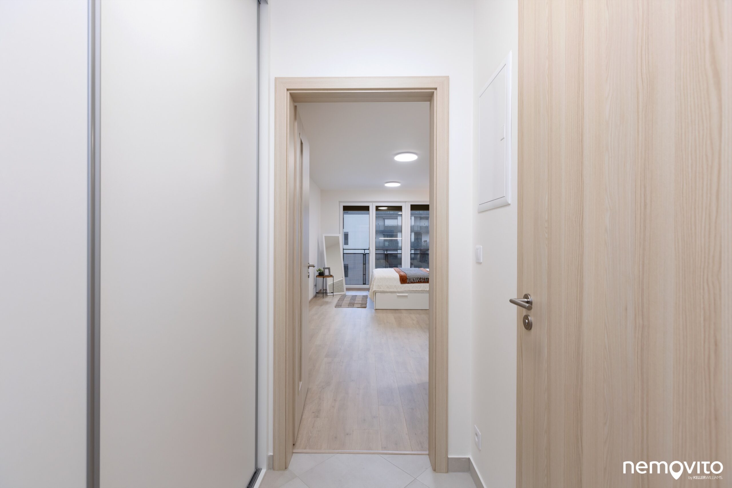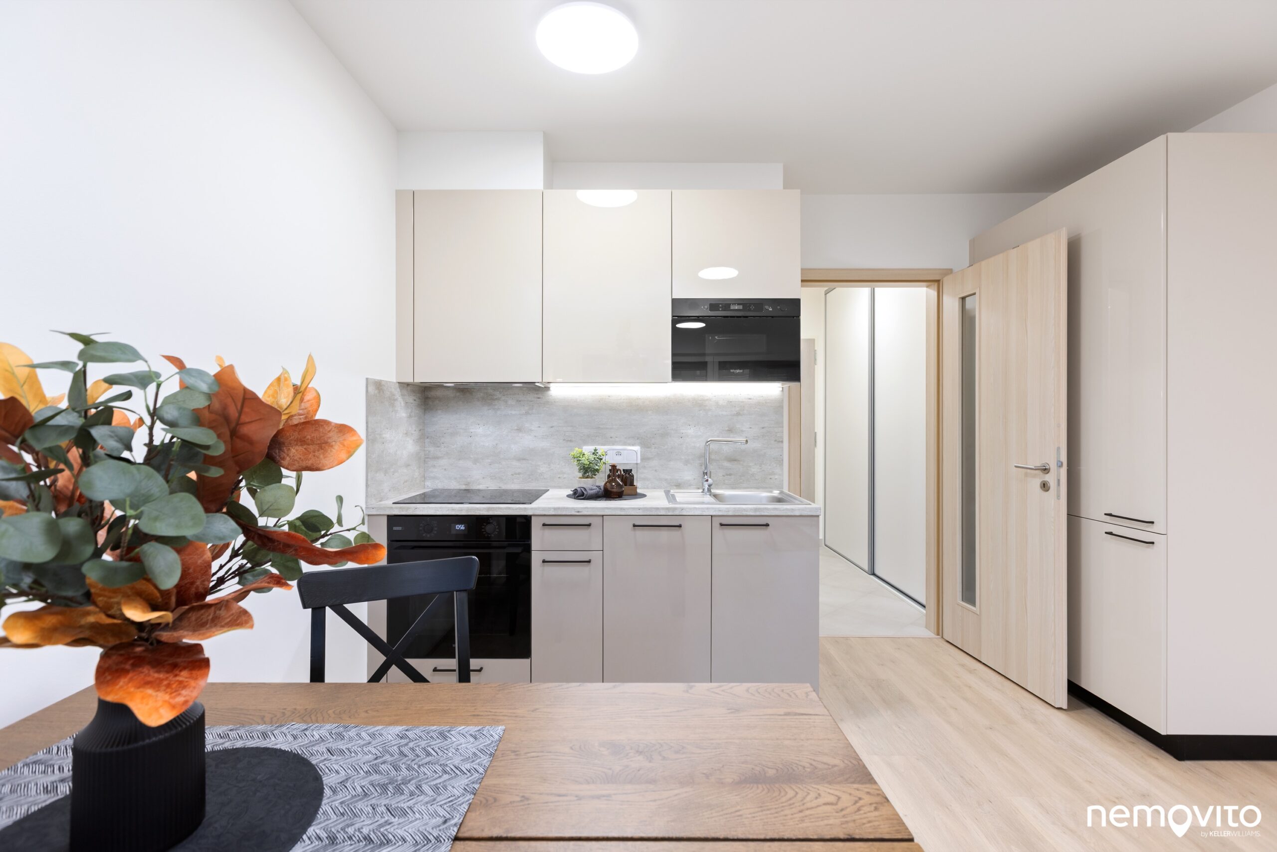 Kdo čekáte v 1+kk vodotrysk, na svoje si tady nepřijdete. Kdo však chcete nový malý byt, kde vám nebude chybět sklep ani stání, jste tady správně. V tomto případě však nechybí ani svatý grál garsonek, kterým je prostorný balkon. Ten byt transformuje do úplně jiného rozměru, hlavně tedy v letních měsících. Otevřít velké dveře, vytáhnout stínící rolety, a hurá na kávu na krytý balkon o velikosti pěkných 7 m2. Byt má za sebou sotva první rok (dokončen byl v dubnu 2025), takže známky opotřebení budete muset hledat lupou. Díky tomu však nemusíte shánět kuchyni, ta je včetně vestavěné skříně na svém místě. Kvalitní linka od firmy Hanák není žádný low-cost, ostatně v tomto bytě bylo v plánu strávit několik dalších let. Plány se ale občas mění a byt si s sebou do letadla nevezmete. Příležitost pro vás - přistát u hostivařského lesoparku můžete v podstatě hnedka.