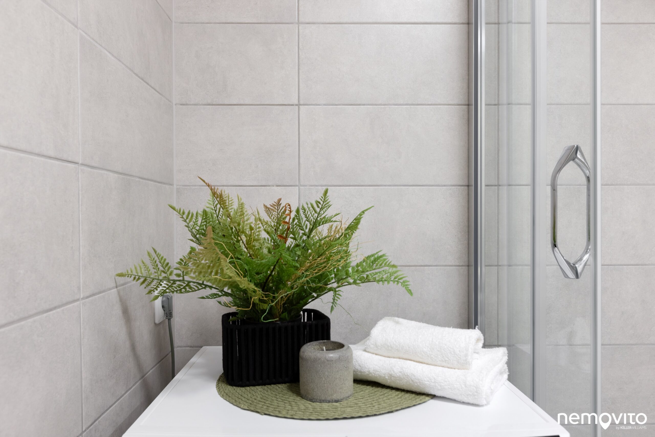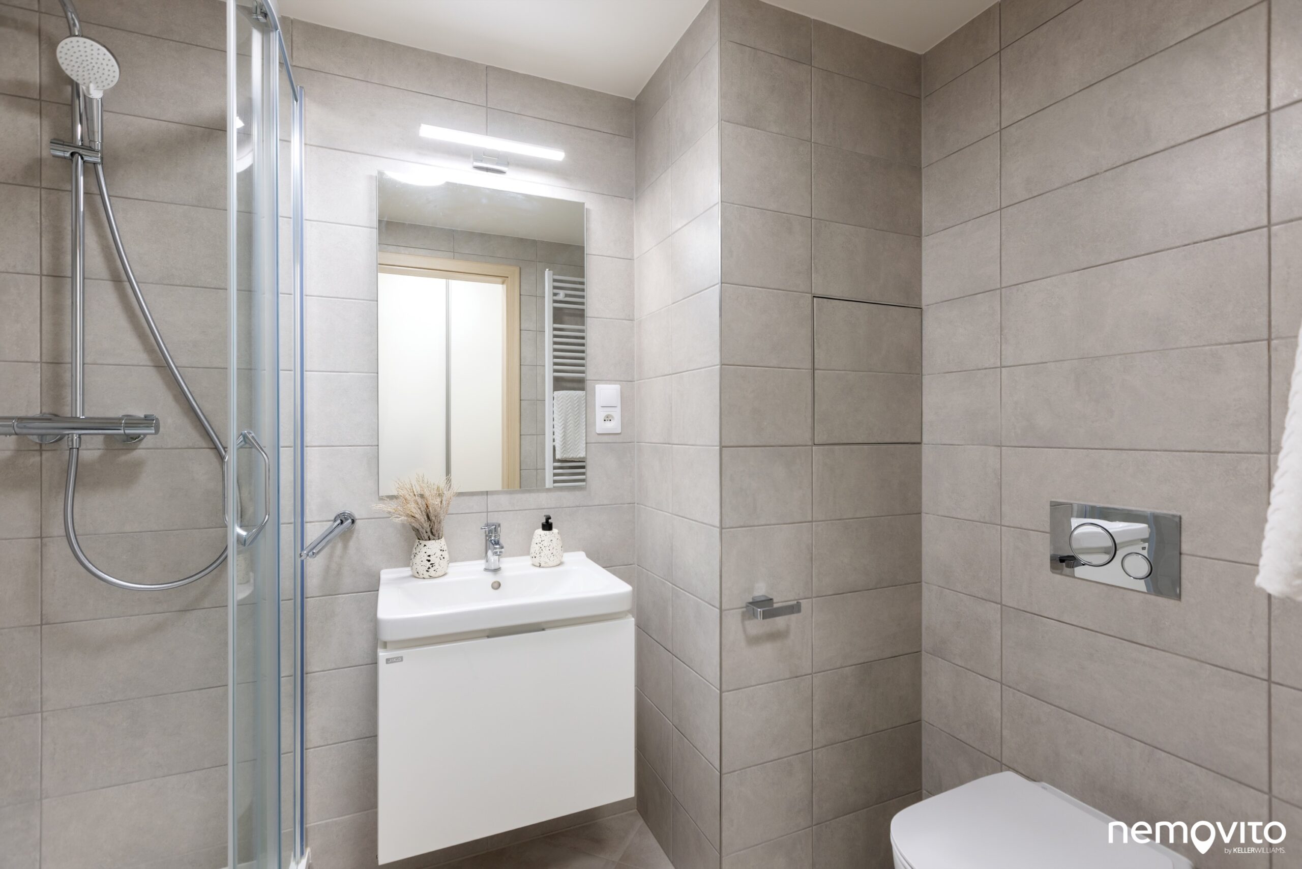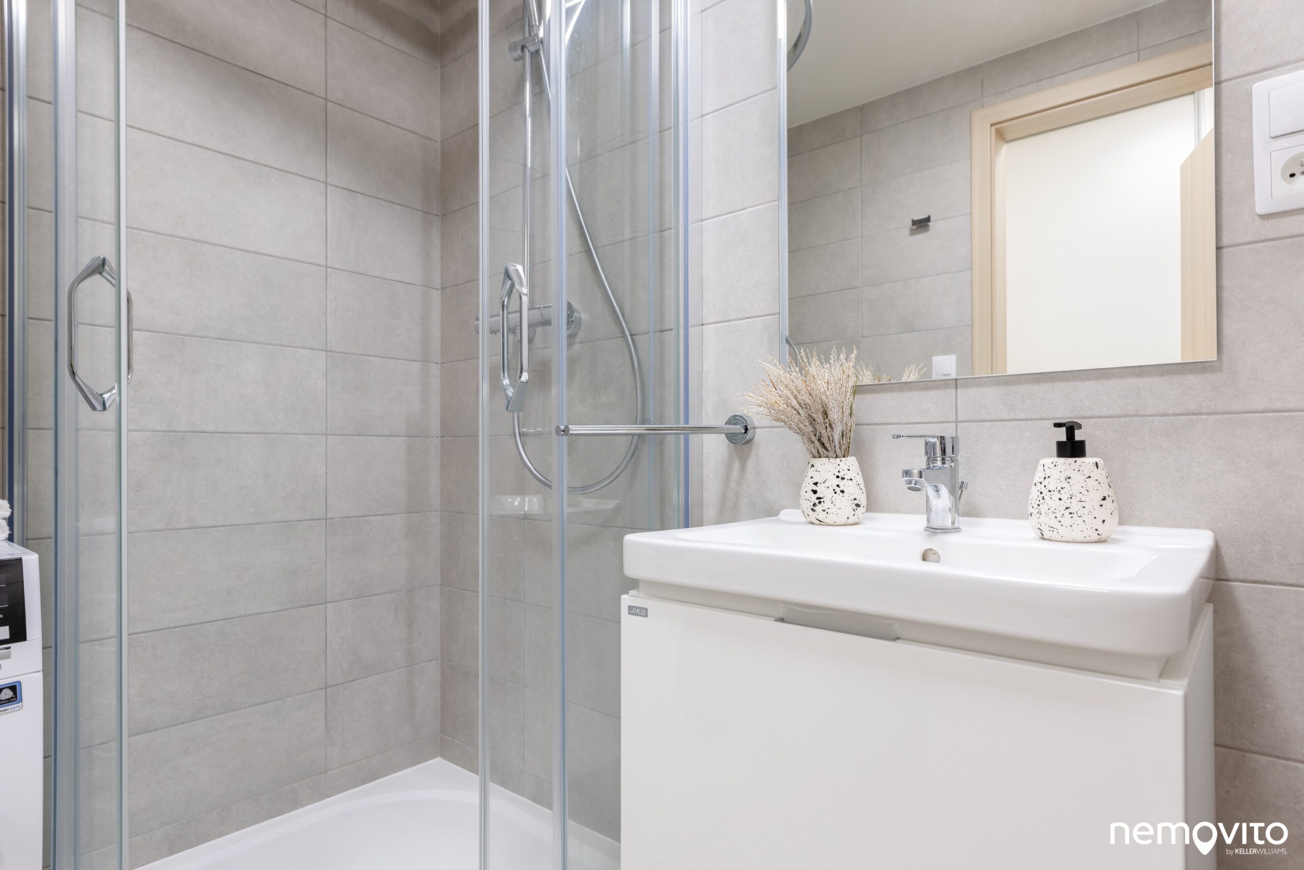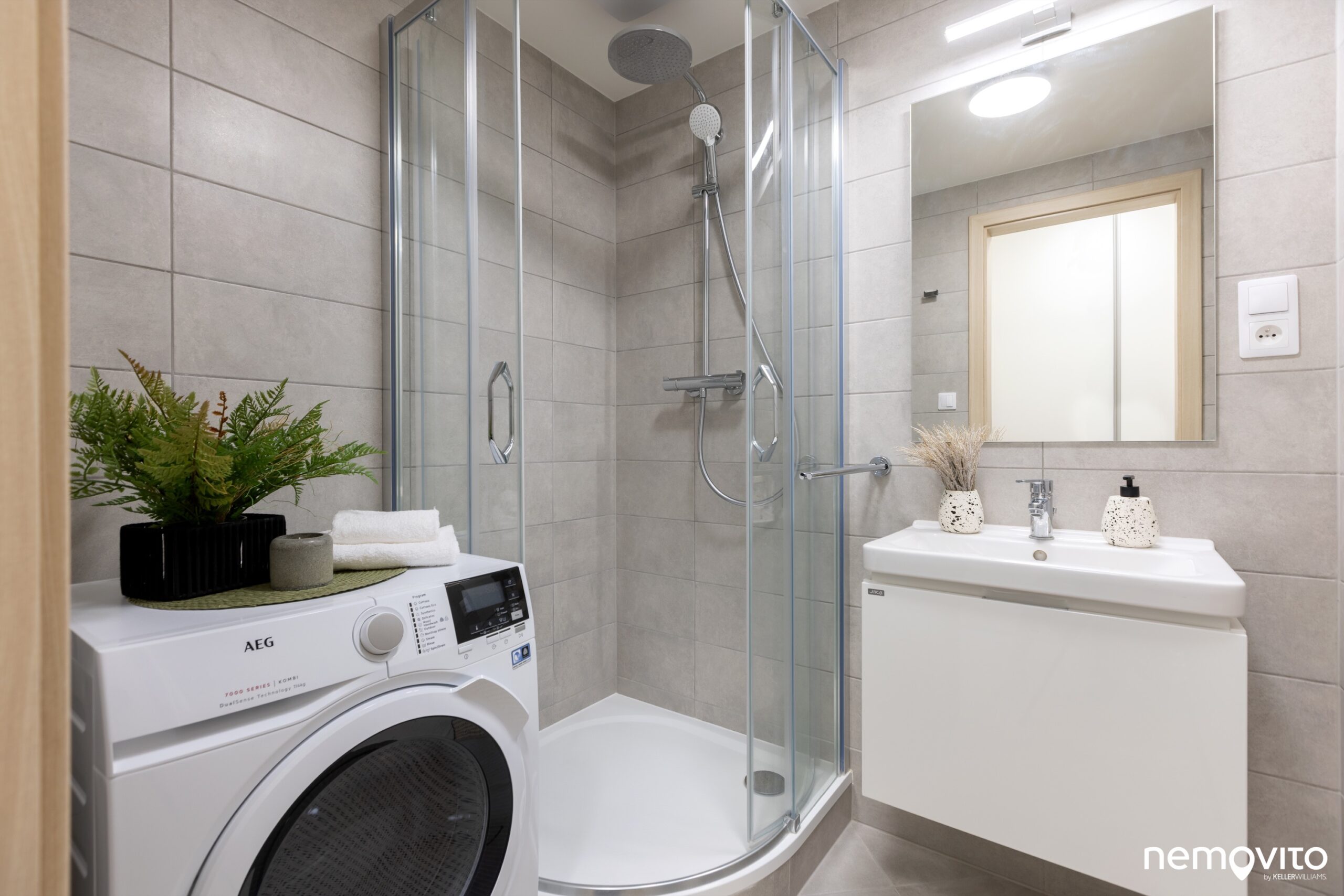 Velkoformátové dlažba, tlumené tóny a žádná divočina. Koupelna, která nezestárne při prví výměně módních trendů, má plochu 4 m2. Díky tomu se vedle sprchy vejde pračka i sušička nad sebe. I zde byla řada věcí řešena v nadstandardu - například závěsné WC nebo větší sprcha.