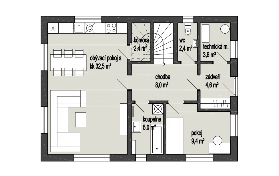 Západní okna jsou skutečně příjemným benefitem, protože jakmile zasvítí sluníčko, je celý prostor krásně prosluněný. Ve dveřích vpravo vedle linky se nachází spíž o velikosti 2.4 m2, která vede pod schodiště.