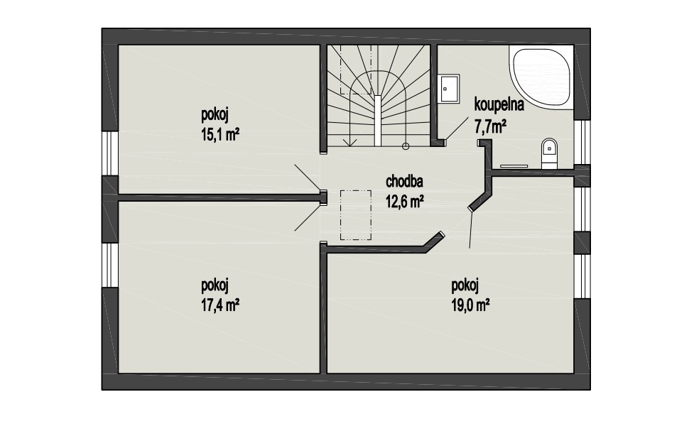 V prvním podlaží domu vás také čeká jeden pokoj. A to buď pokoj pro hosty (hned vedle je koupelna), případně vaše pracovna. Okna jsou na východ a jih, plocha činí 9 m2.