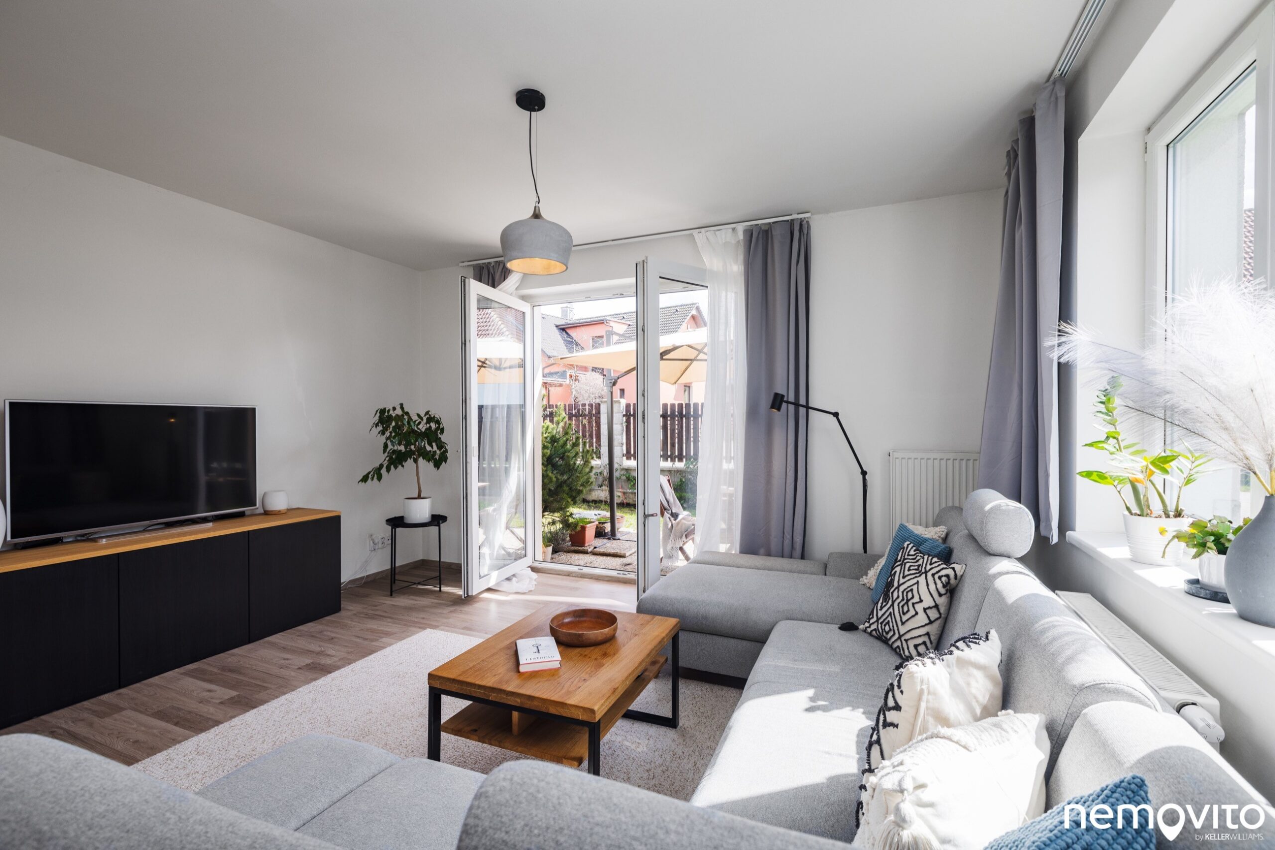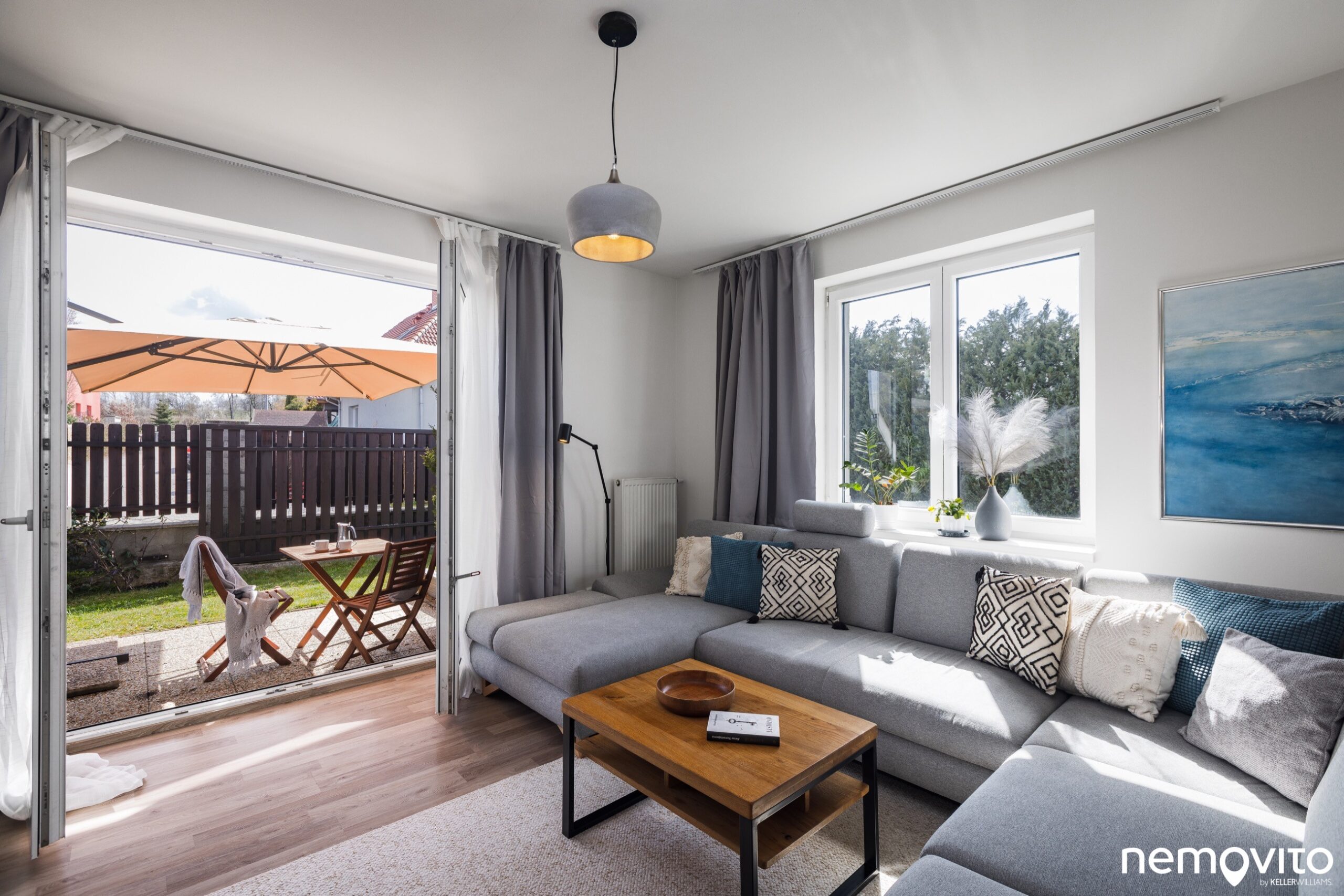 Tou je obývací pokoj, ze kterého se přes francouzské okno dostanete na jižně orientovanou terásku.