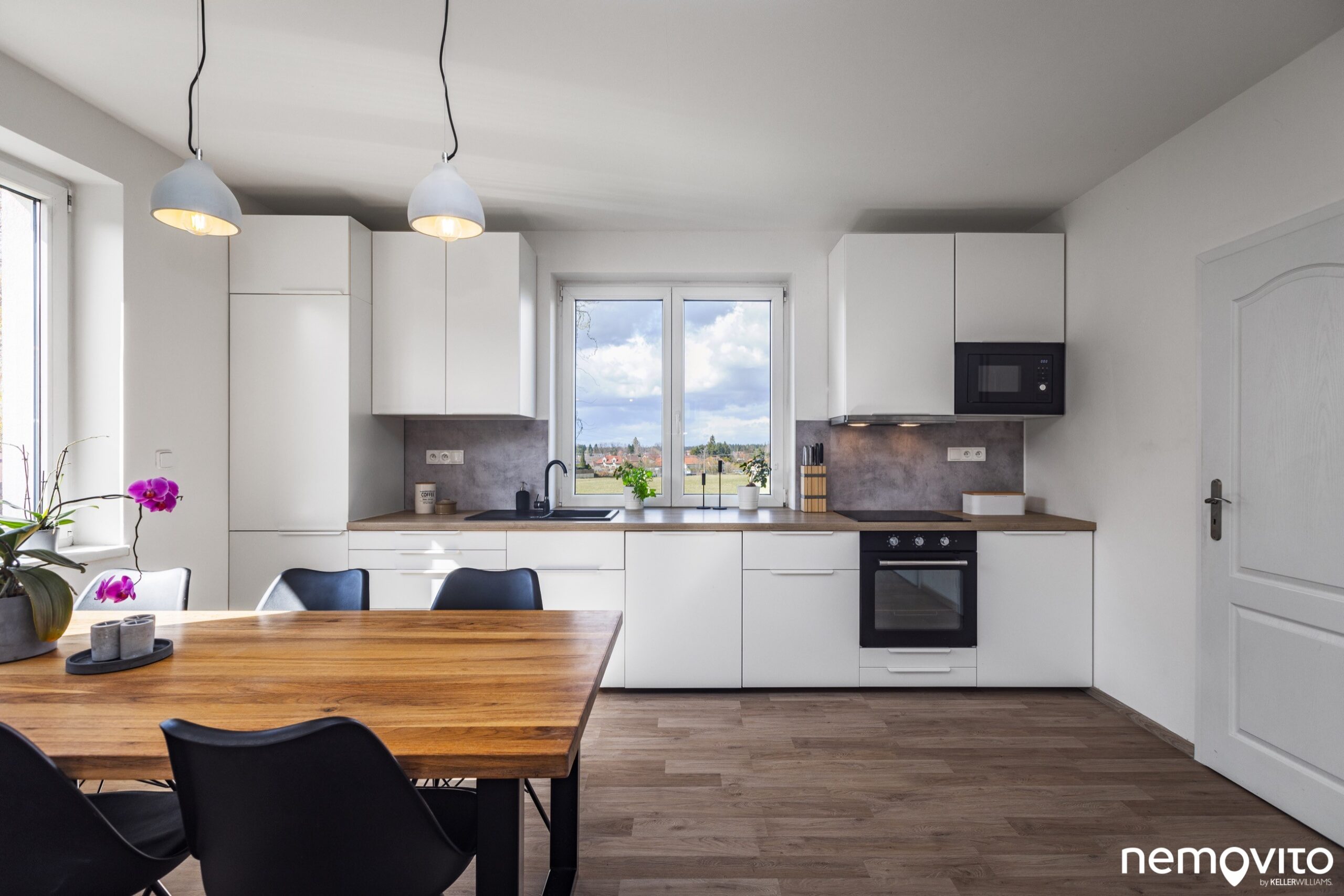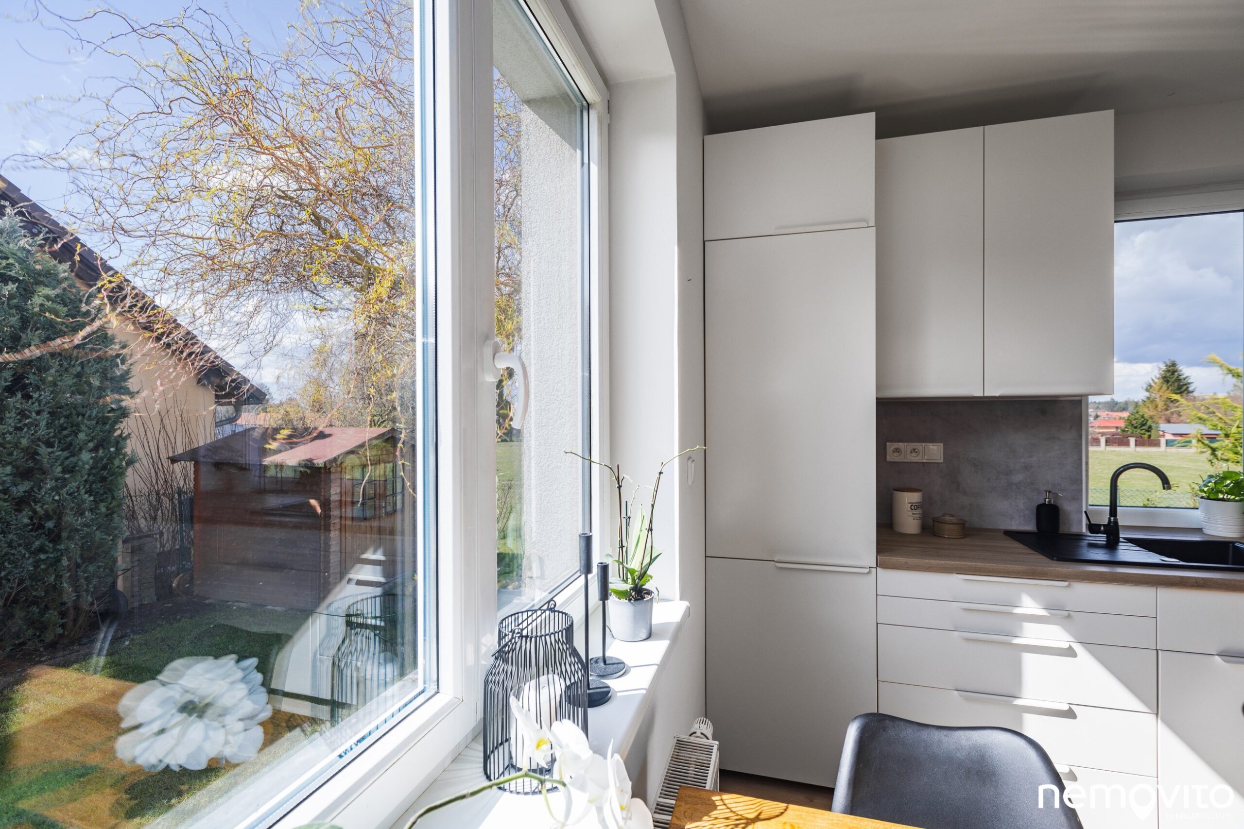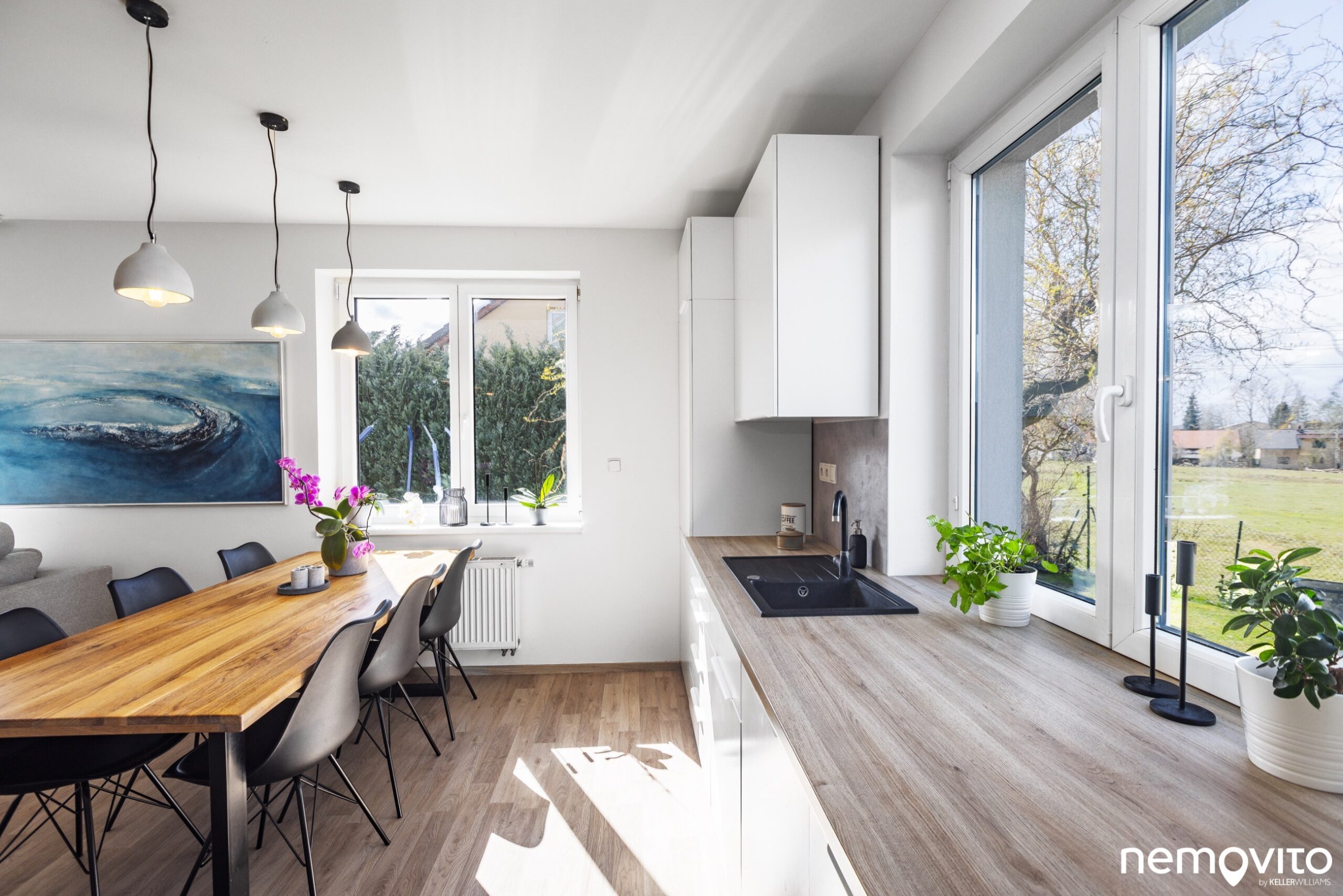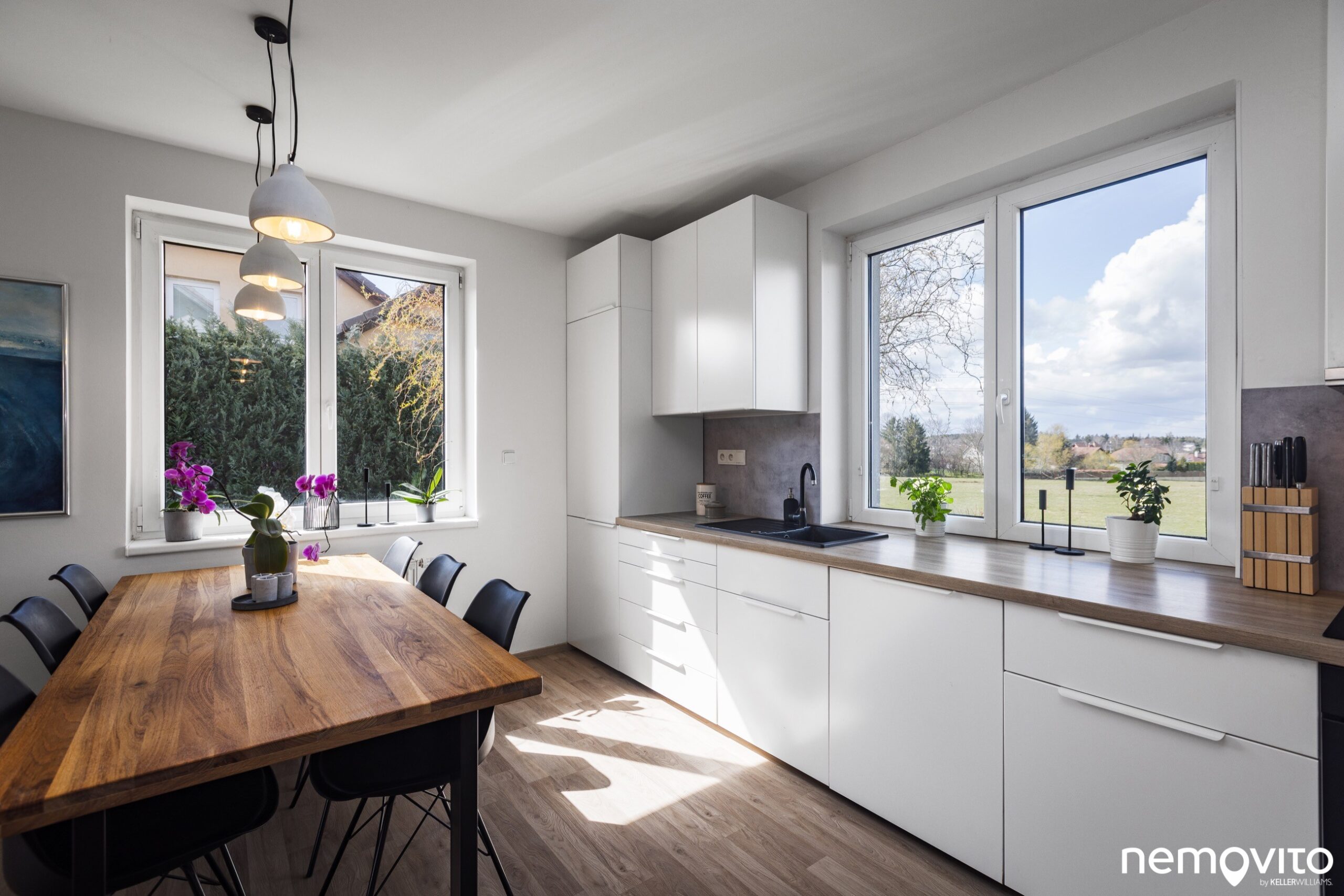 Tedy dost na to, aby se do místnosti bez potíží vešel i plnohodnotný jídelní prostor s velkým stolem. Kuchyňská linka je po celé délce zadní stěny místnosti s oknem, které má výhled směrem na louku.