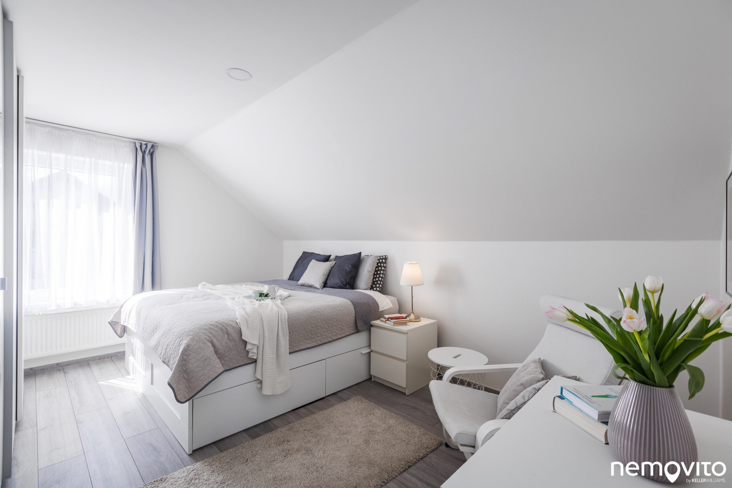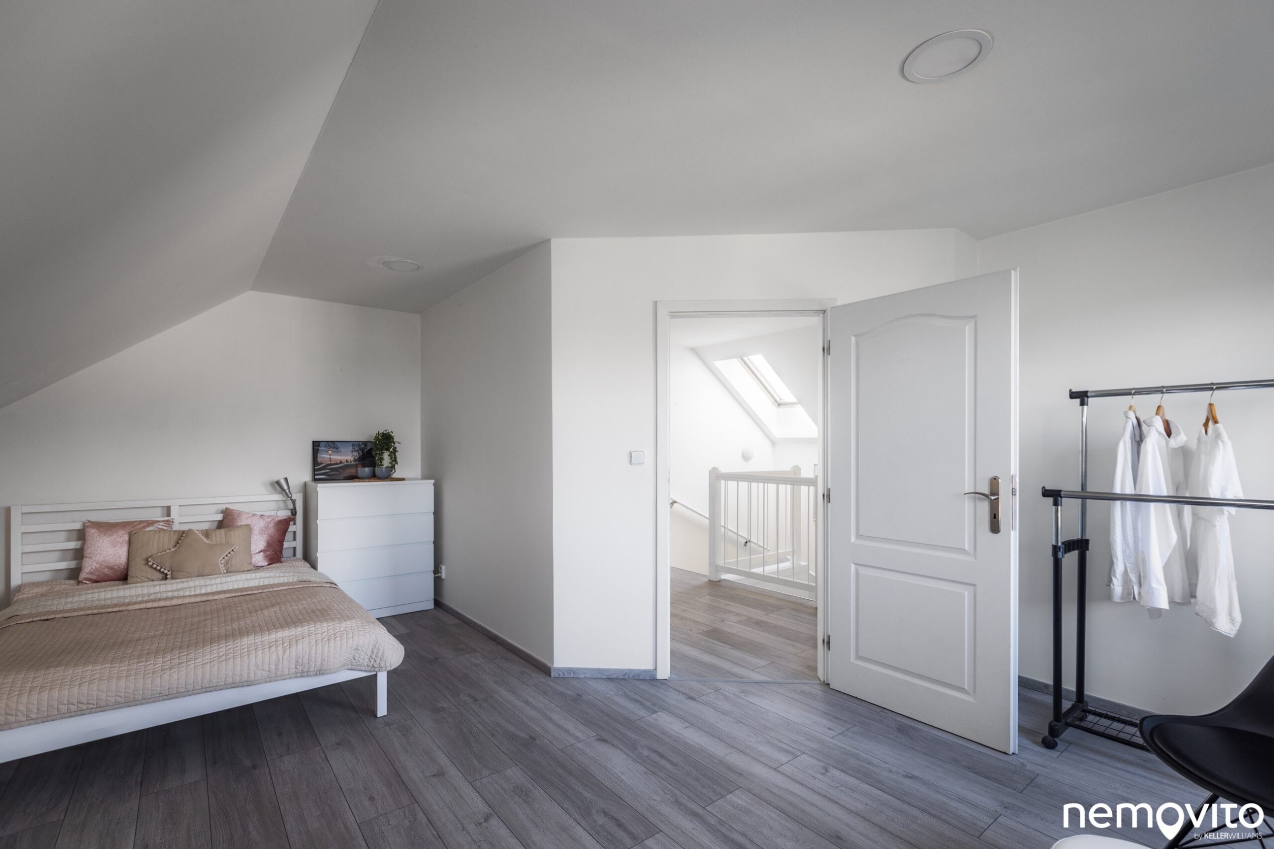 Stejně jako dole, i nahoře jsou všechny místnosti přístupné z centrálně umístěné chodby. První ložnicí je aktuálně hlavní rodičovská s velkou vestavěnou skříní. Plocha je 15 m2 a z horních pokojů je tedy nejmenší.