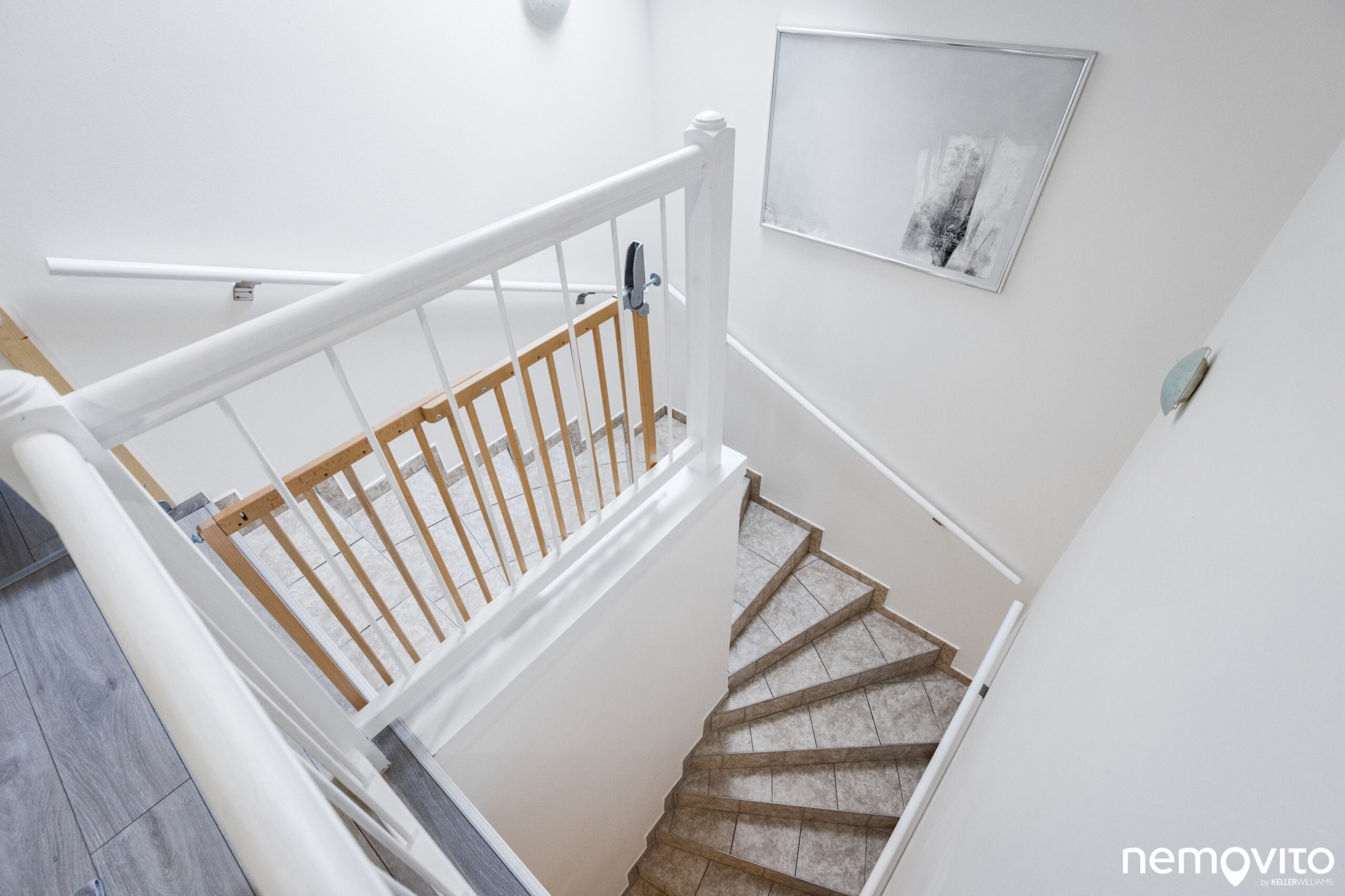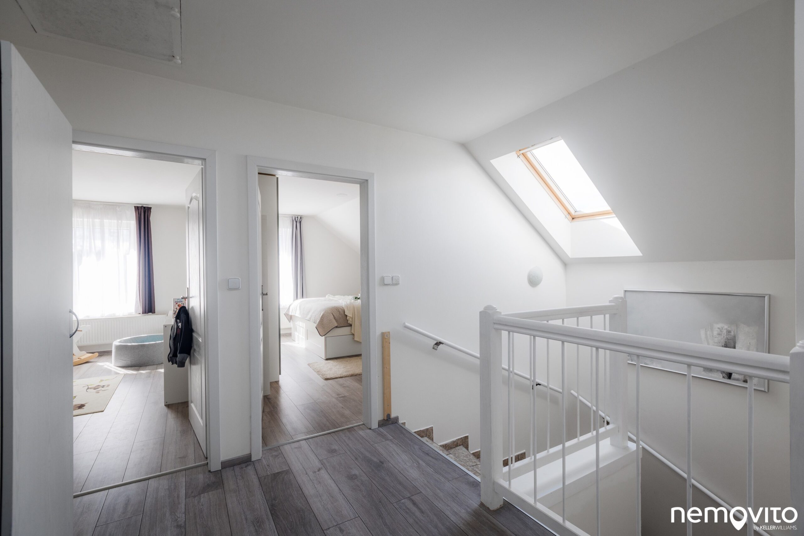 Přes schodiště se přesuneme do druhého podlaží, kde nás čekají 3 ložnice a druhá koupelna. Schodiště je prosvětlené střešním oknem, které se nad tím nachází.