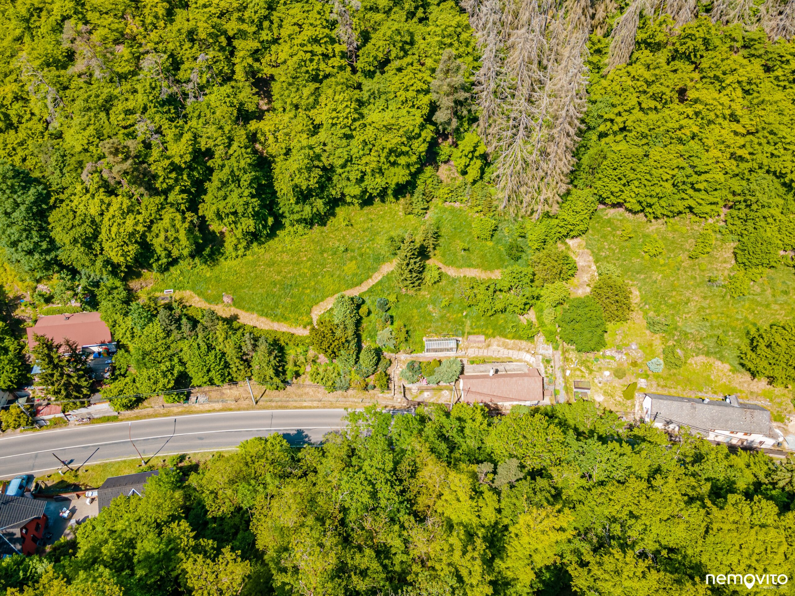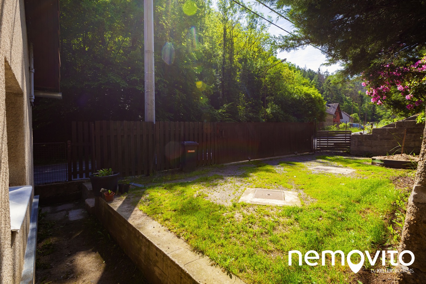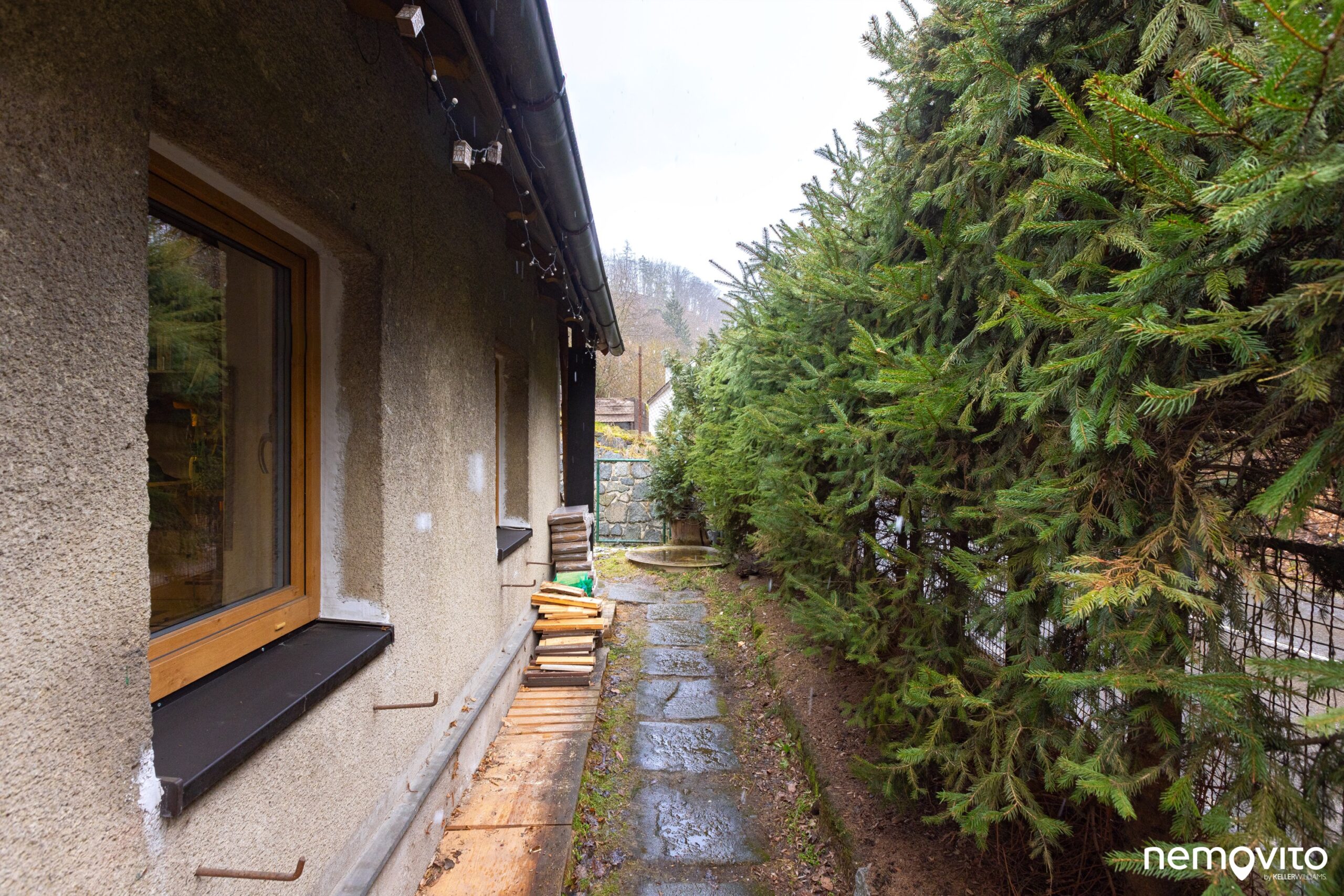 Kolem domu se ve spodní části nachází pás rovné části pozemku, která tvoří přístup.