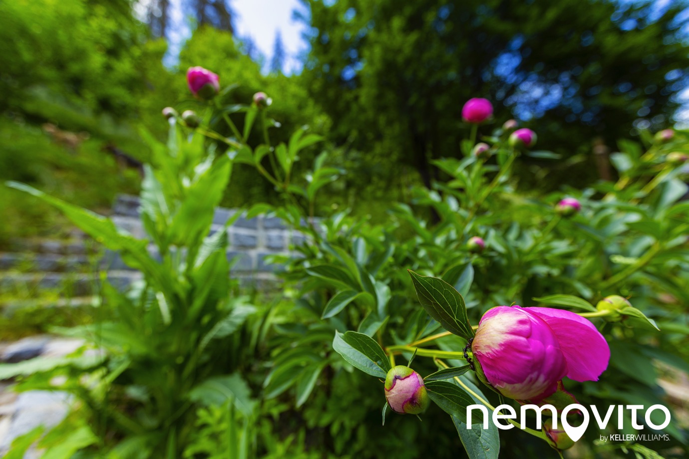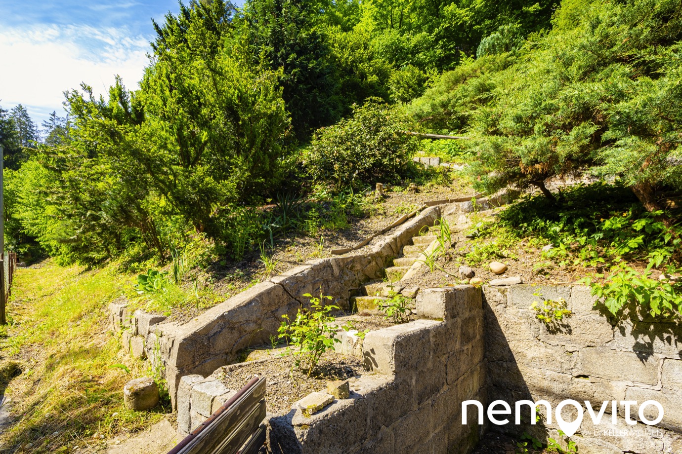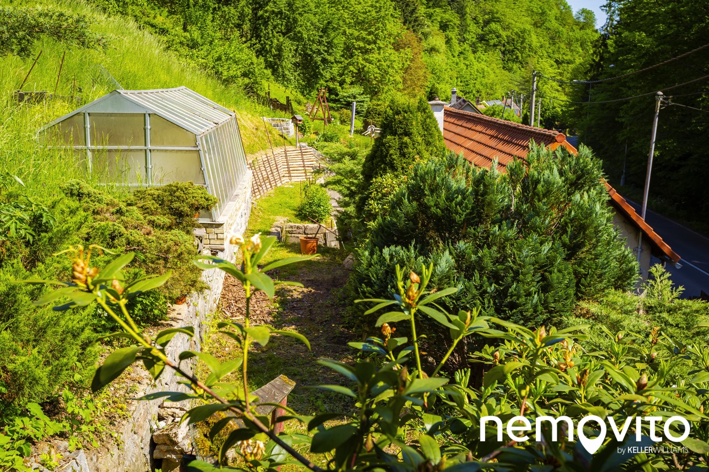 Už nyní má pozemek několik sekcí, zpevněné plochy či terasy. Do horní části pozemku se dostanete přes schody, nechybí tu ani skleník.