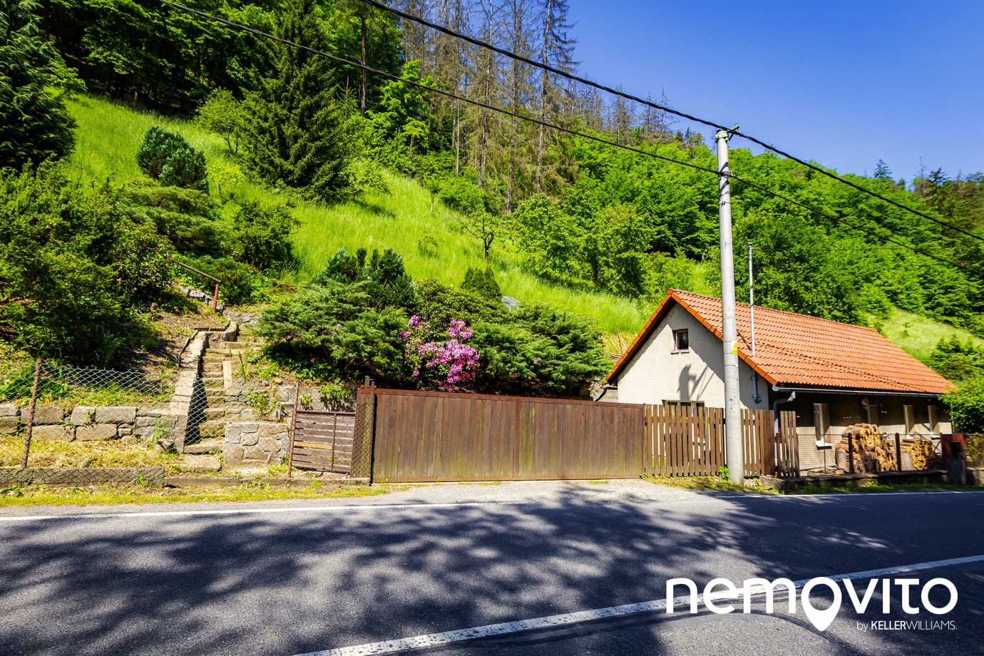 Domek se nachází přímo u tahu mezi Štěchovicemi a obcí Slapy. I z tohoto důvodu byla nedávno vyměněná okna směrem do ulice, kde jsou nyní osazená trojskla. Ta výrazně pomohla jak v hlukové, tak tepelné izolaci. Možná jste kolem něj už několikrát projížděli, aniž byste domek zaregistrovali. Svažitost pozemku je nejlépe patrná právě z těchto fotek.