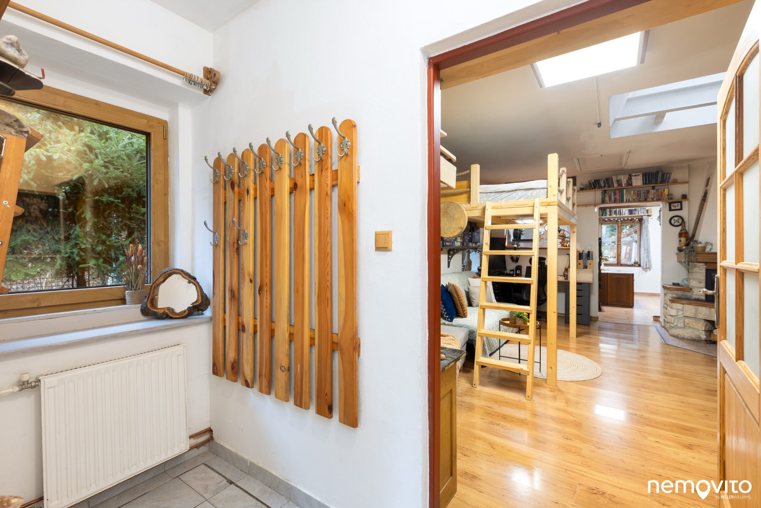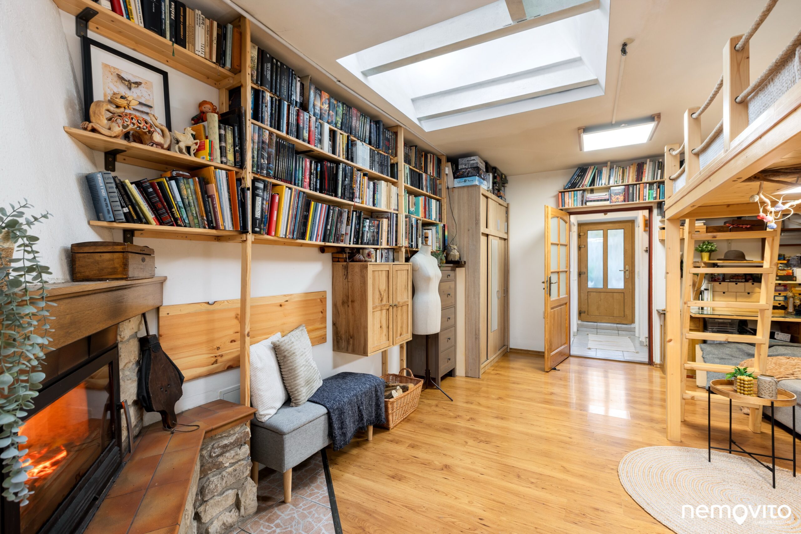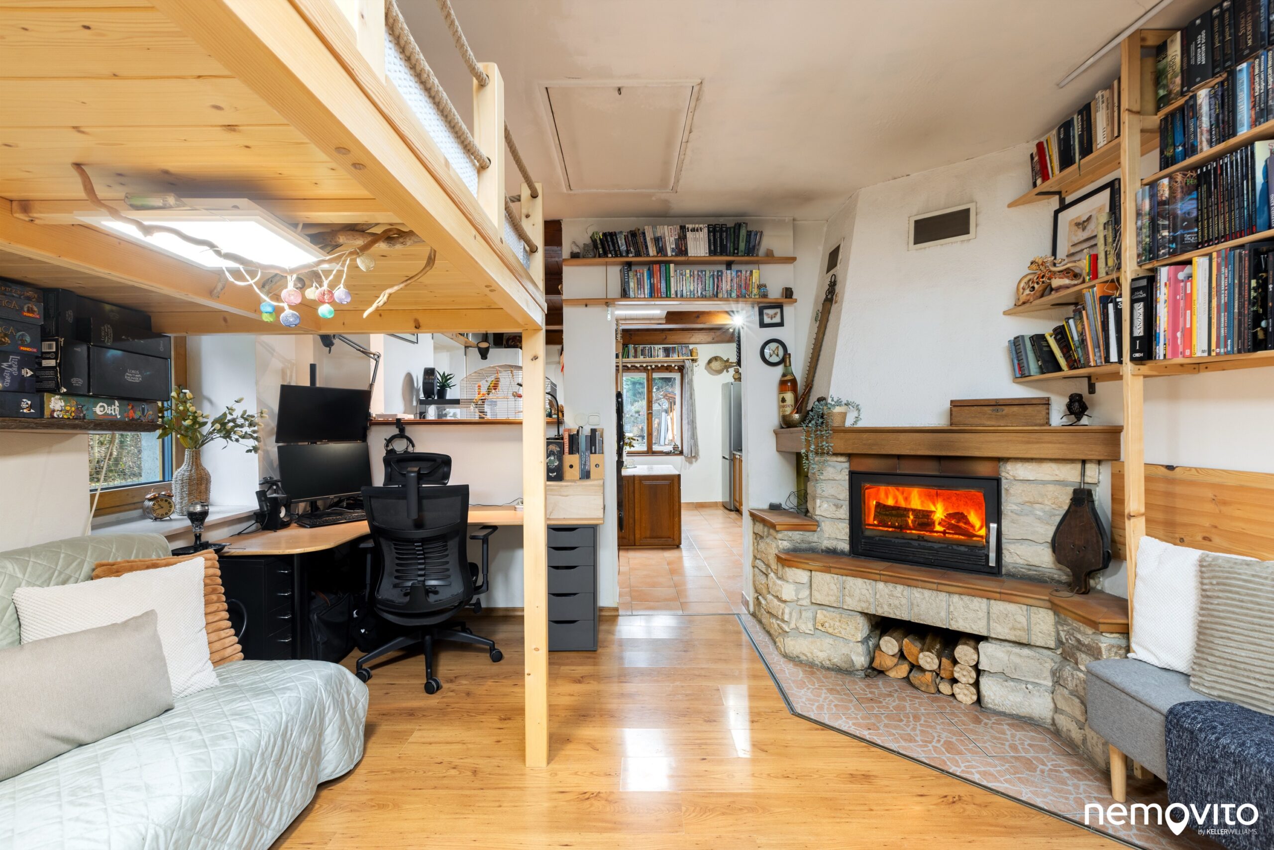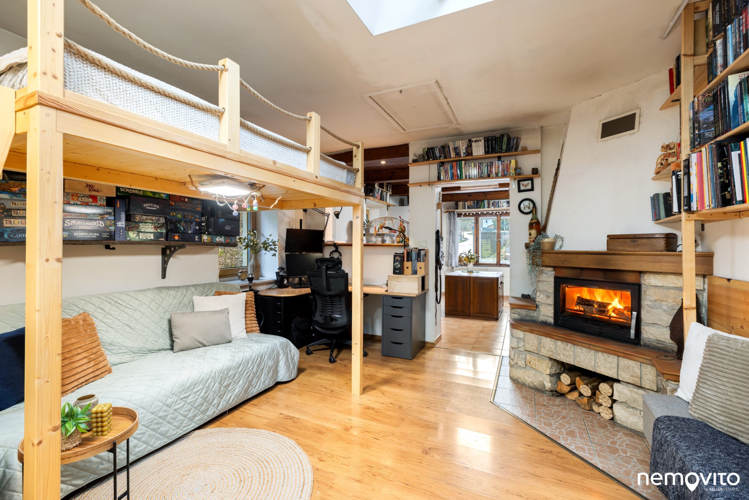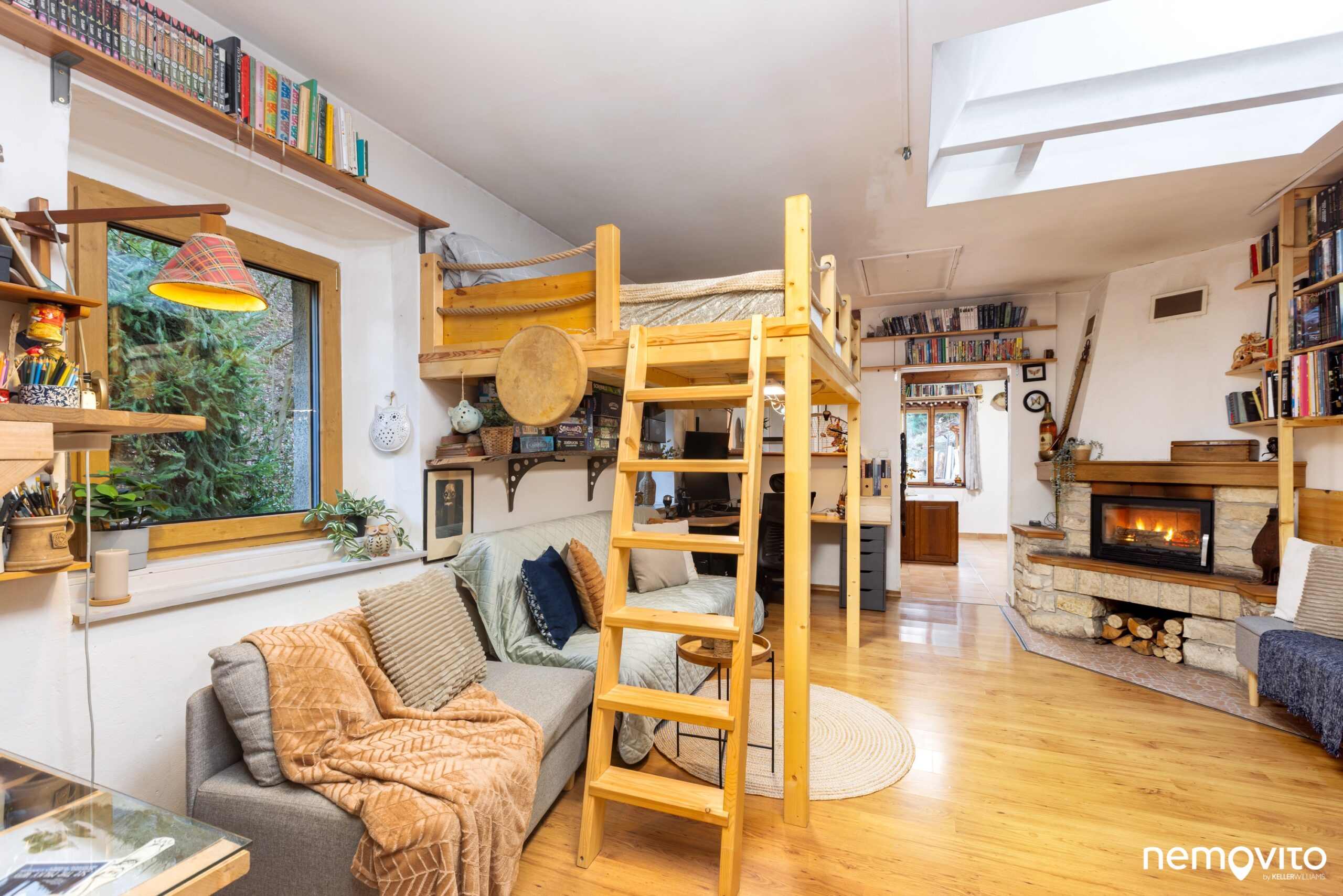 Hlavní pokoj má dostatečnou plochu na to, aby se v něm kombinovala ložnice s menším obývákem. Krbem vytopíte prostor prakticky okamžitě. Postel je nyní umístěna v rámci vestavěného patra.