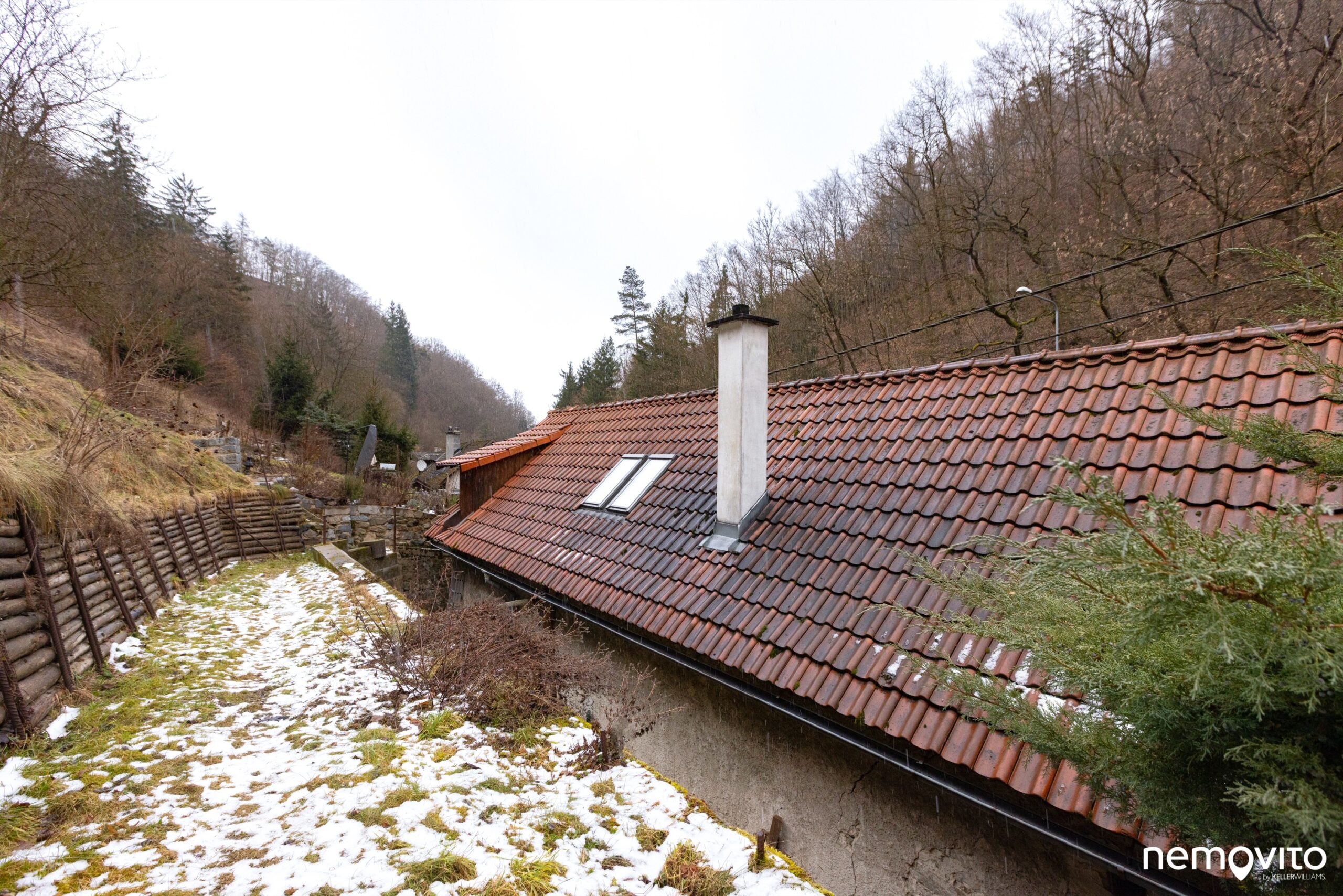 Pozemek o celkové ploše 2.261 m2 sahá od silnice až po les. Jeho terén je velmi svažitý. Ve spodní části pozemku (vlevo od domu) se nachází plocha pro parkování aut. Na této fotce nám chybí ještě poslední novinka - dvě nová střešní okna.