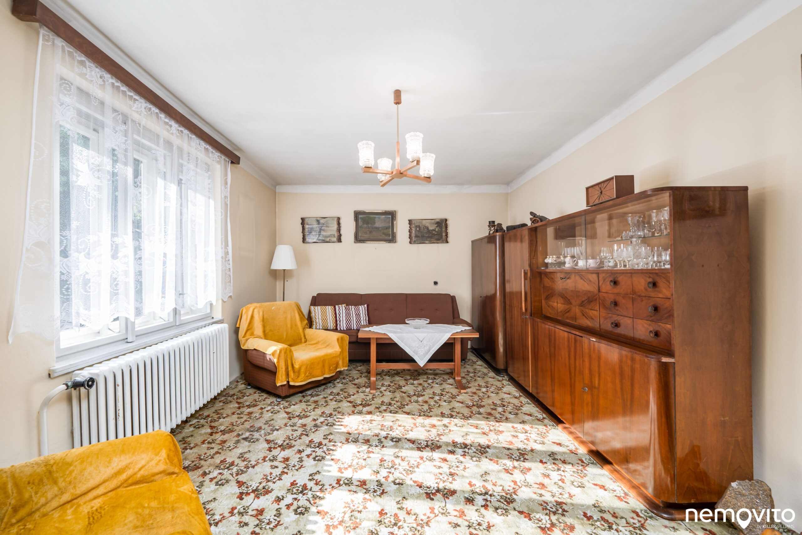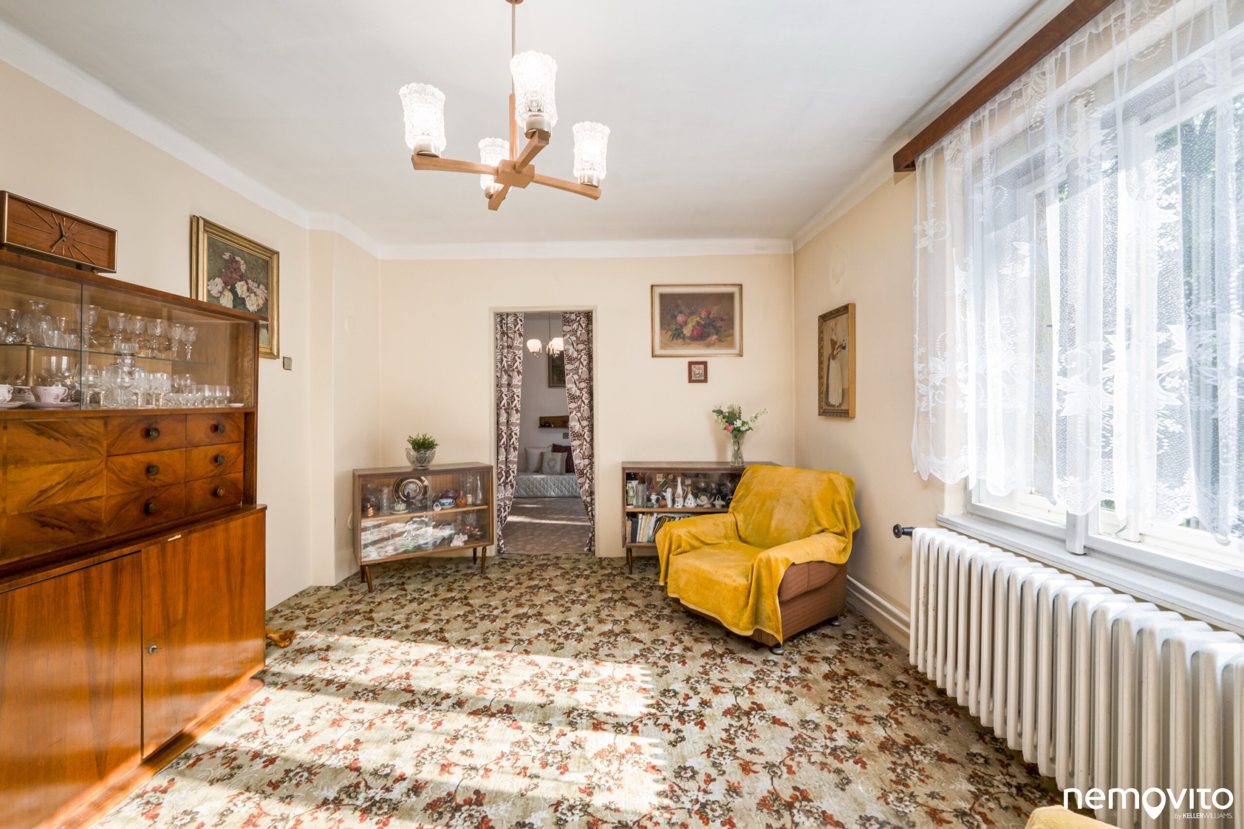 Jako u babičky 🙂 Největší místností horního bytu je tento 19 m2 pokoj, kde je cítit silný závan nostalgie.