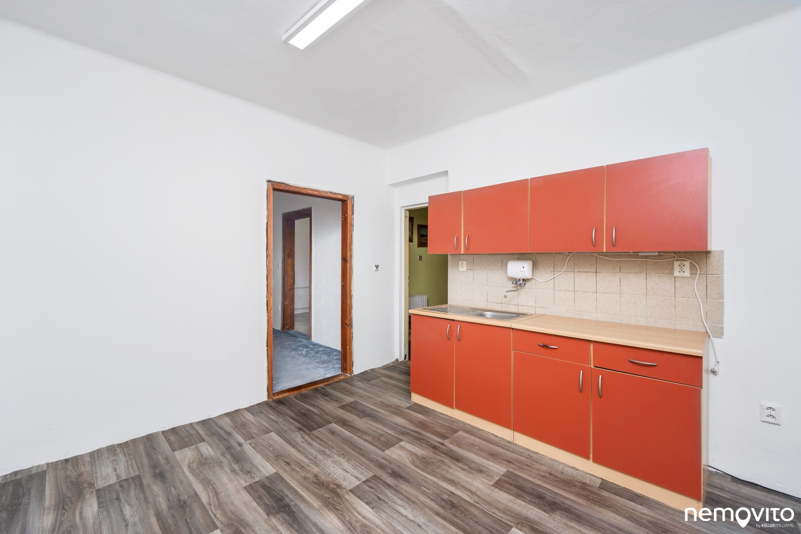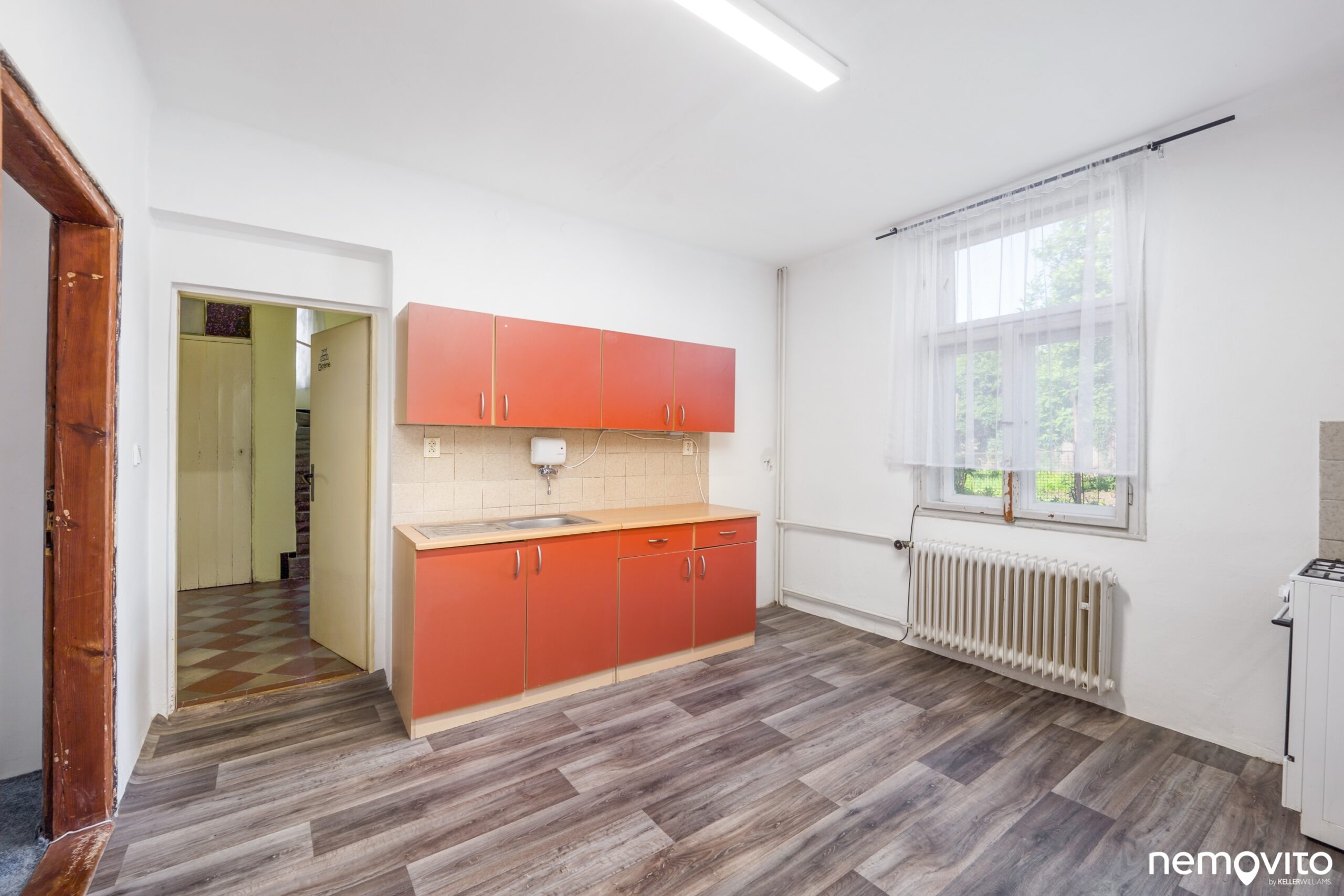 Ve spodním bytě, která má dispozici 2+1 a plochu 70 m5 (vč. chodby), se ještě donedávna bydlelo. První vstupní místností je kuchyně o velikosti 13 m2, která má okno směrem na zahradu.