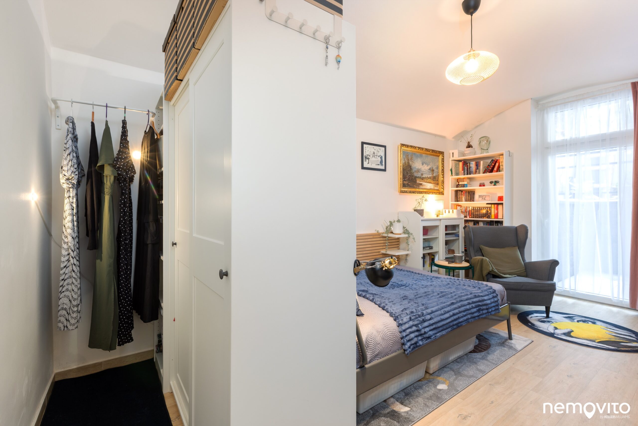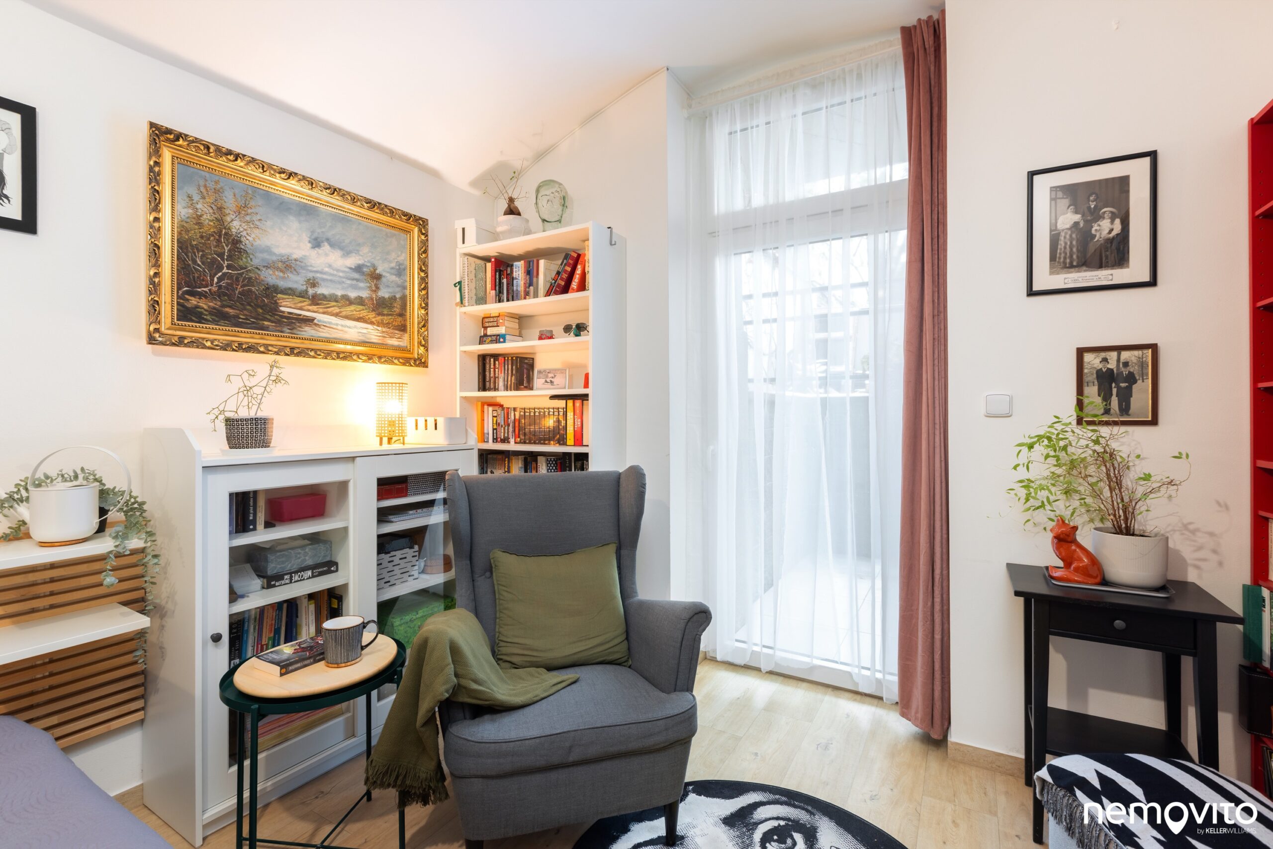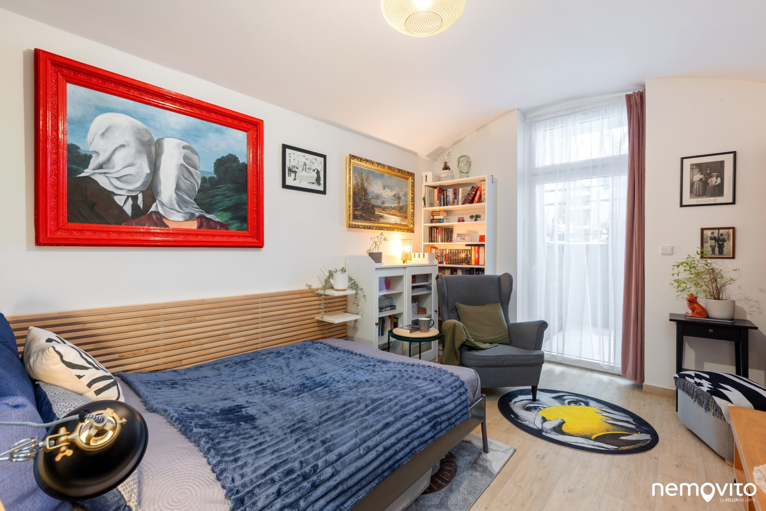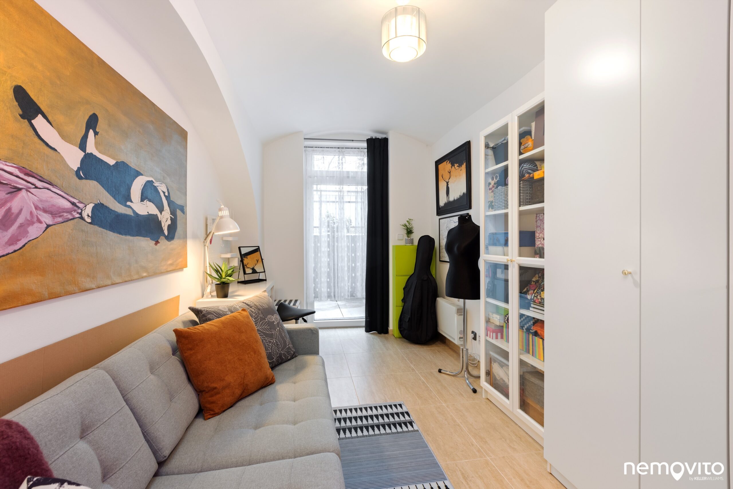 Stejně jako vedle, i tady je vysoké okno s dveřmi na terasu. Na druhé fotce vpravo můžete vidět elektrický konvektor, kterým se v bytě vytápí.