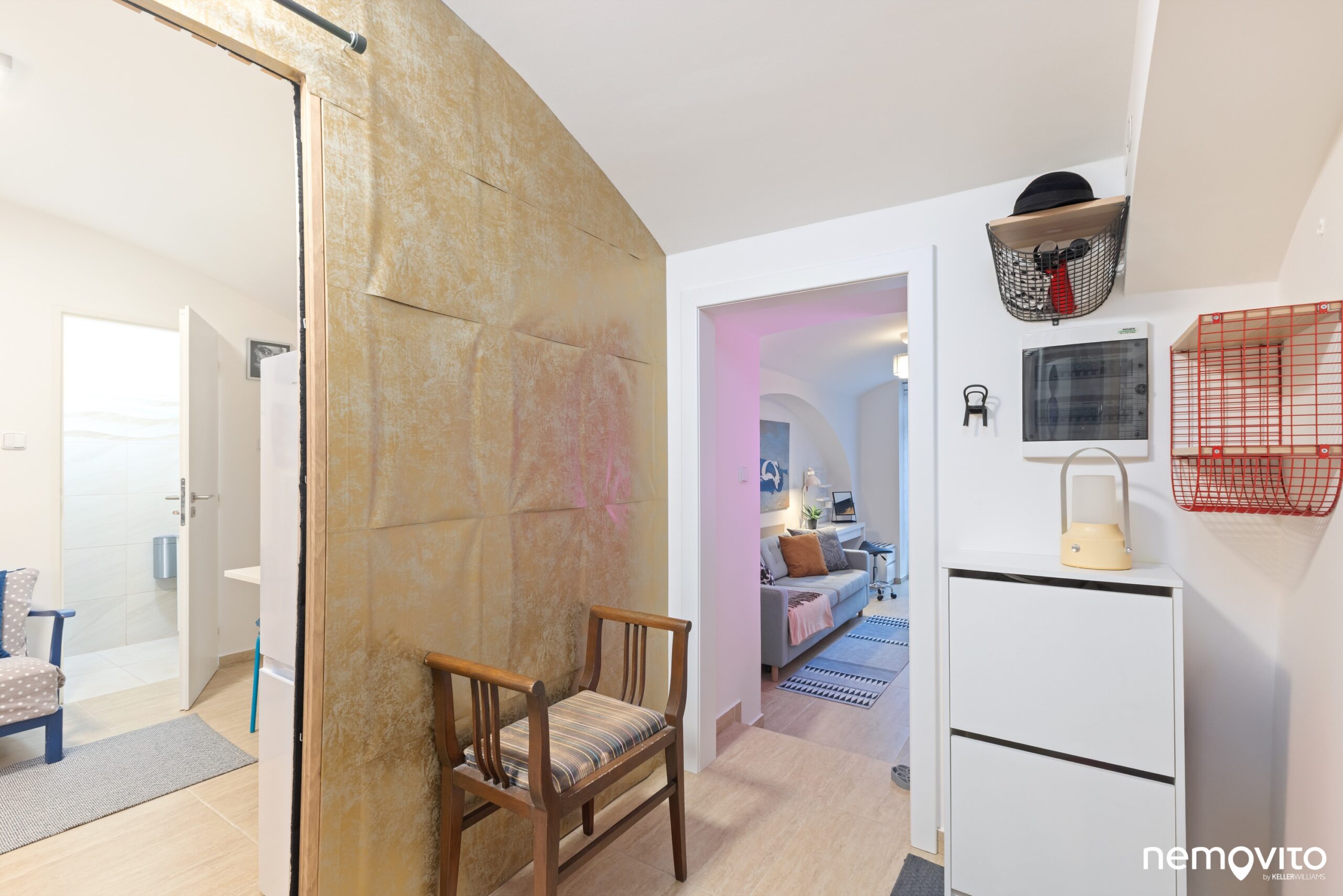 Pokud by vám příčka nevyhovovala, můžete ji velmi rychle odstranit, nicméně nápad je to skvělý. V ateliéru tak vzniklo vstupní zádveří.