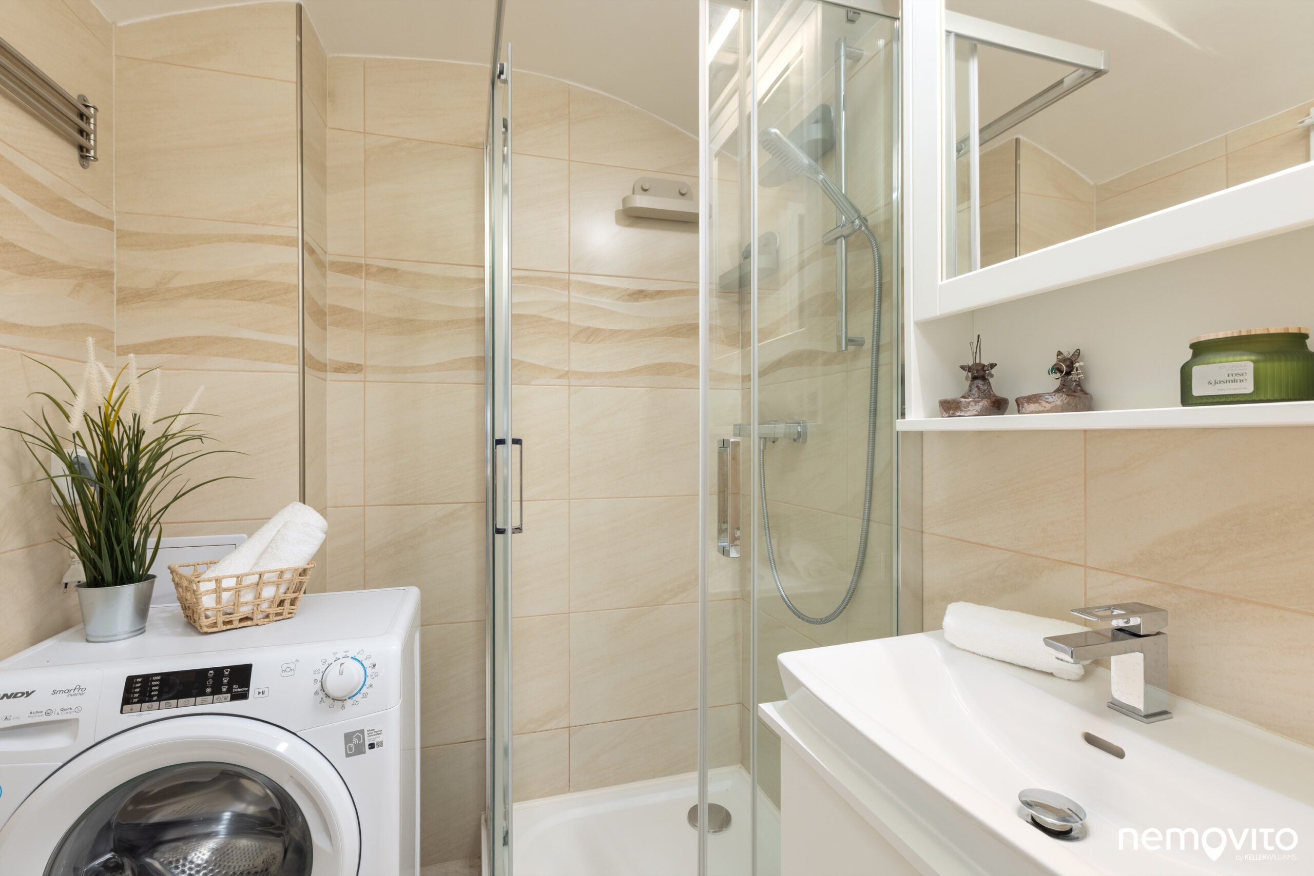 Koupelna je plochou úsporná, ale vejde se do ní všechno potřebné. Sprcha, místo na pračku. Bojler je umístěný na WC. Velkoformátové obklady jsou decentní.