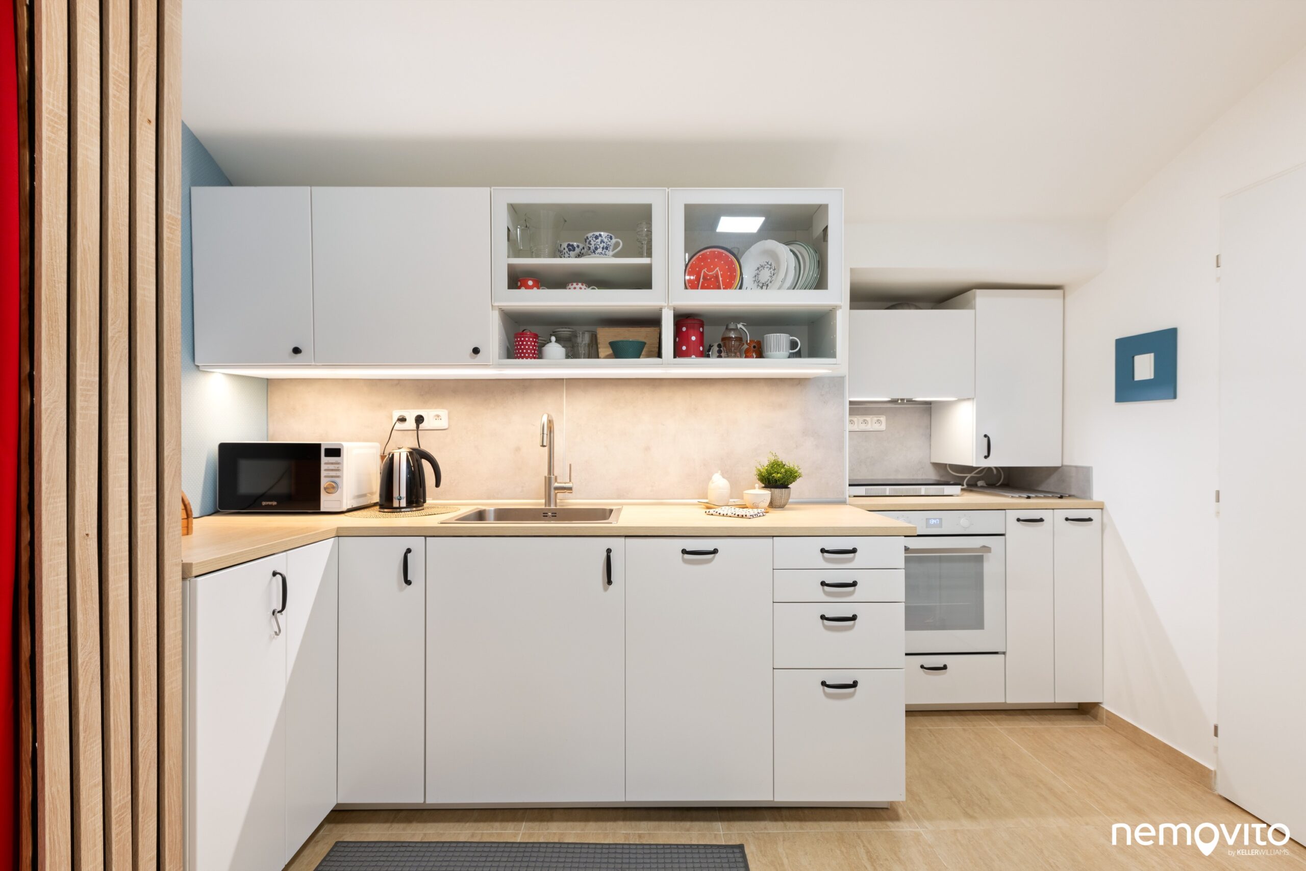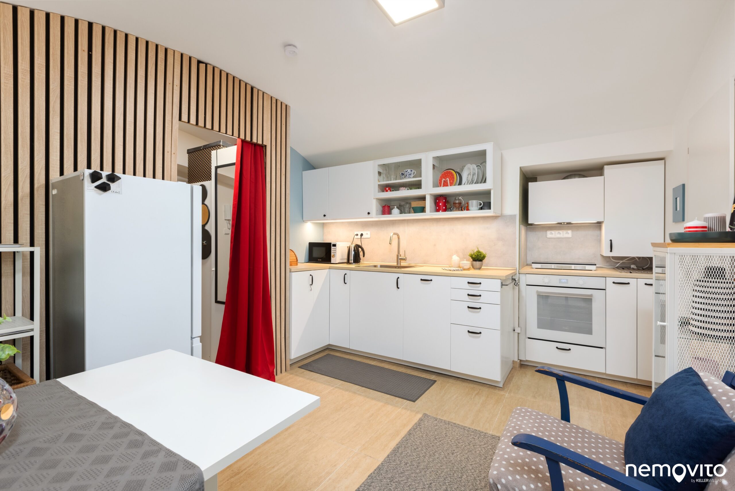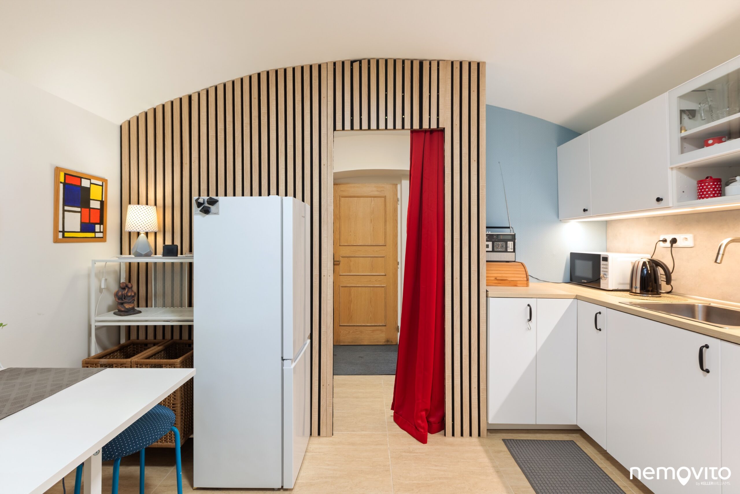 Kuchyně byla původně jeden velký otevřený prostor, vytvořením příčky (u červeného závěsu) došlo k oddělení vstupní části. Kuchyně má dvě části, ta s troubou je vsunutá do výklenku.