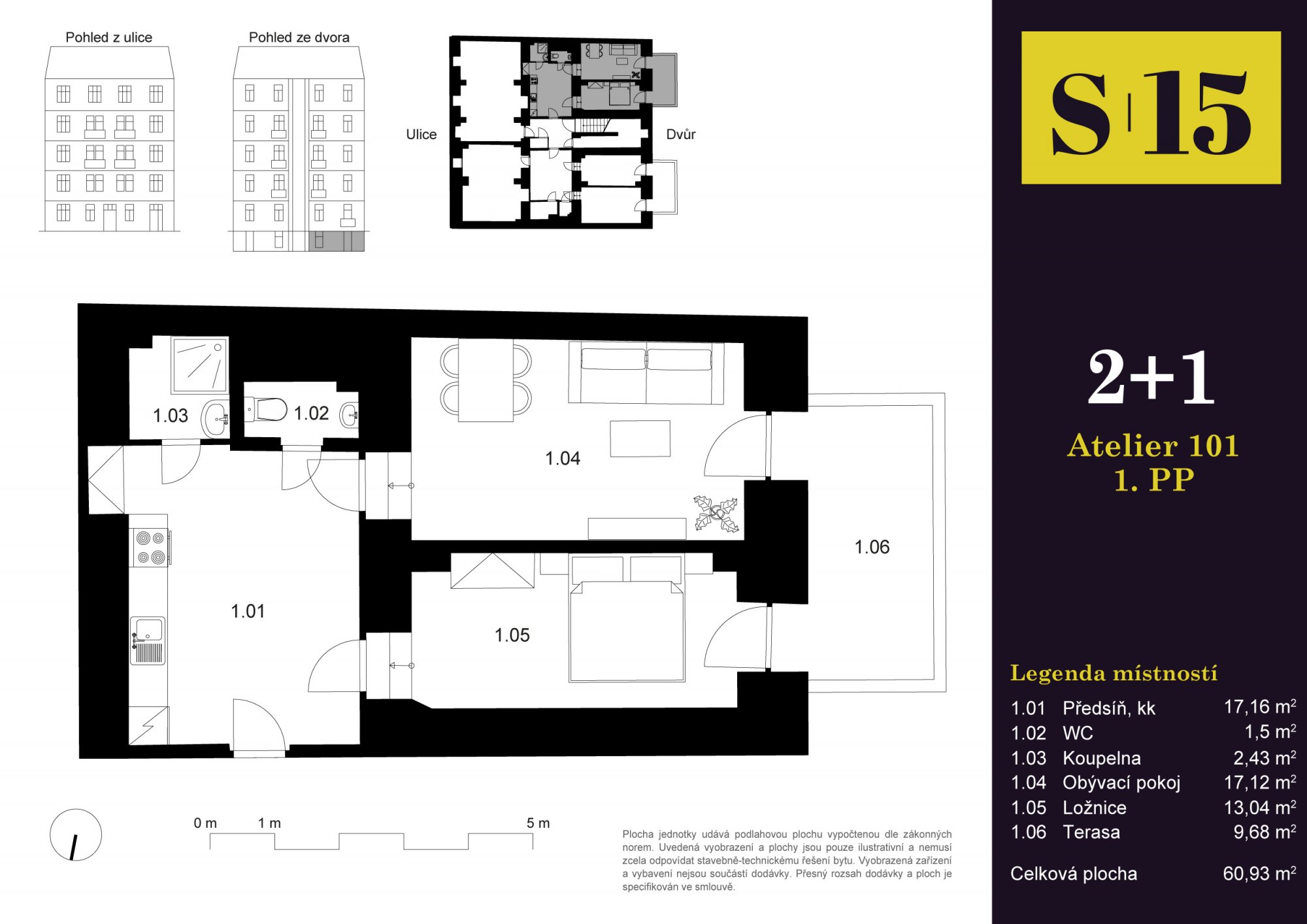 Dispozice 2+1 | O půl podlaží pod úrovní dvora