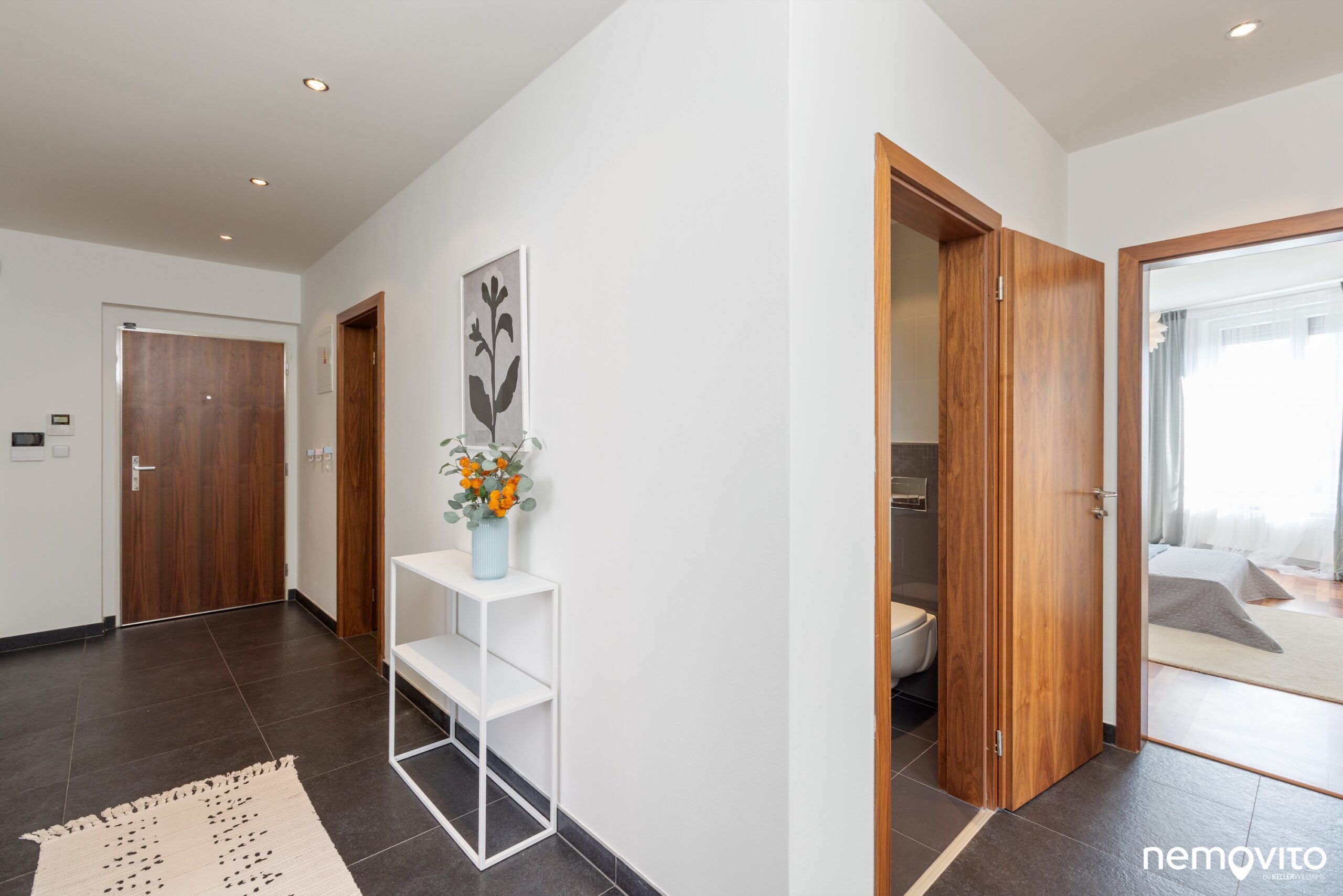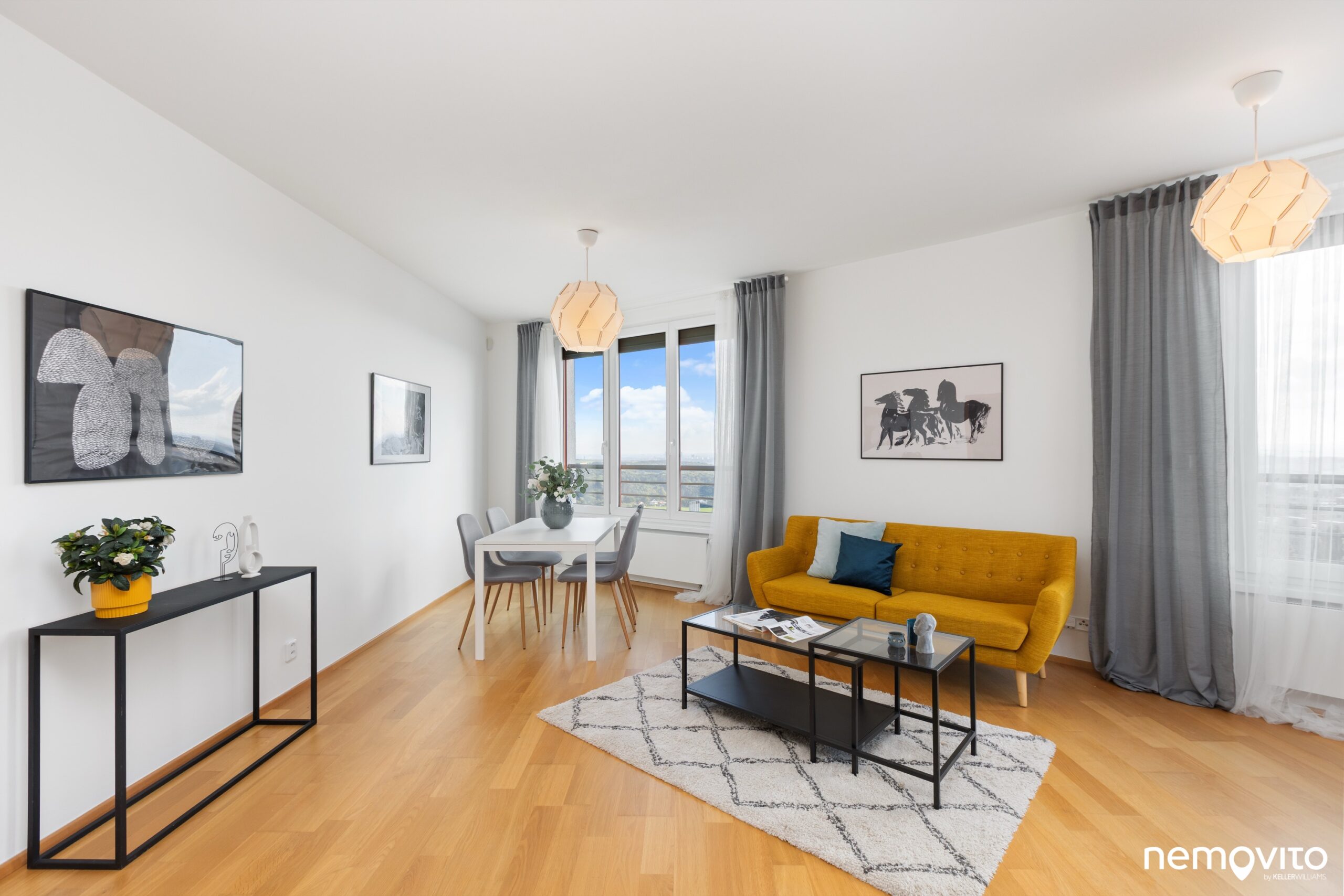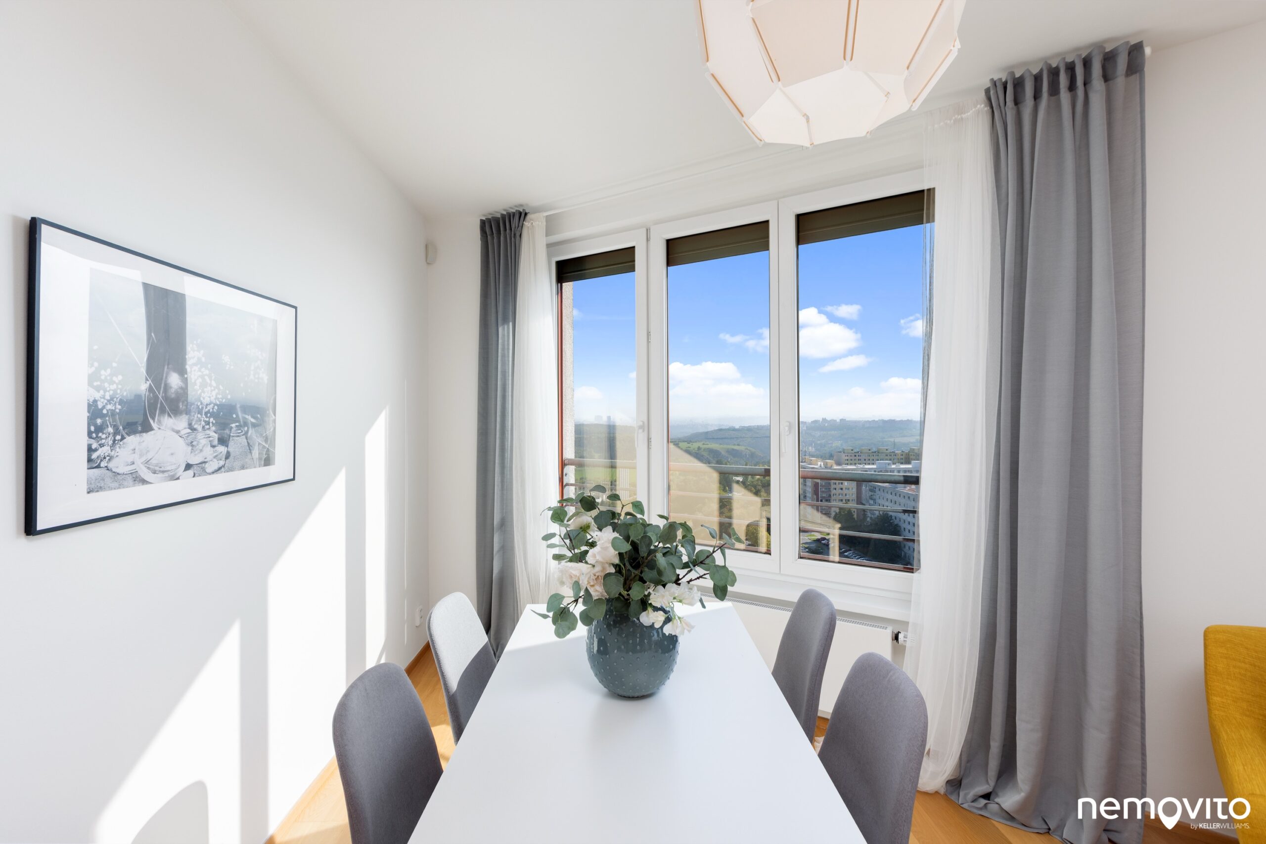 Obyčejné 3+kk vám nestačí. Chcete víc místa. A to nejen v bytě, ale i tak nějak kolem sebe. Ideálně také balkon, sklep a dvě stání pro auta. Řešením vaší situace může být tento více než 90 metrový byt v sedmnáctém podlaží projektu Prague Towers. Naprosto fantastický výhled kolem dokola, se skvělou orientací východ-jih-západ, a ve zcela nevídaném stavu. Projekt, jehož realizaci v roce 2011 dokončila společnost Central Group, stále patří mezi jedny z nejvyšších rezidenčních budov v rámci Čech. Umístěna je pouze pár set metrů od zeleně, která plynule přechází v Prokopské údolí. Poloha domu na kraji jedné z největších pražských zelených ploch je sama o sobě příznivá, co ale teprve z té výšky.
