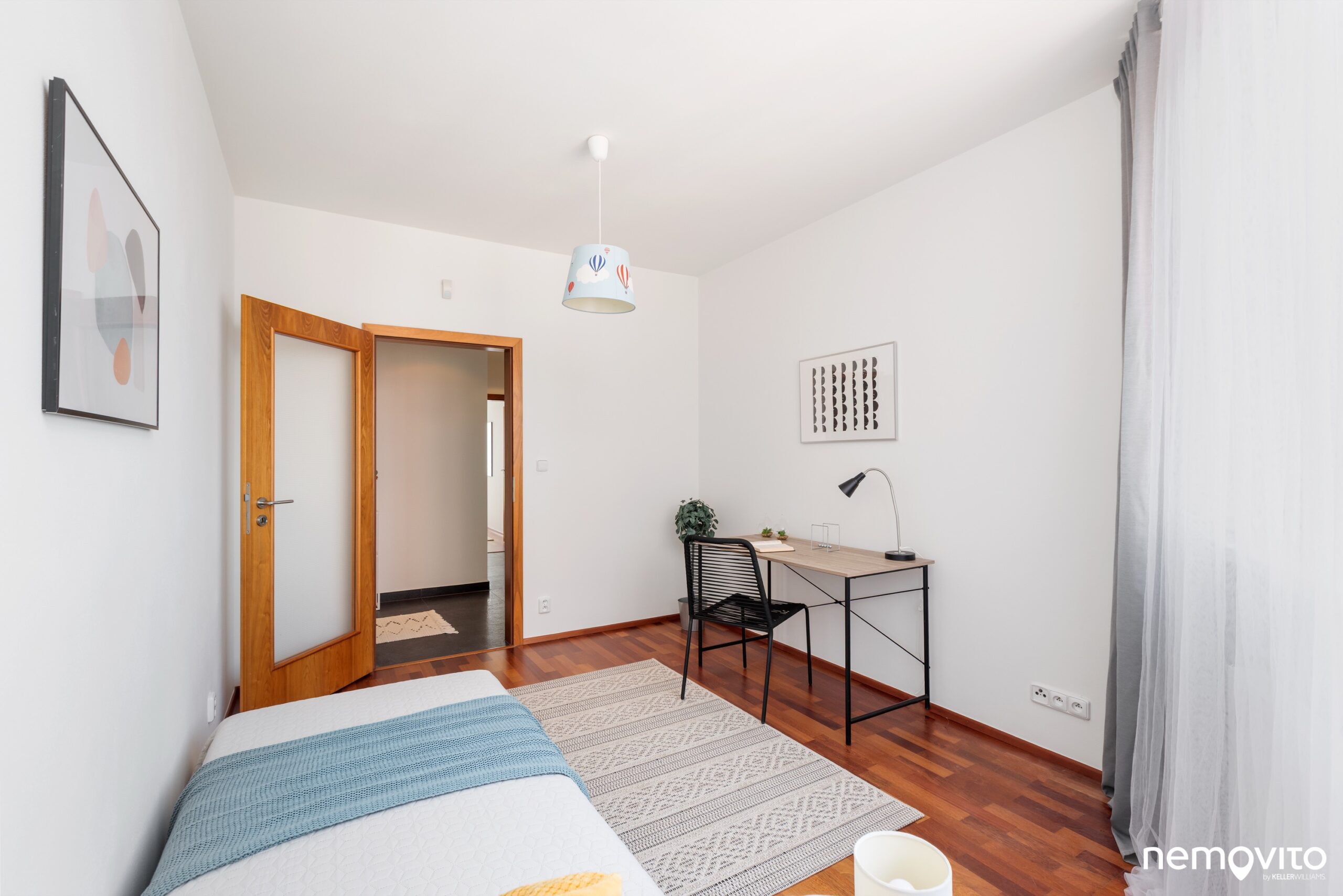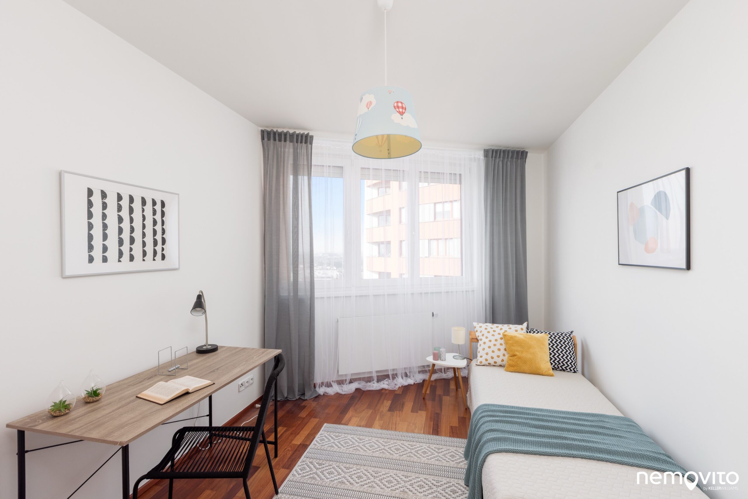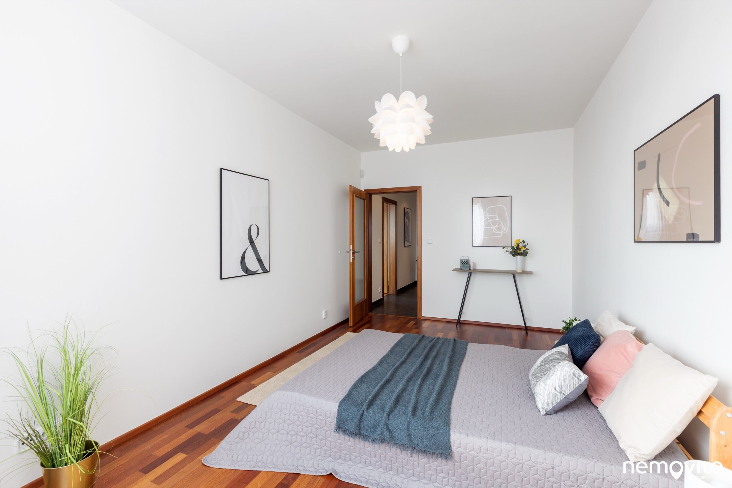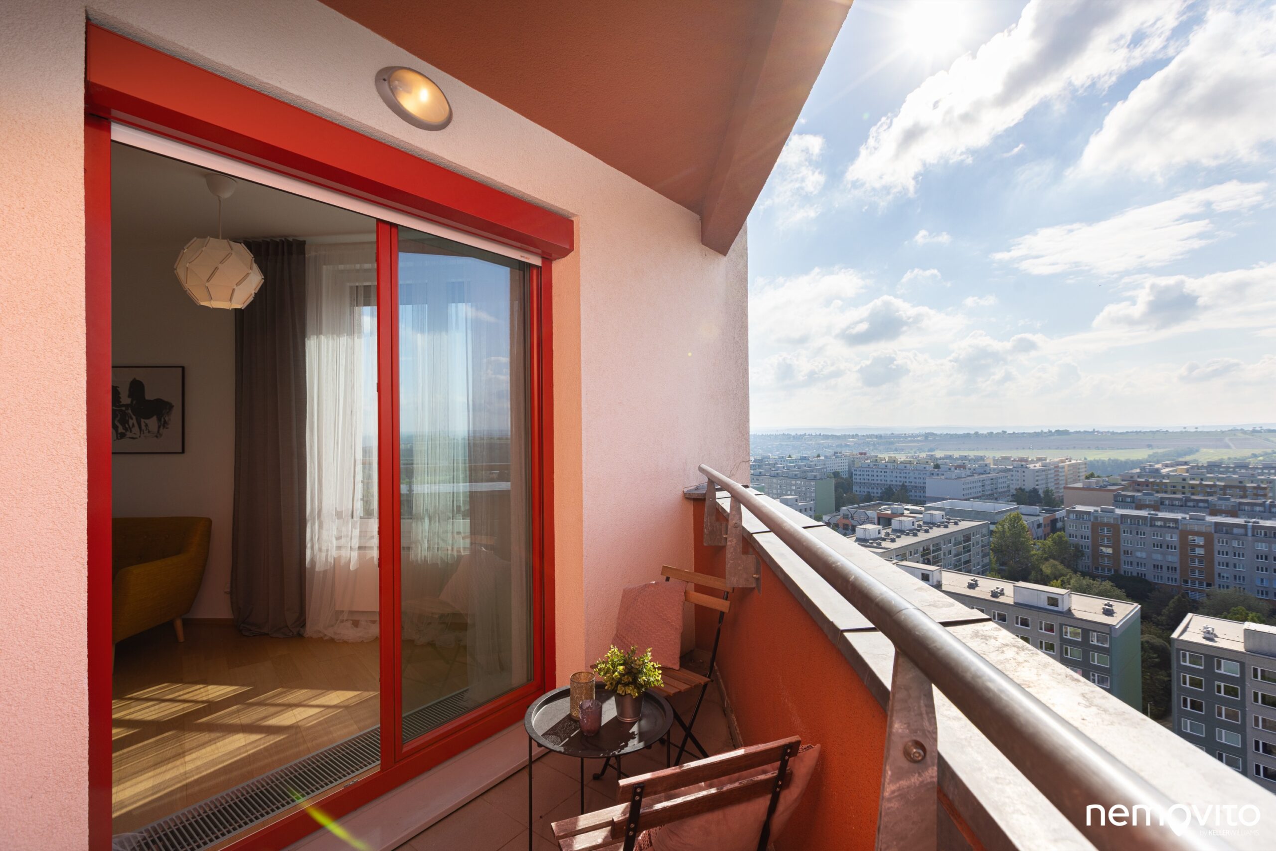 Ačkoliv má byt za sebou 15 let, na jeho stavu byste to rozhodně nepoznali. A není to náhodou, byl totiž obydlen pouhé 2 roky a byl řešen ve výrazně vyšším standardu, než byla developerská klasika. Velkoformátová dlažba a nadčasové barevné řešení kuchyně nebo koupelny napovídá spíše podstatně novějším bytům. S velkorysou plochou 93 m2 ale na rozdíl od současné výstavby, která u třípokojáků klidně operuje s plochou o 20 m2 menší, ale nebudete řešit nedostatek místa nebo miniaturní obývák. Ten má v tomto případě 36 m2, dalších 5 m2 venku na balkoně a velkoformátová okna, která navíc můžete stínit elektrickými roletami. Byt nadchne především ty, kdo chtějí slunce a světlo. Orientace obývacího pokoje je na 3 strany a ať bude venku jakkoliv, pořád bude na co koukat. No a především - v této výšce vám výhled opravdu už nikdy nic nezkazí. Tedy minimálně do doby, než bude kolem domů lítat Korben Dallas ve svém taxíku 🙂