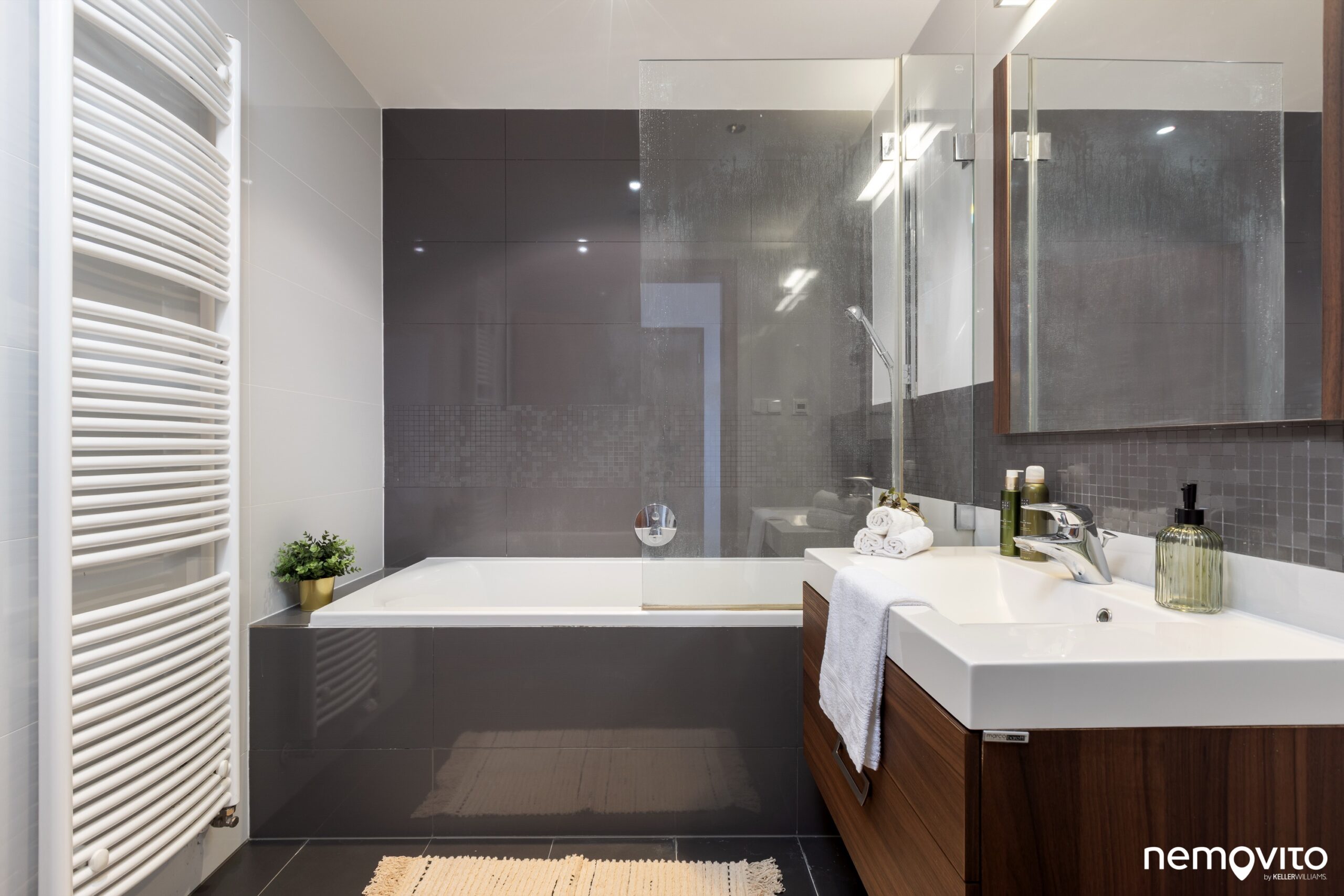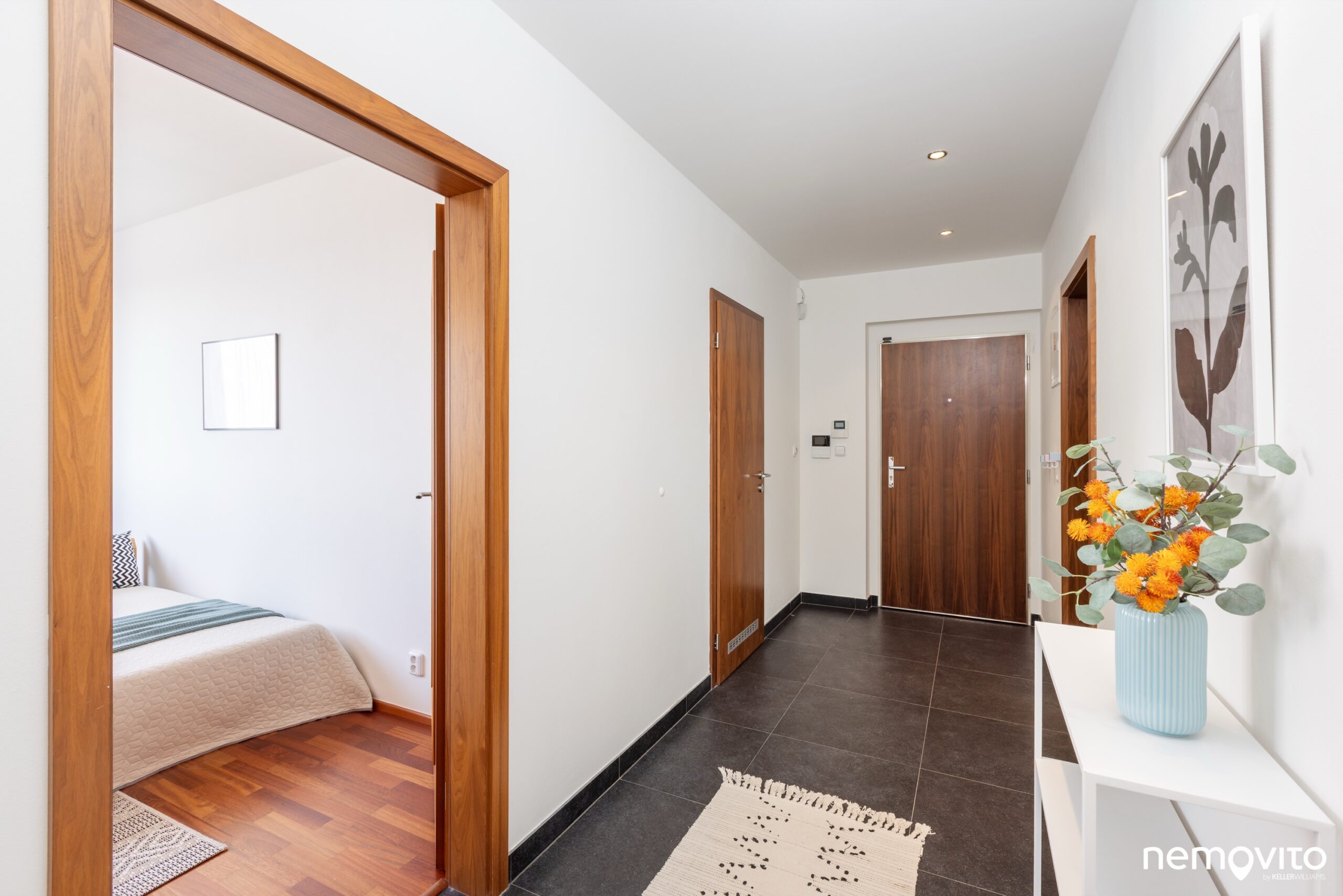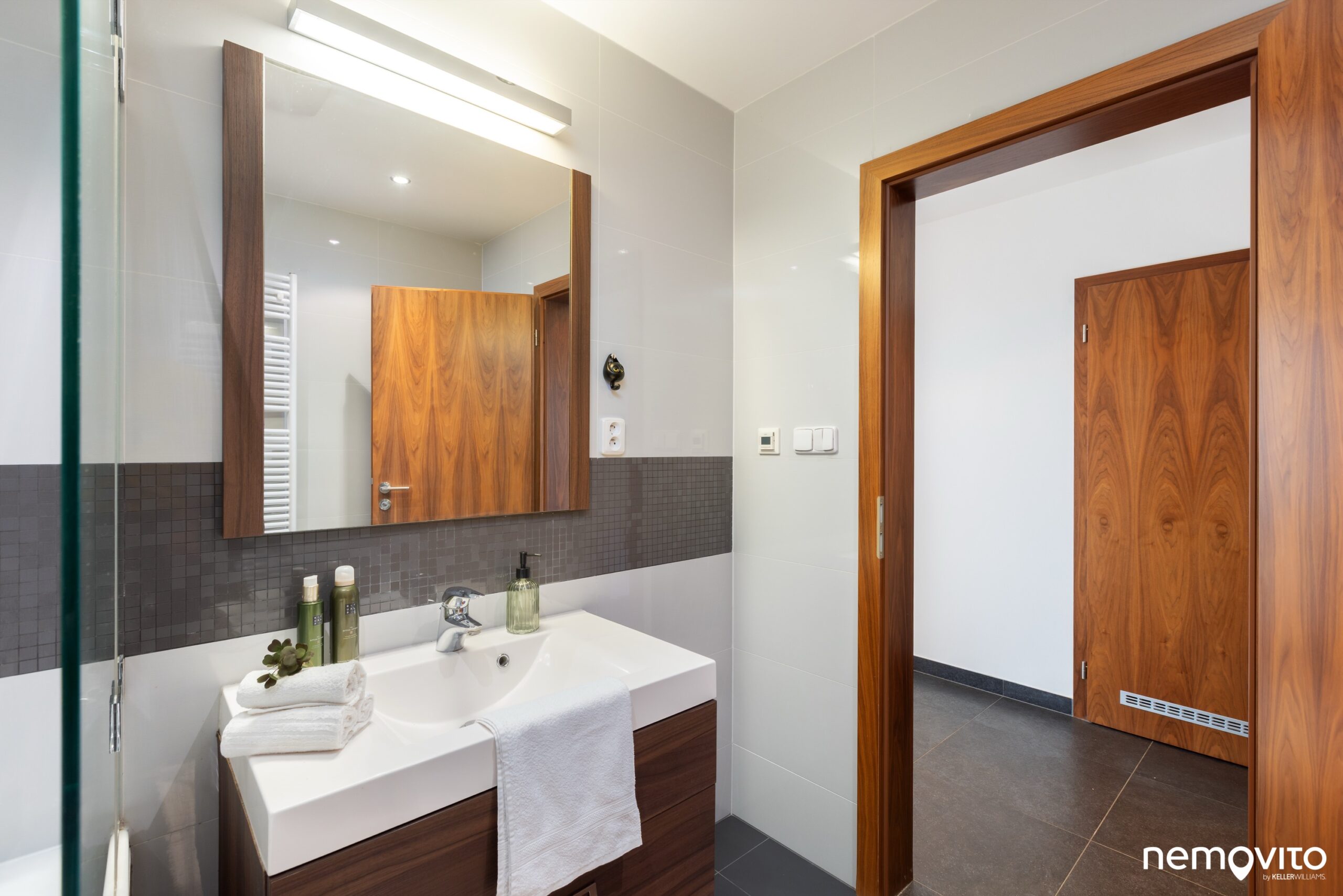 To ostatně platí také o chodbě, která je opravdu široká a umožňuje umístění řady skříní. Koupelna svůj věk skutečně neprozradí (2011), nicméně dáno je to pochopitelně tím, že byt byl řešen v úplně jiném standardu, než byla běžná dodávka developera. V koupelně je také elektrické podlahové topení. Vkusně zvolené barvy a materiály čas už prověřil a vydrží ještě dlouho. Investovat do vybombardování oranžových kachliček vážně nemusíte.