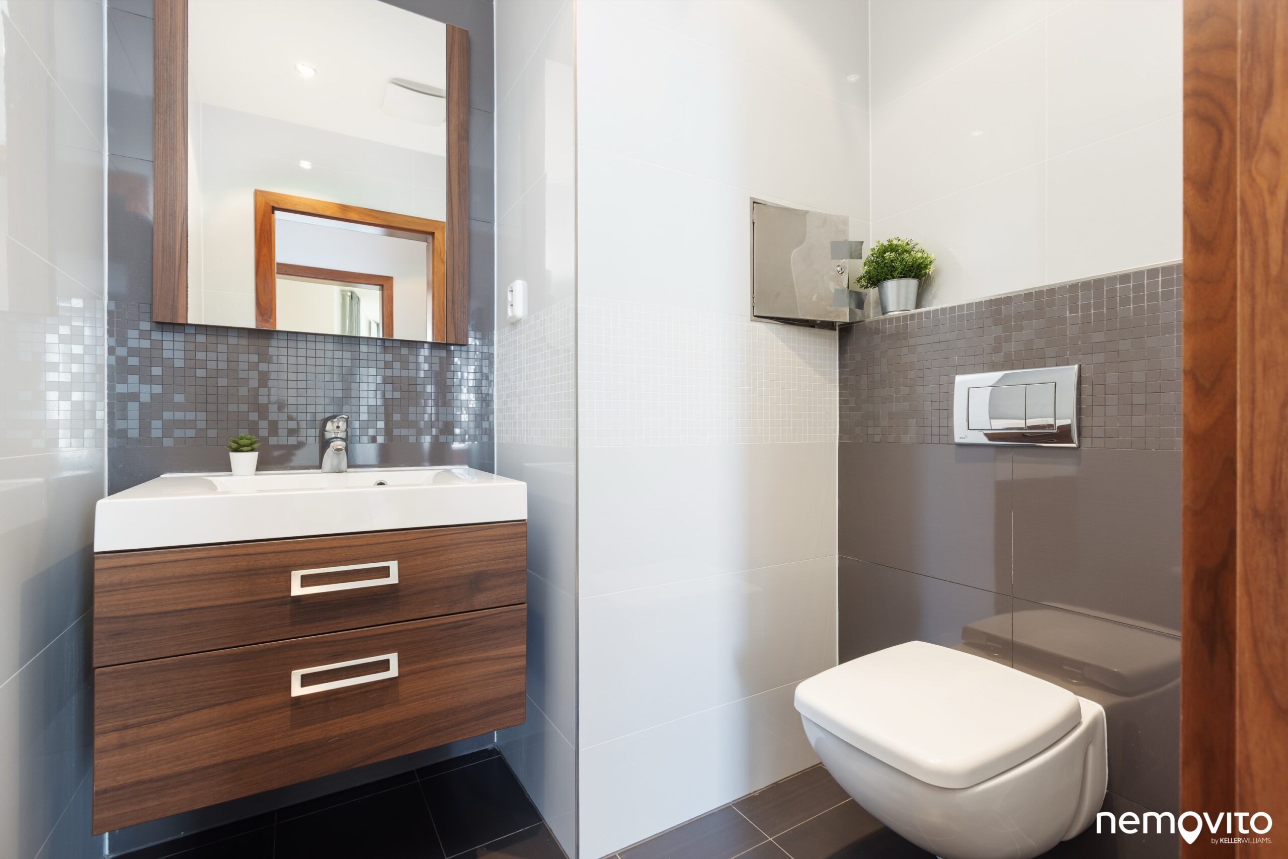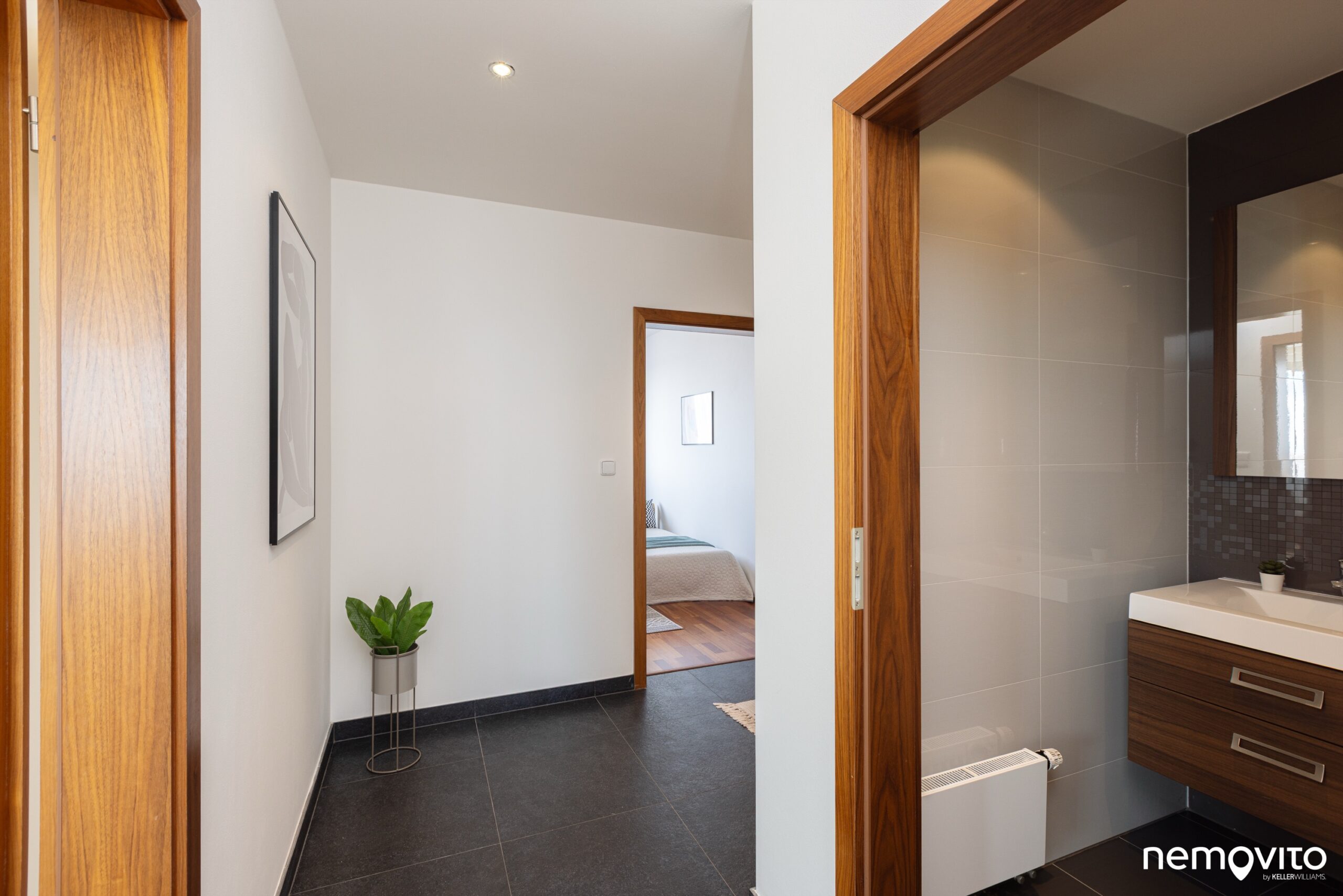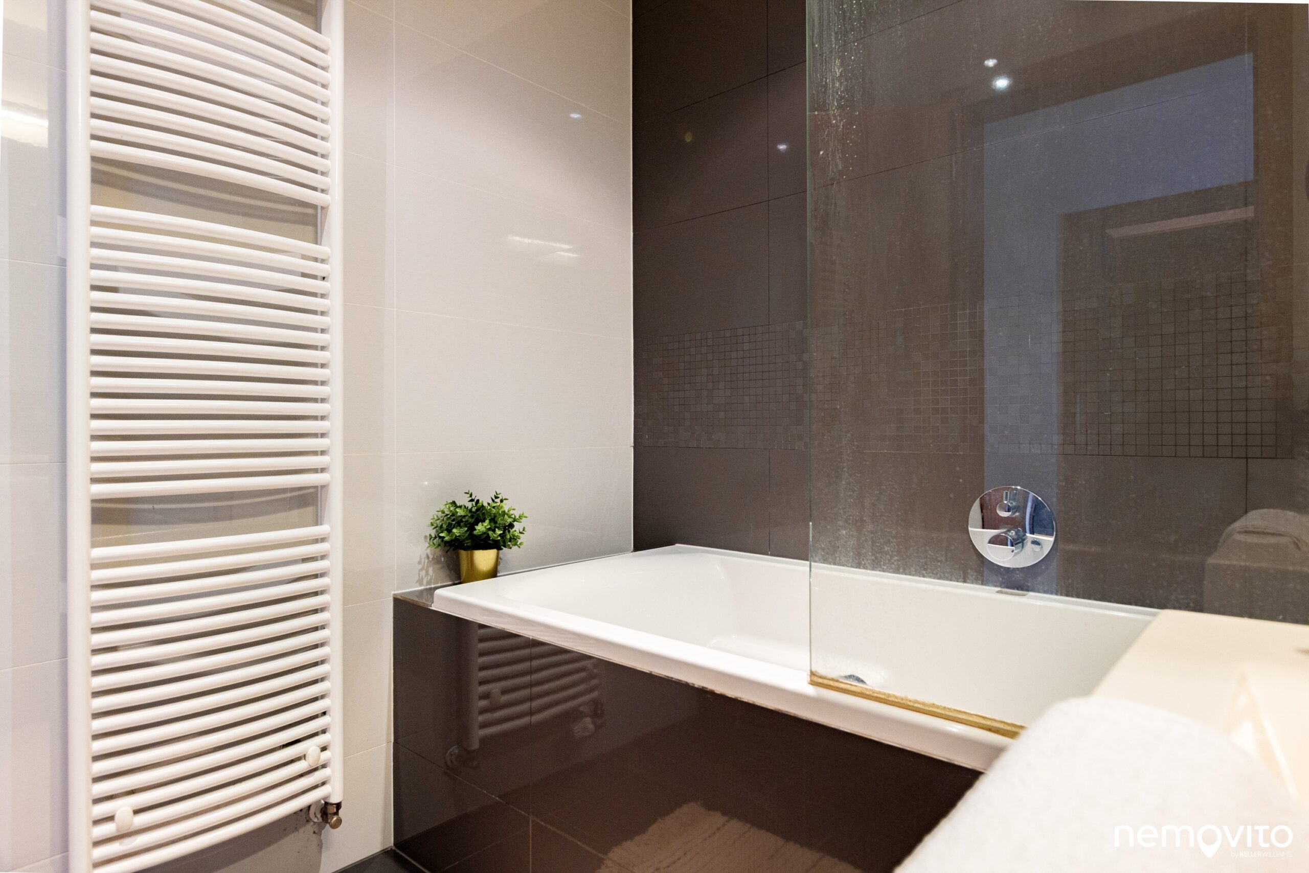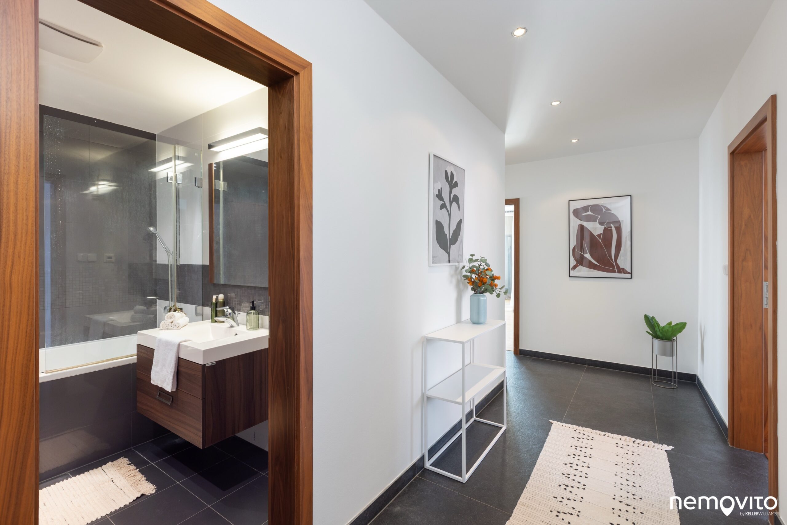 To ostatně platí také o chodbě, která je opravdu široká a umožňuje umístění řady skříní. Koupelna svůj věk skutečně neprozradí (2011), nicméně dáno je to pochopitelně tím, že byt byl řešen v úplně jiném standardu, než byla běžná dodávka developera. V koupelně je také elektrické podlahové topení. Vkusně zvolené barvy a materiály čas už prověřil a vydrží ještě dlouho. Investovat do vybombardování oranžových kachliček vážně nemusíte.