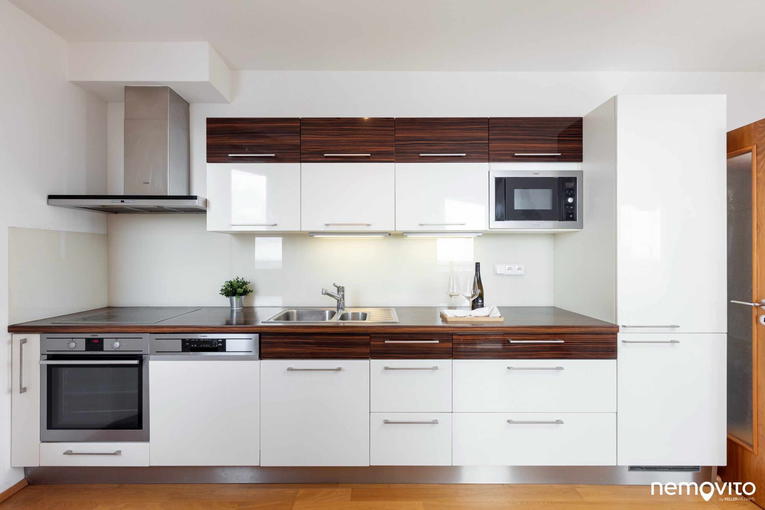 V kuchyni nechybí veškeré vestavěné spotřebiče a rovněž dveře s výstupem na balkon. Světla je tady skutečně mnoho.