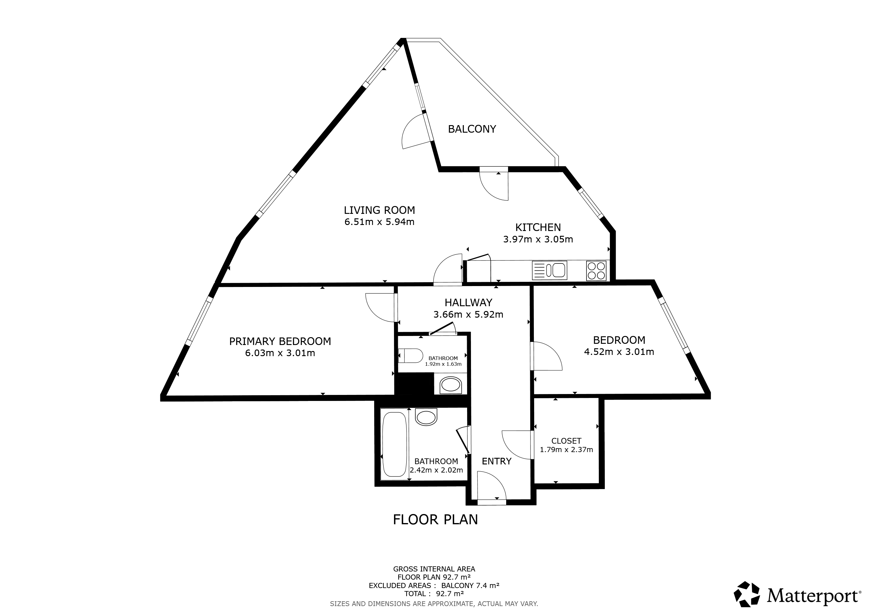 Balkon má plochu 5 m2 a půdorys tvaru trojúhelníku. Je orientovaný na jihozápad, byt je totiž umístěn v jižním cípu budovy.