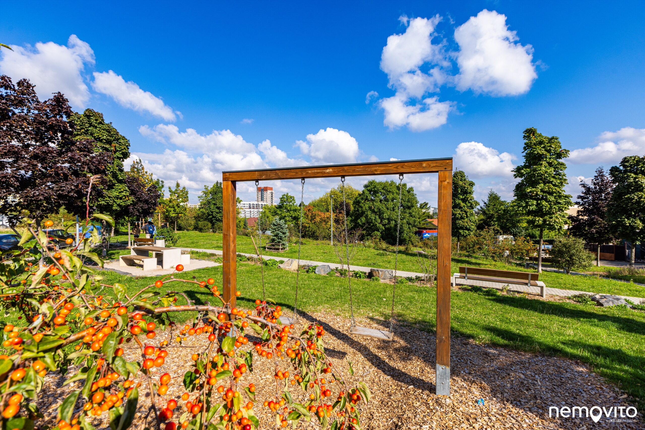 Zastávka autobusu je doslova pár kroků. Paneláky naproti se vám sice líbit nemusí, ale má to jednu naprosto zásadní výhodu. Sídliště jsou dnes již plně etablovaná, plná zeleně, vybavenosti a také hřišť. Ten, kdo někdy navštívil nový projekt uprostřed pole, těmto řádkům rozumí.
