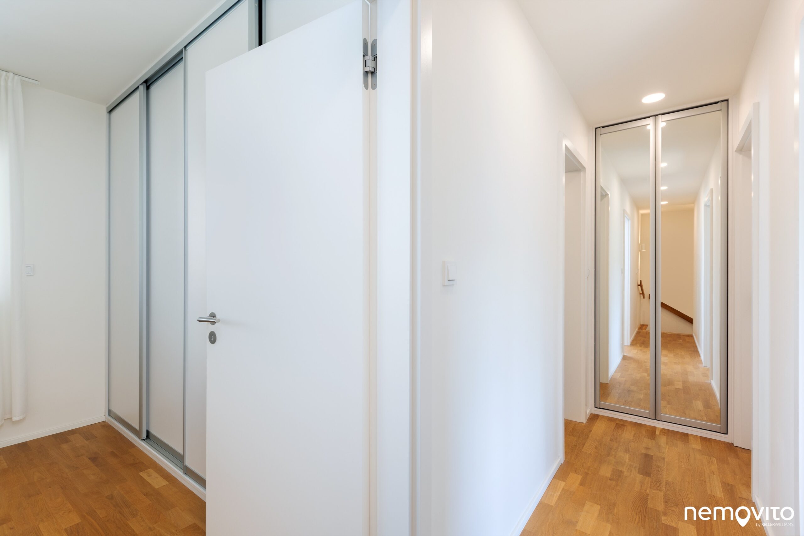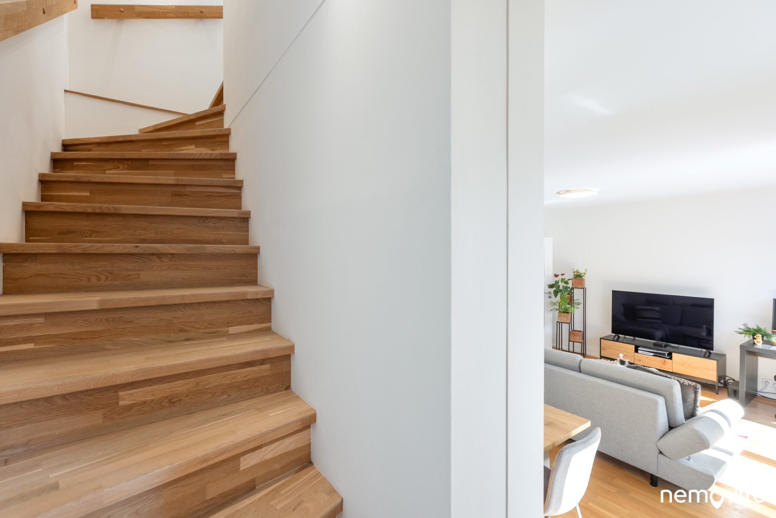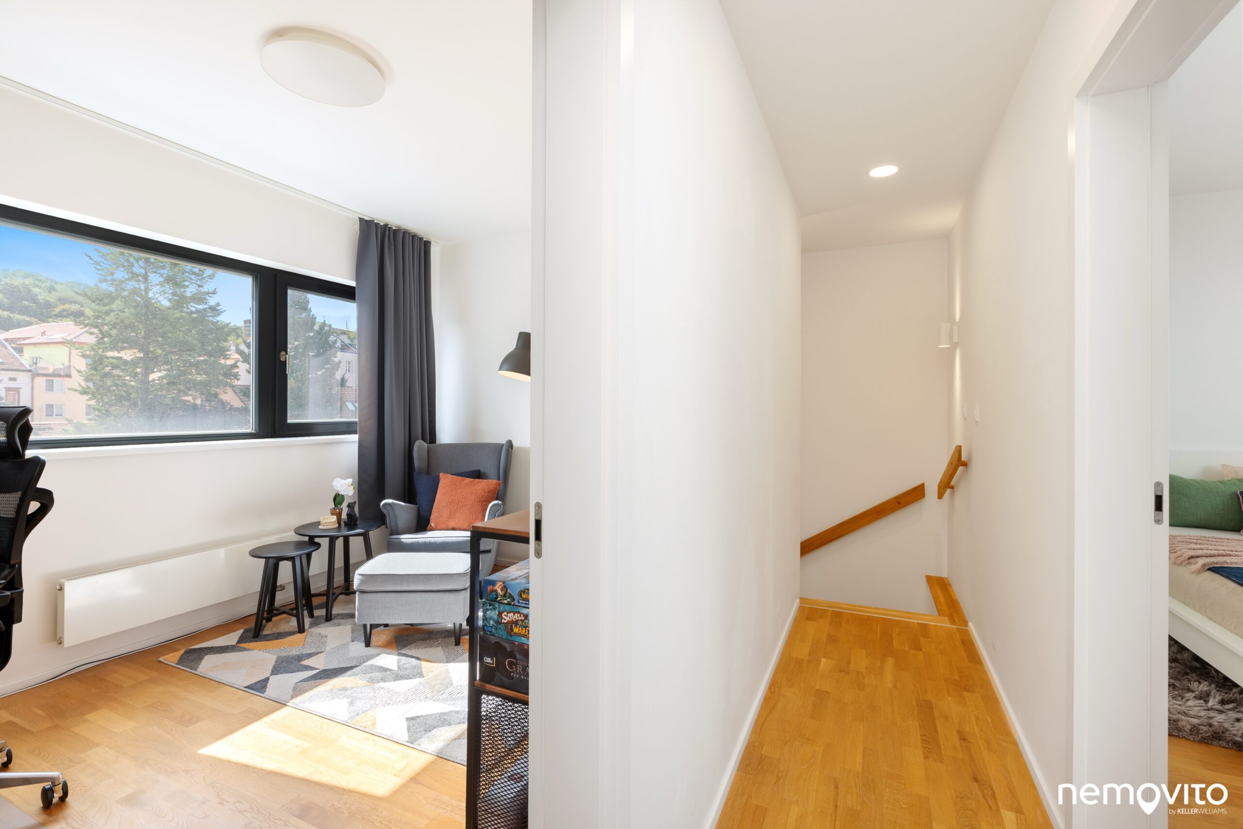 Soukromá zóna bytu s ložnicemi je prakticky oddělená a vaše návštěvy tak mohou strávit příjemný čas dole, aniž byste se museli strachovat o rozházené ponožky kolem postele. Pokud byste chtěli schodiště oddělit, jednoduché řešení skýtají například posuvné dveře.