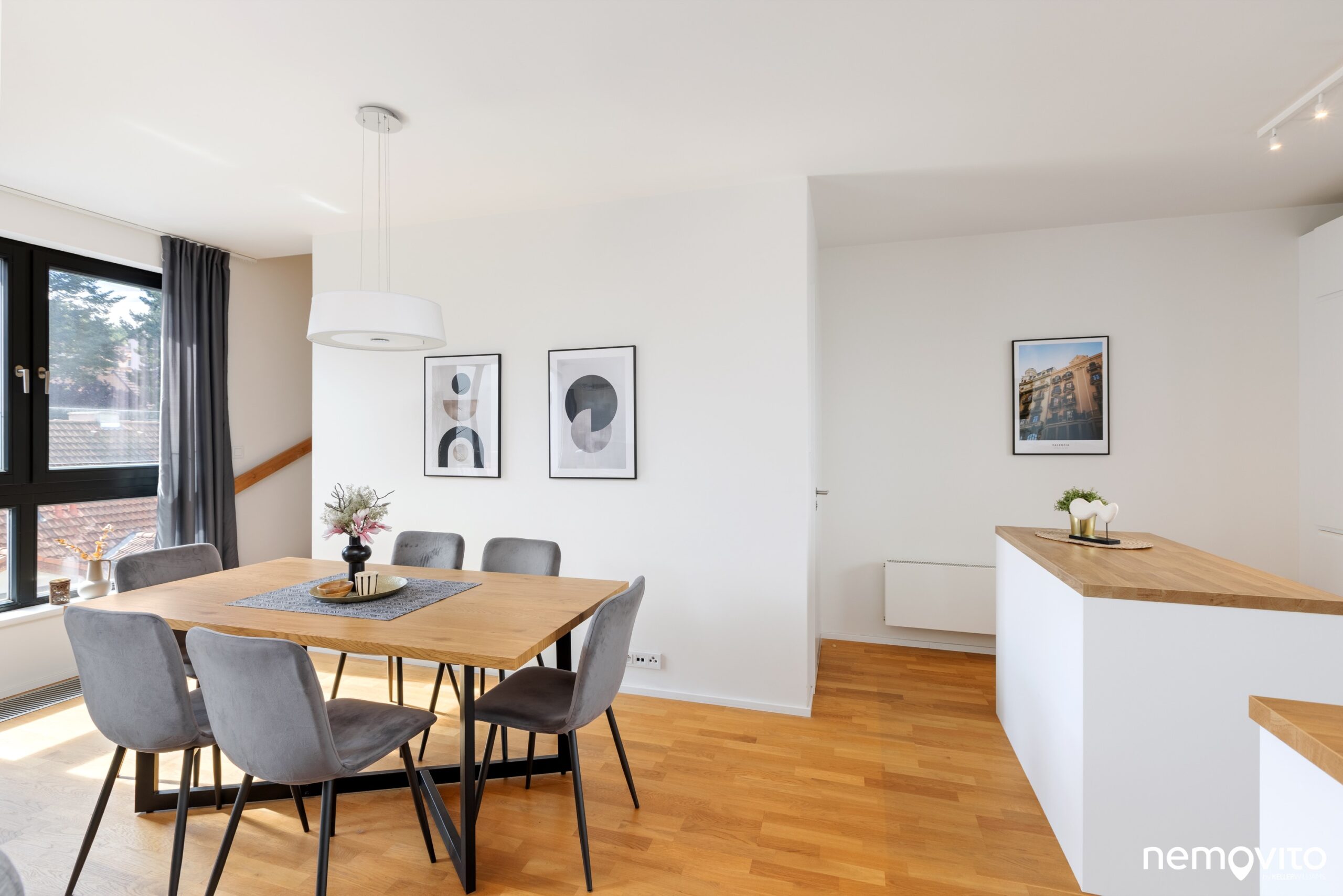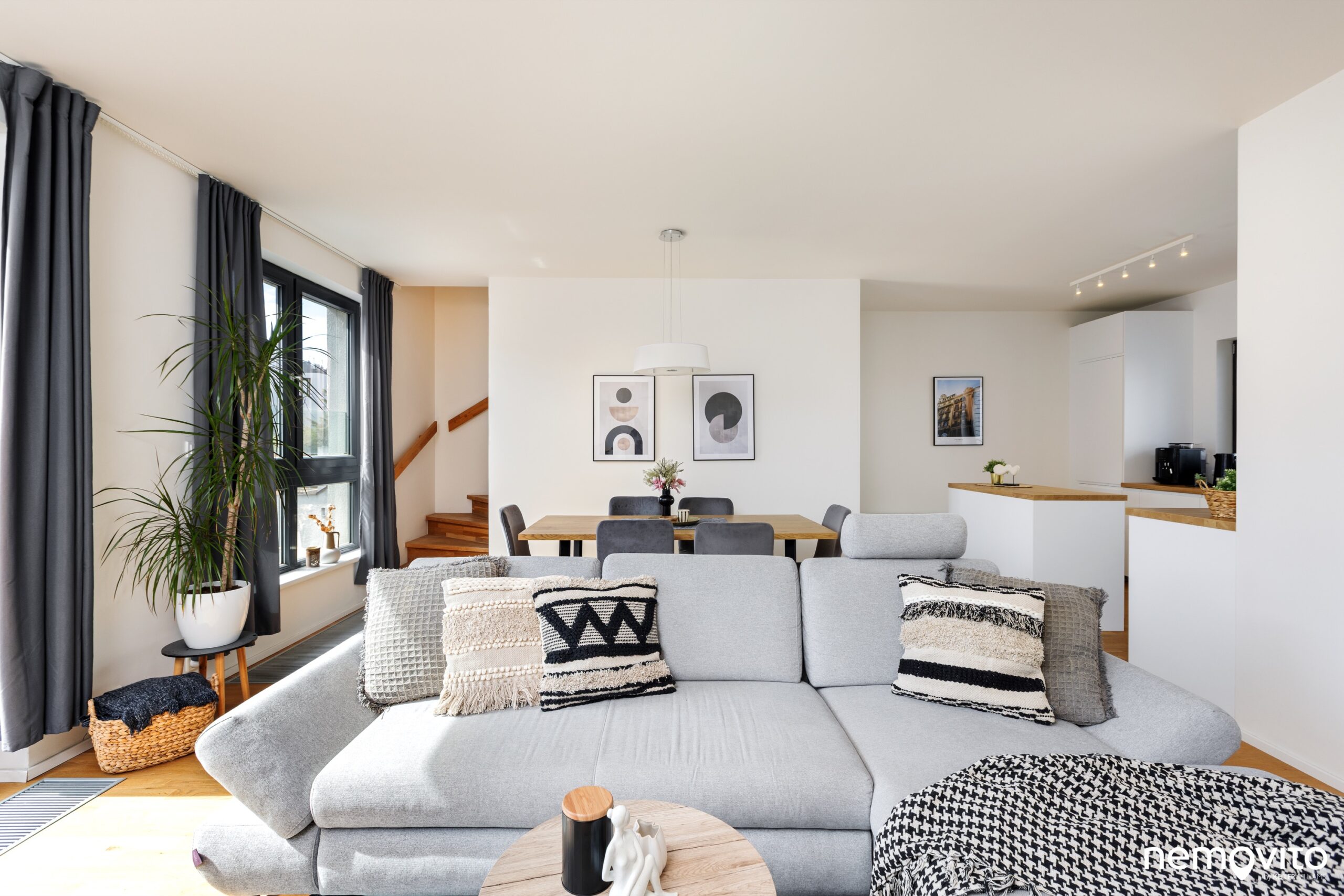 Denní zóna dole, zatímco ta s ložnicemi nahoře. V prvním podlaží tak můžete pohostit návštěvu, která si zde může i odskočit, zatímco nahoře v ložnicích můžete klidně nechat rozházené pyžamo a nikdo vám tam trajdat nebude. Šikovně oddělená soukromá zóna je jednoznačnou výhodou bytu, který se rozprostírá ve dvou úrovních. Nahoře dvě ložnice, koupelna s vanou a taky velká šatna. Ložnice jsou naproti sobě a nesousedí mezi sebou stěnami, zatímco za zdmi bytu už žádný další pokoj není. Konec hlasité noční televize, kterou slyšíte od sousedů. Tady jednoduše žádný není. Ekvivalent rodinného domu to samozřejmě stále není, ten vás možná čeká až ve vaší další budoucí etapě, ale tak trochu dům na domě to vlastně je. Až budeme spolu stát na ulici a koukat směrem na byt, pak tuto poznámku jistě pochopíte. A mimochodem - ani nemusíte jezdit autem, tramvají jste tady z Anděla opravdu hnedka.