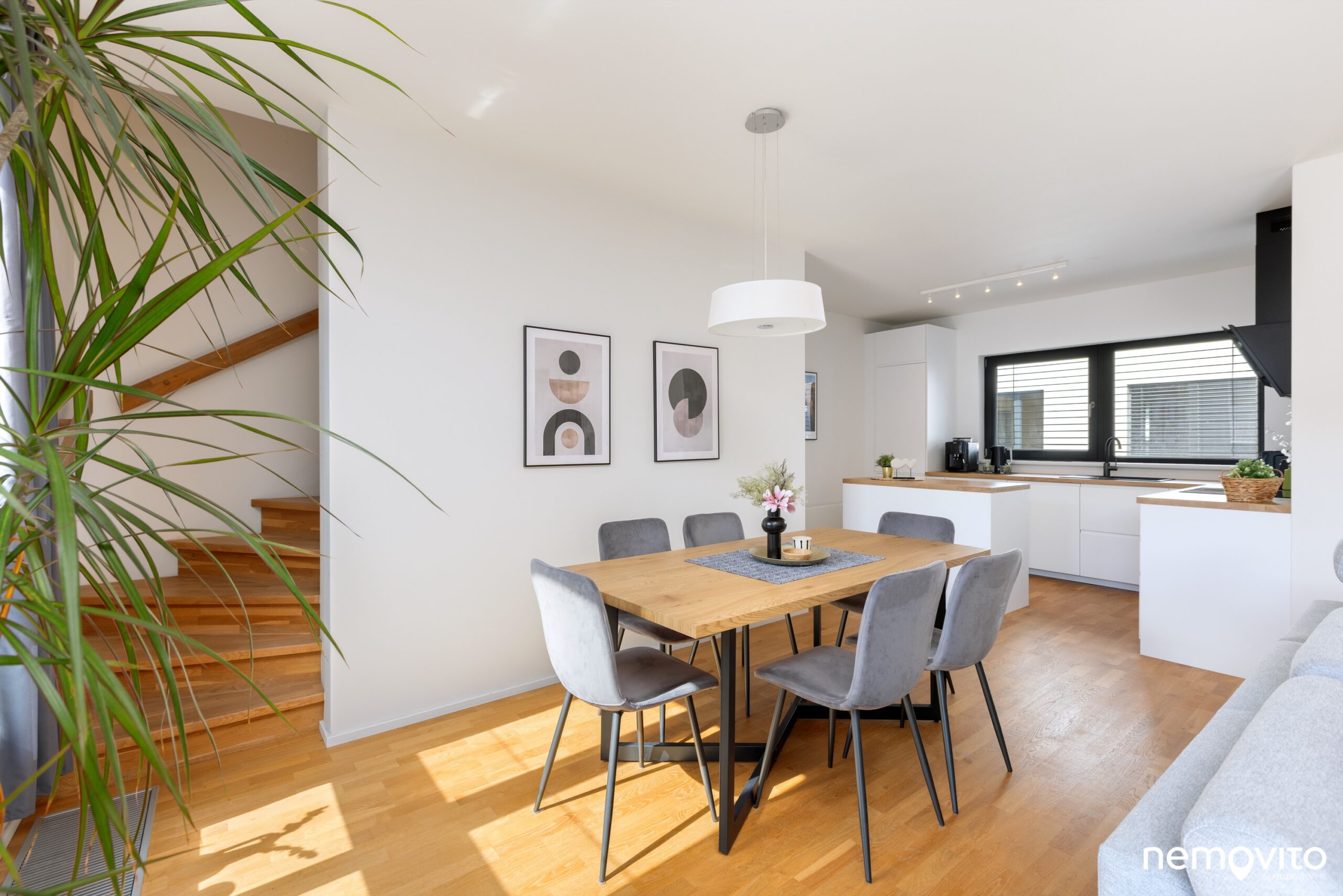 Kuchyně s velkým oknem, ostrůvkem a dokonce také spižírnou pod schodištěm. Velká pracovní plocha, veškeré nutné vestavěné spotřebiče a moderní barevné odstíny, které dobře ladí s dřevěnou podlahou místnosti.