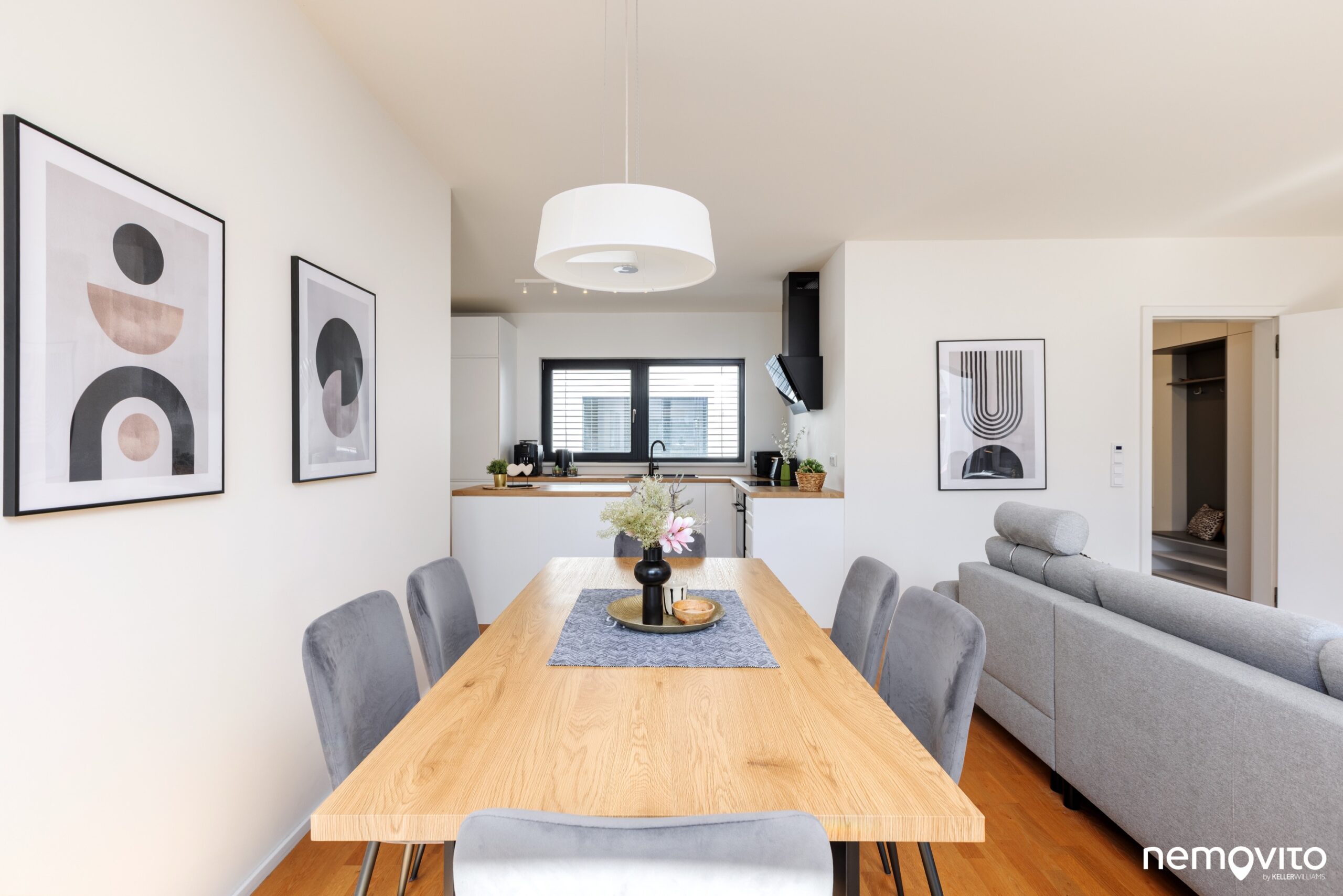 Do obýváku se mimo pracovního koutu a prostoru na gauč vejde také plnohodnotná jídelna, která navazuje na kuchyni.
