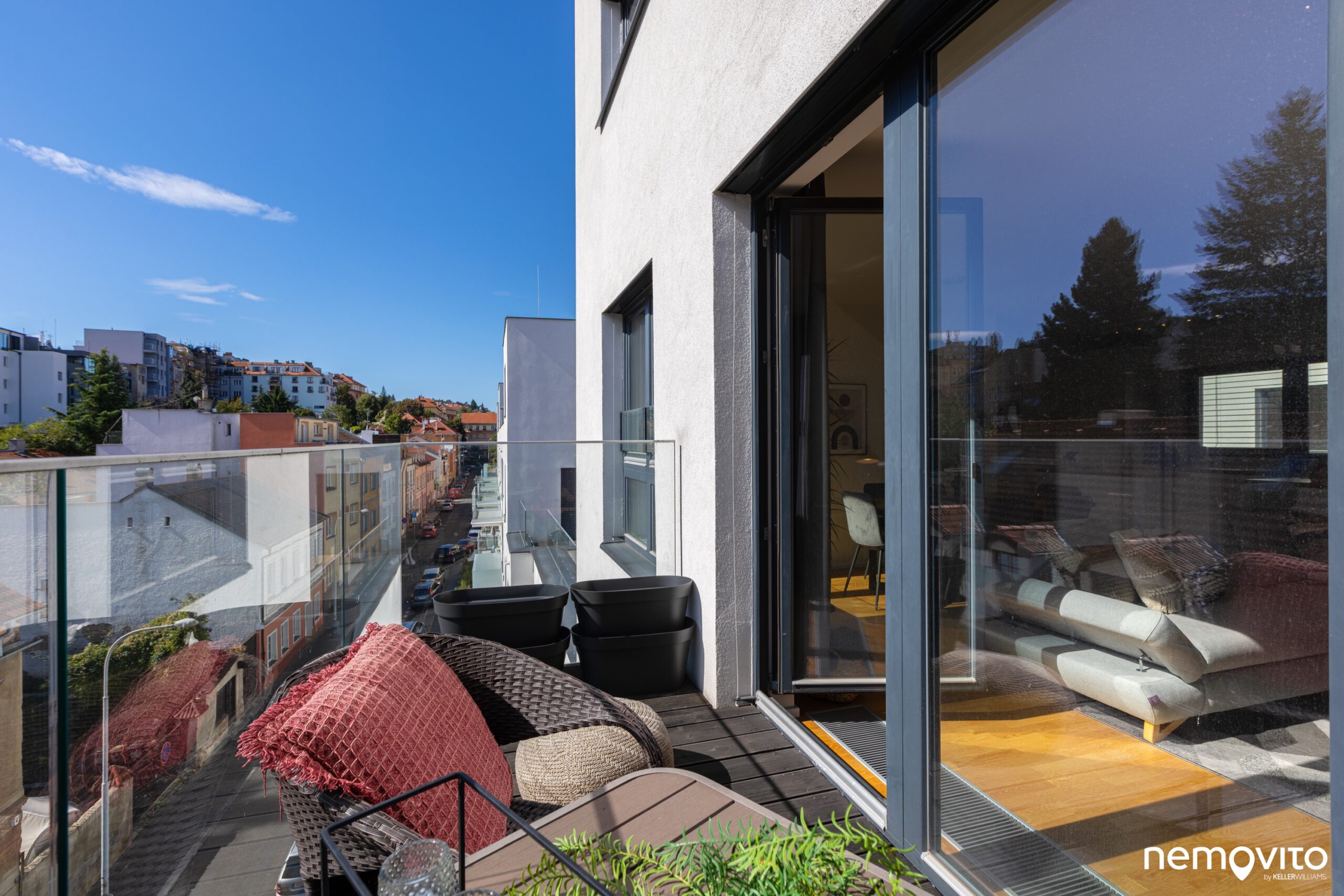 Budova z roku 2020 ctí jednoduchou architekturu bez zbytečných příkras. Byt se nachází na odvrácené straně od Vrchlického / Plzeňské.