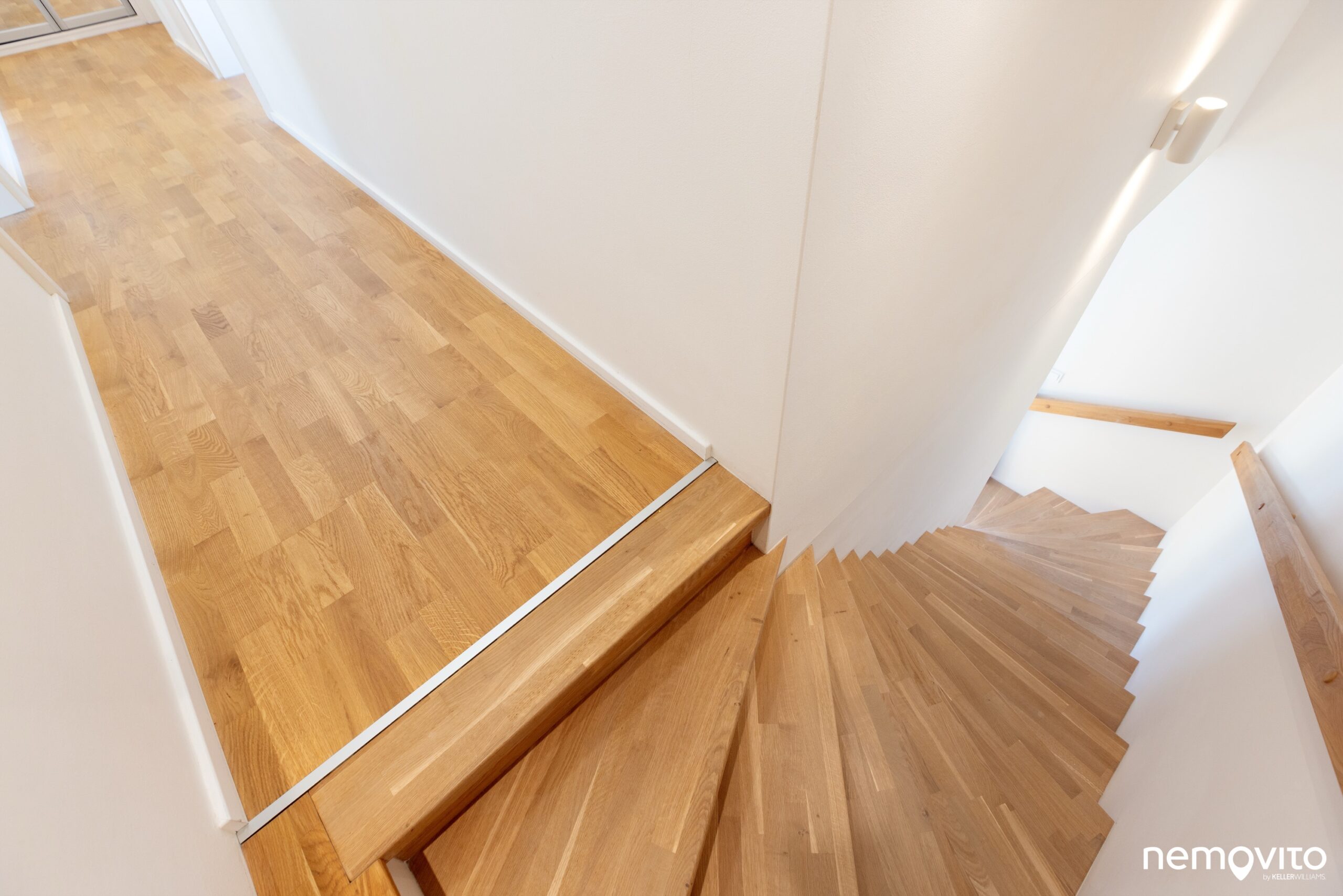 Nášlapy schodů jsou rovněž obložené dřevěnou podlahou, ke které se sladilo také zábradlí. Nahoře vás pak čekají dvě ložnice, koupelna a ještě šatna.