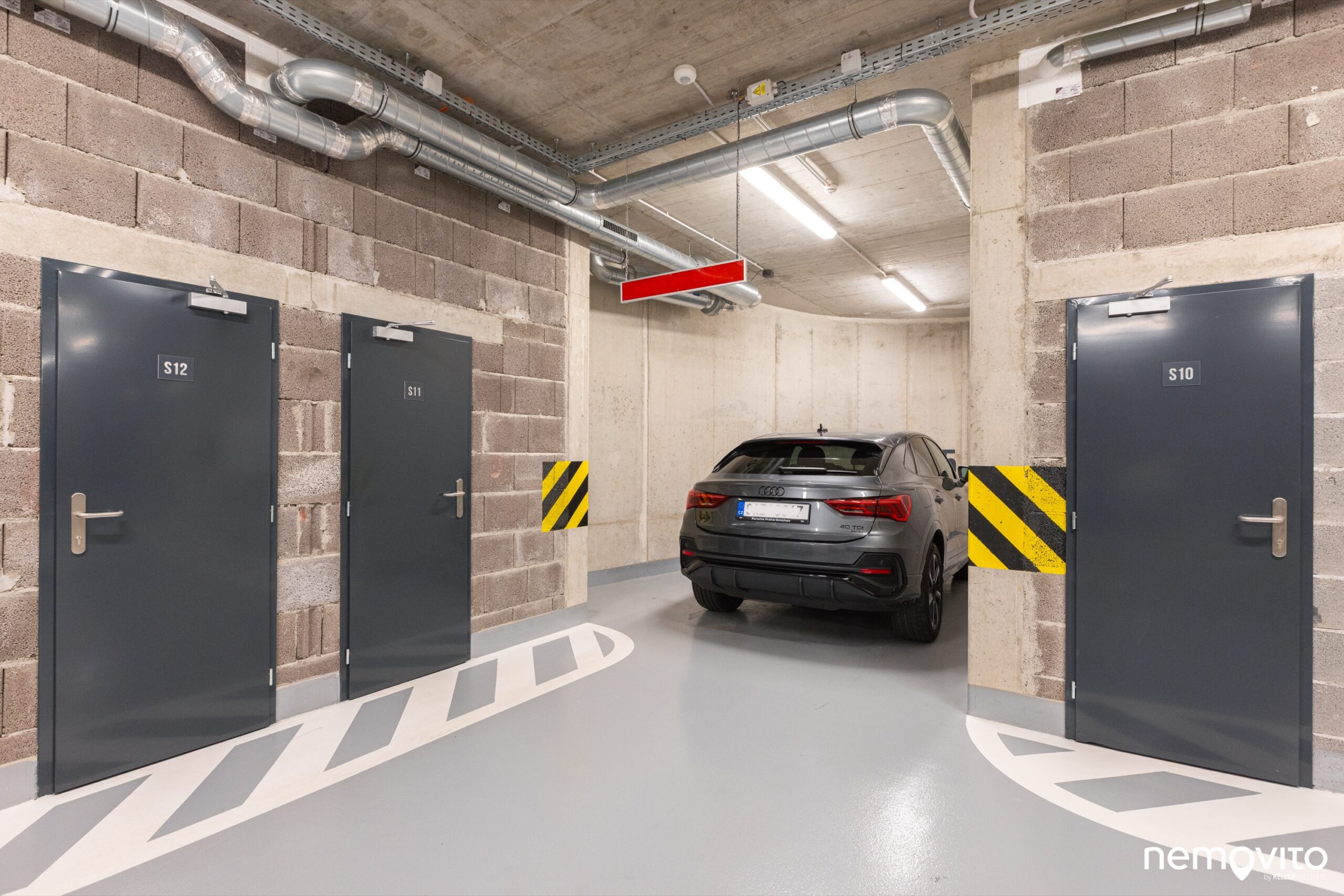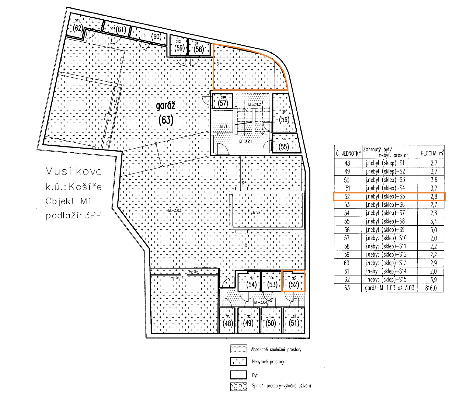 V rámci příslušenství bytu je vám k dispozici také sklep (2,8 m2) a garážové stání, které je v rohu a je tedy větší. A taky vám nikdo neutluče auto, koukněte dole na plánek.