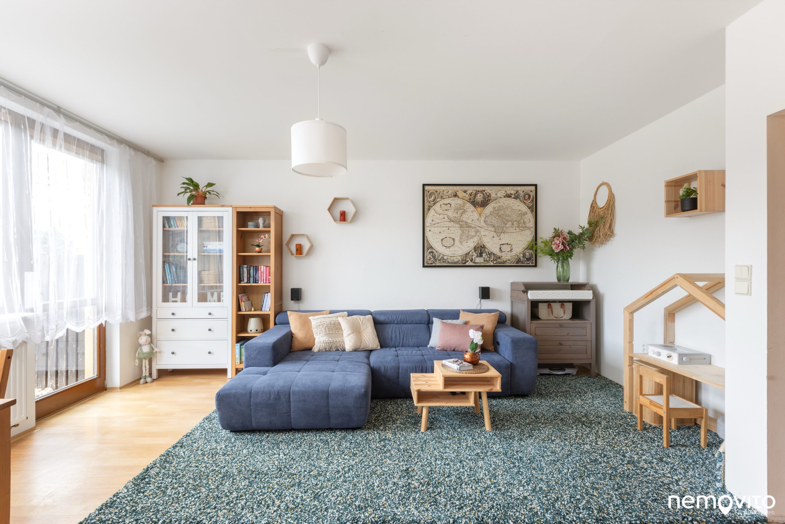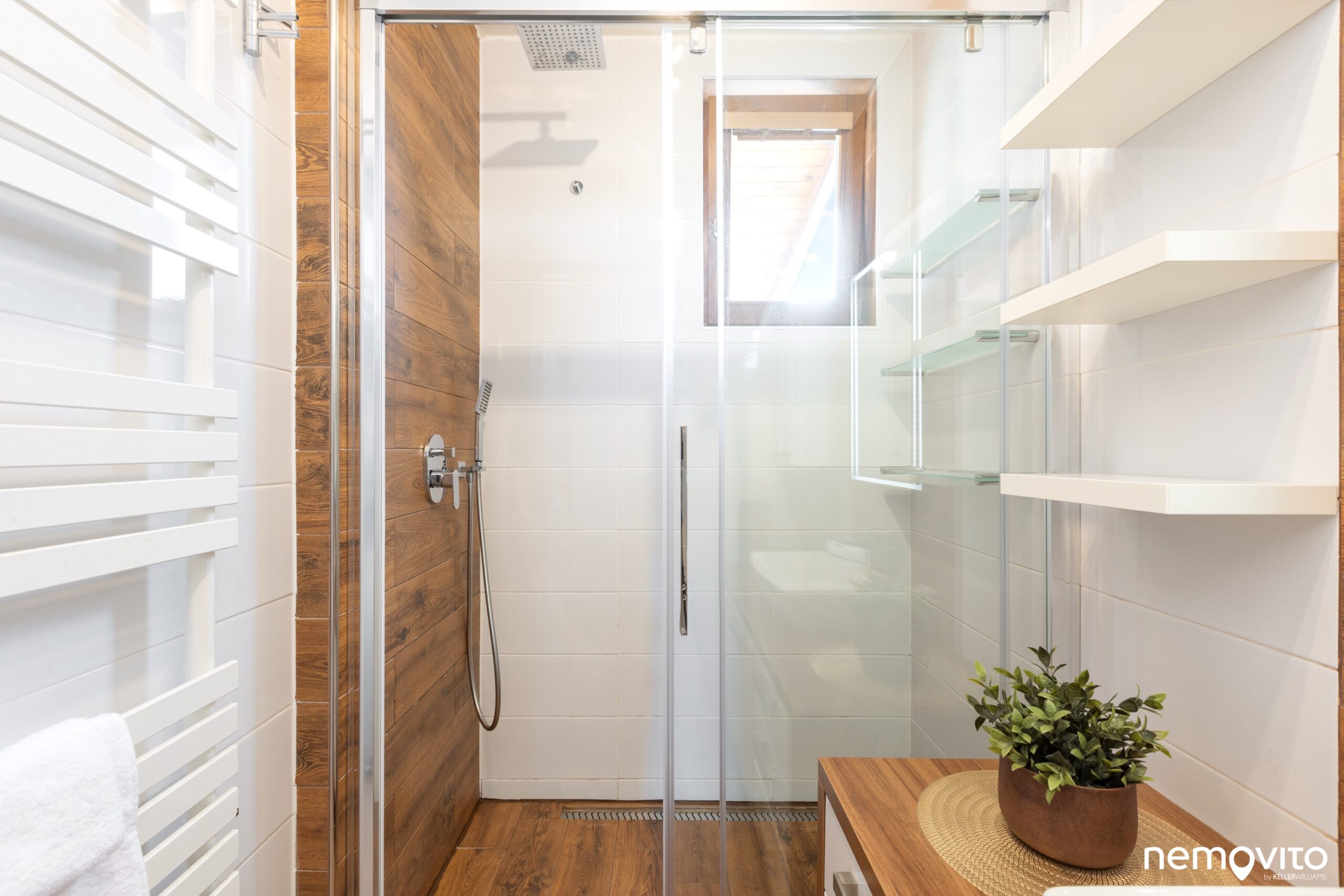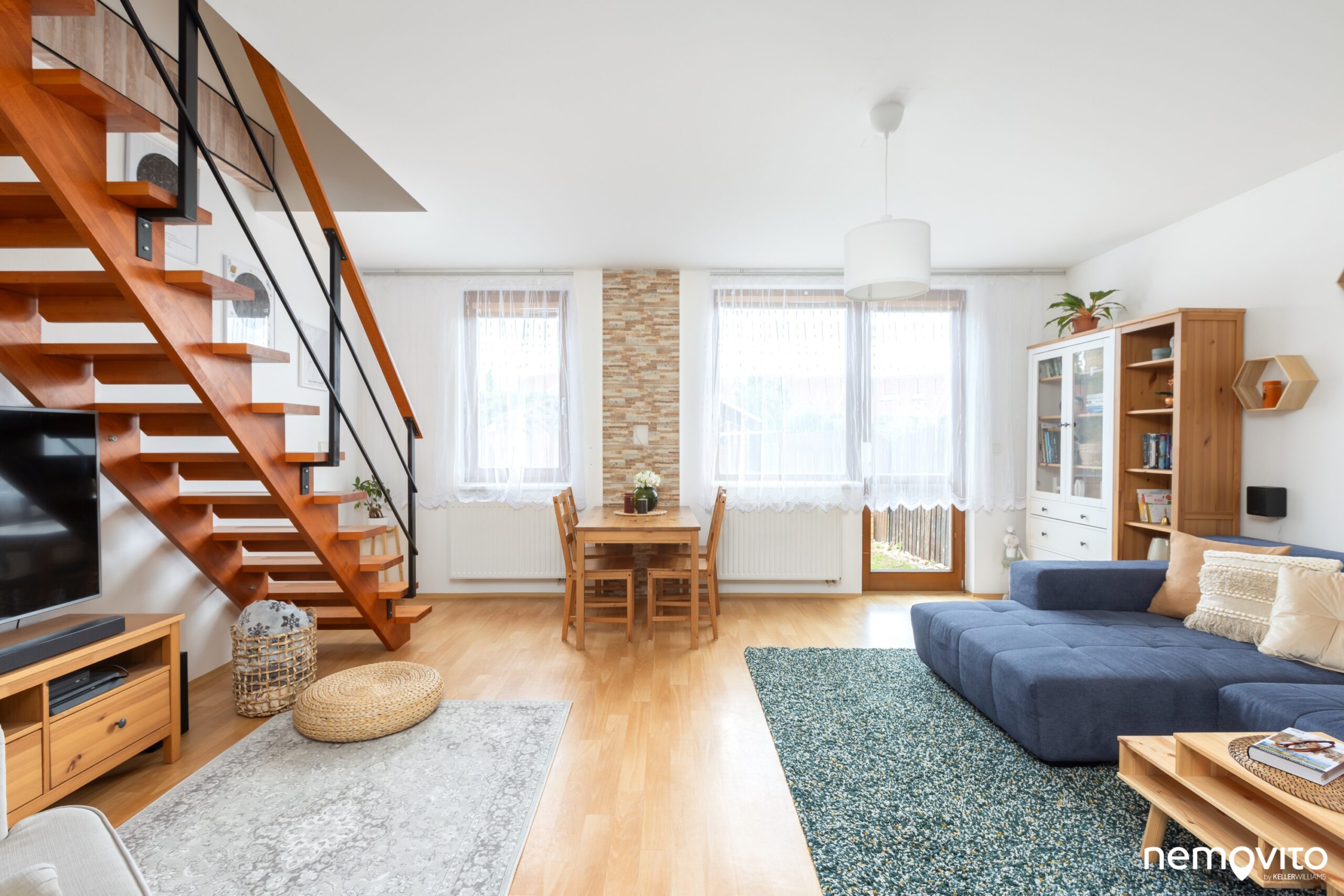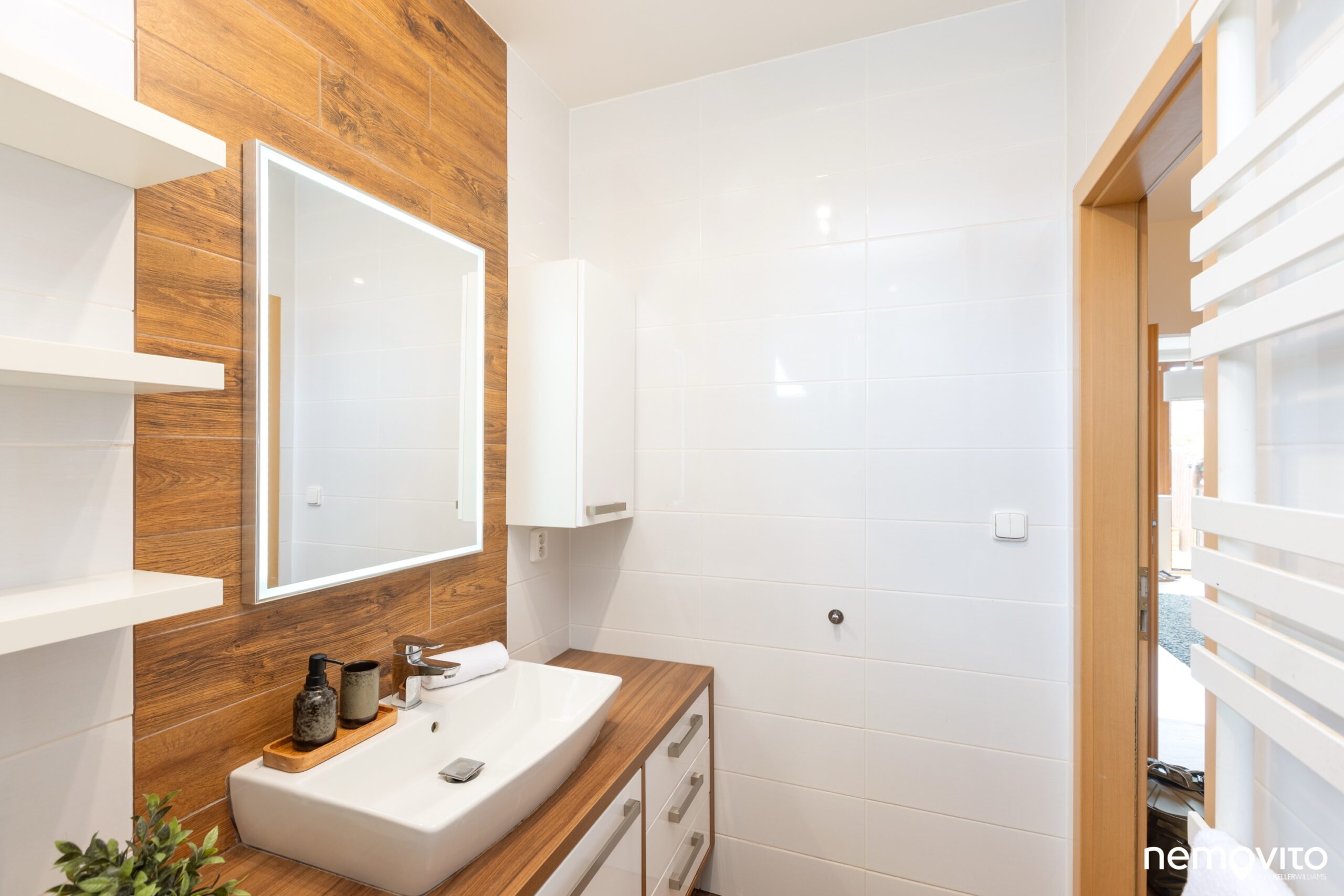 Dvě podlaží, obě ložnice nahoře a dole hlavní obytný prostor. Konkrétně v obýváku došlo k větší změně, kterou byl přesun kuchyňské linky do samostatné kuchyně. Trend, který se opět postupně vrací, má rozhodně svoje výhody. Samostatná kuchyně s jídelnou umožňuje vášnivějším kuchařům rozmach s větší linkou, těm hravým pak zase víc místa v obýváku na gauč nebo dětský plácek. Praktické překvapení pak přináší samostatná prádelna, která je navíc na jiném podlaží než ložnice. A možná úsměvný bonus, ale to jen do první vážné situace - je tu dvakrát WC a v obou případech je oddělené. Koupelna je nová a do sprchového koutu se vejdou nejen trpaslíci. Stojíte před ním a říkáte si - není moc malý? Pak ale vstoupíte dovnitř a uvědomíte si, že plocha zvenčí a zevnitř vypadá úplně jinak. A zejména pak dnes, kdy byty 3+kk v novostavbách začínají na výměrách kolem 65 m2, je tahle skoro devadesátimetrová tři plus jednička vlastně ještě velká. A to ještě nevíte, že další domy na vás čekají na zahradě 🙂