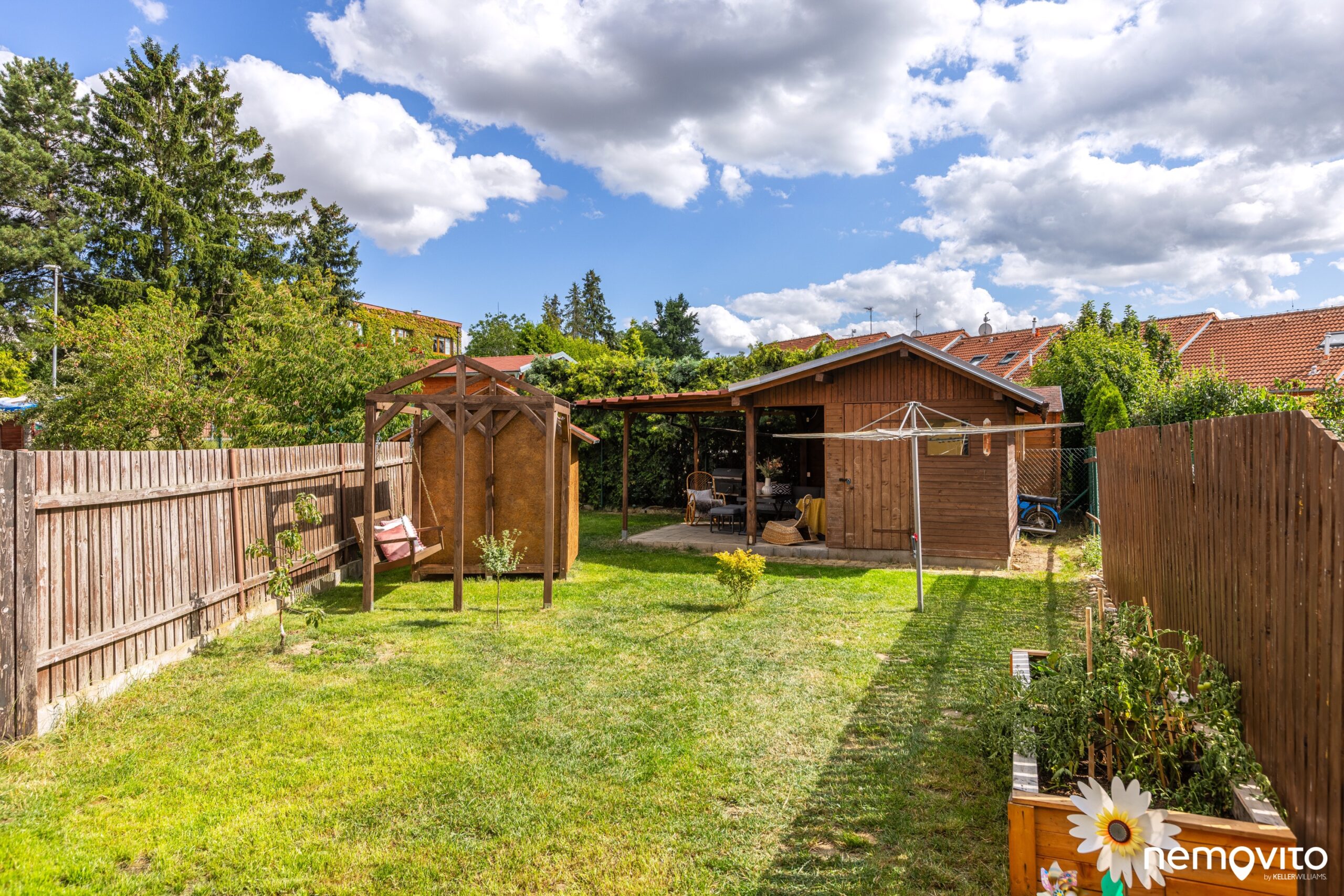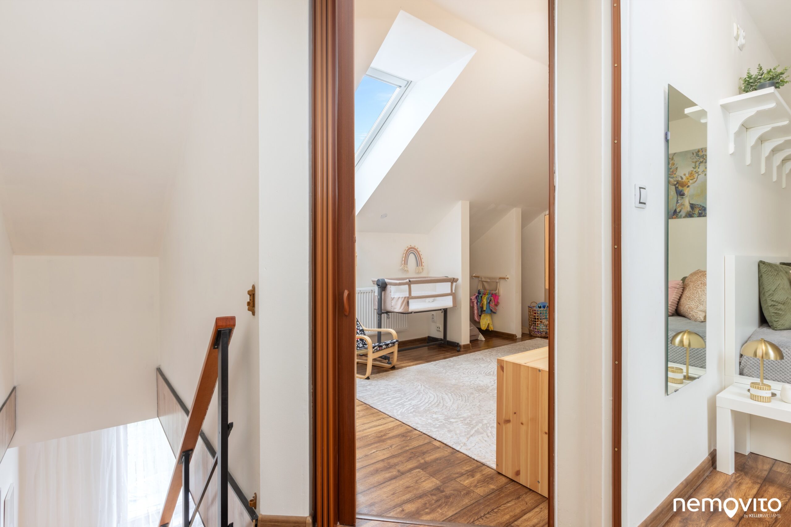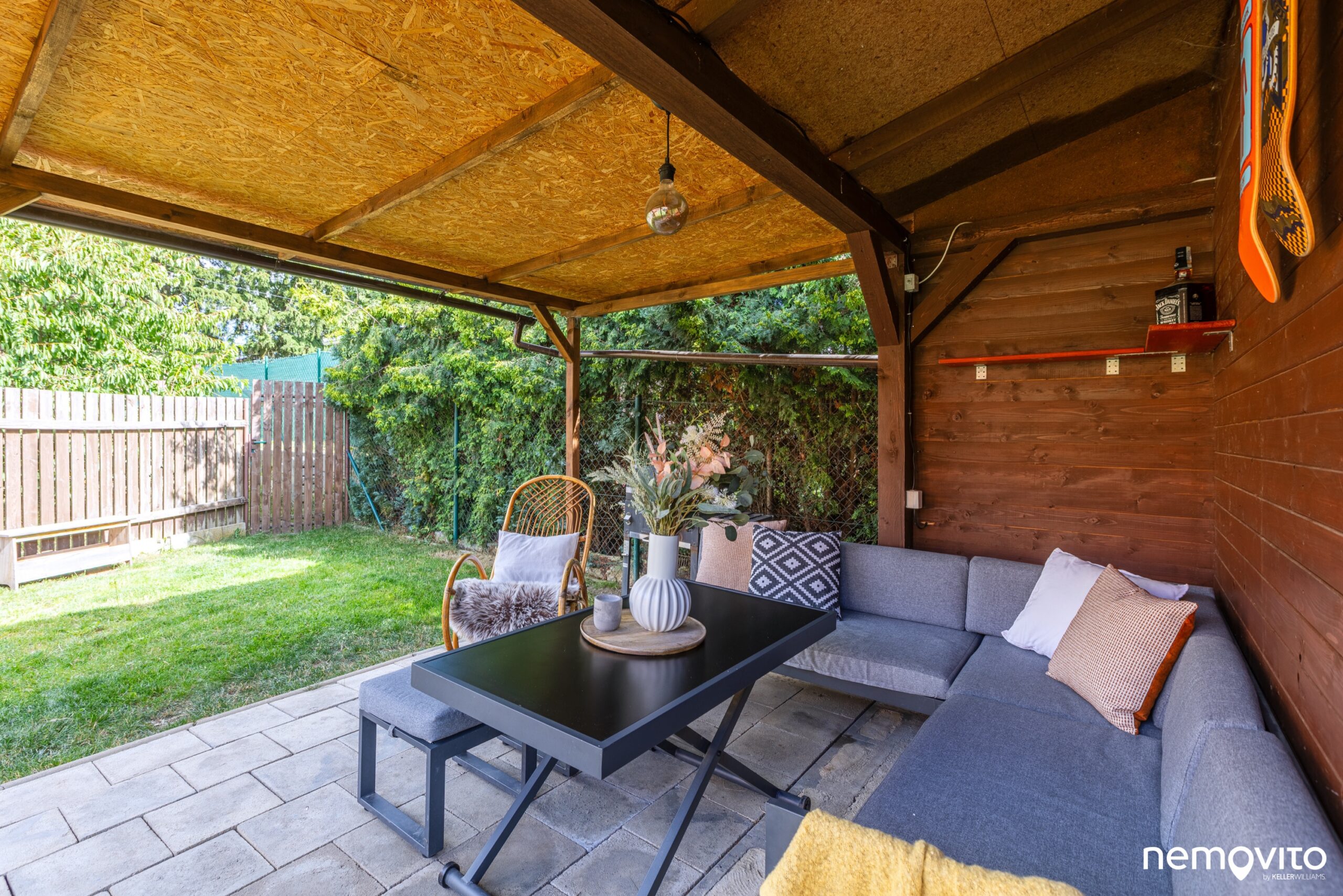 Dvě podlaží, obě ložnice nahoře a dole hlavní obytný prostor. Konkrétně v obýváku došlo k větší změně, kterou byl přesun kuchyňské linky do samostatné kuchyně. Trend, který se opět postupně vrací, má rozhodně svoje výhody. Samostatná kuchyně s jídelnou umožňuje vášnivějším kuchařům rozmach s větší linkou, těm hravým pak zase víc místa v obýváku na gauč nebo dětský plácek. Praktické překvapení pak přináší samostatná prádelna, která je navíc na jiném podlaží než ložnice. A možná úsměvný bonus, ale to jen do první vážné situace - je tu dvakrát WC a v obou případech je oddělené. Koupelna je nová a do sprchového koutu se vejdou nejen trpaslíci. Stojíte před ním a říkáte si - není moc malý? Pak ale vstoupíte dovnitř a uvědomíte si, že plocha zvenčí a zevnitř vypadá úplně jinak. A zejména pak dnes, kdy byty 3+kk v novostavbách začínají na výměrách kolem 65 m2, je tahle skoro devadesátimetrová tři plus jednička vlastně ještě velká. A to ještě nevíte, že další domy na vás čekají na zahradě 🙂