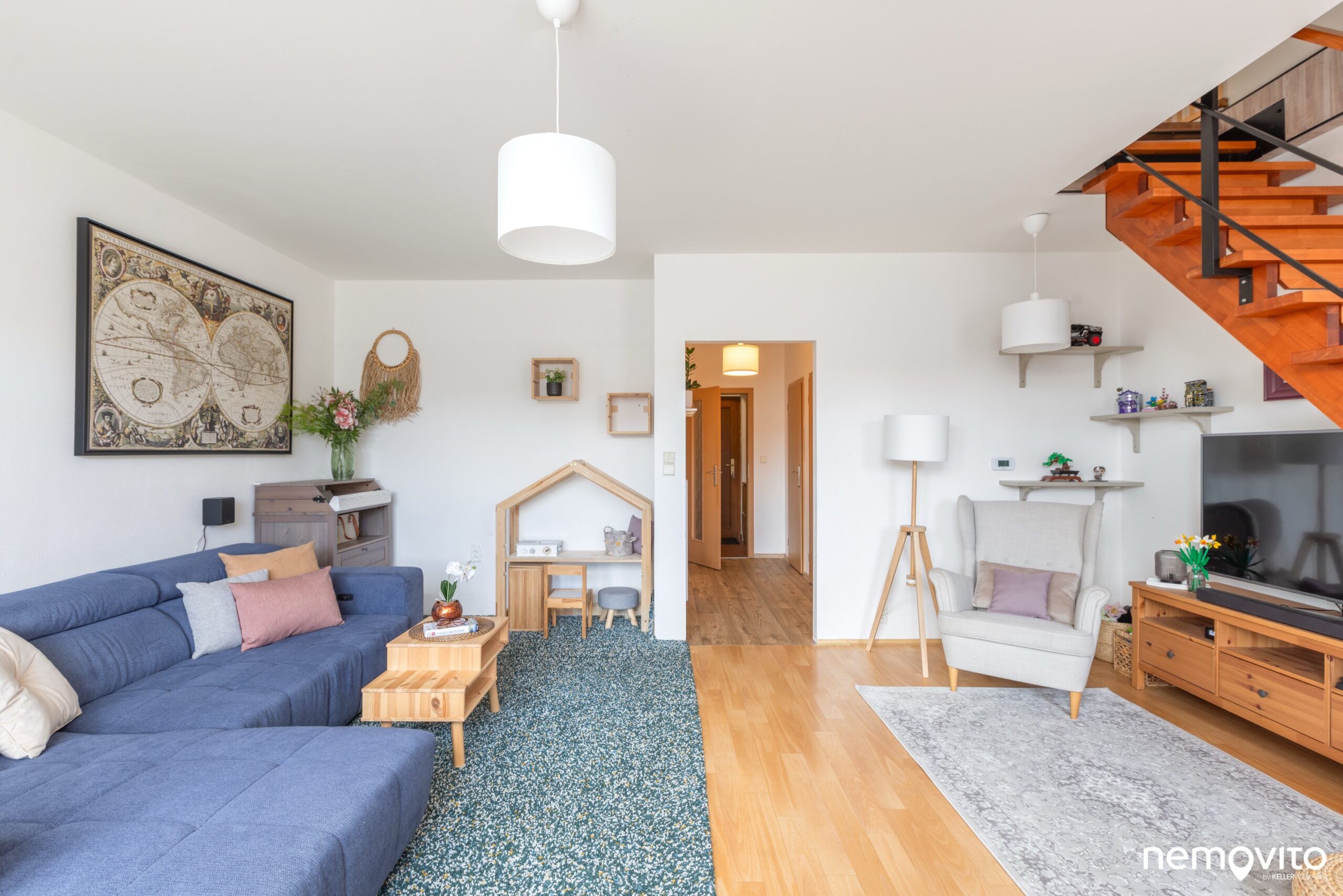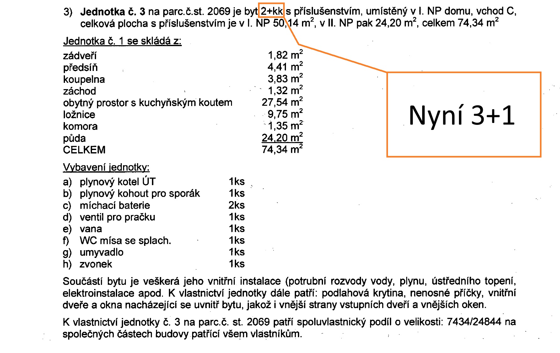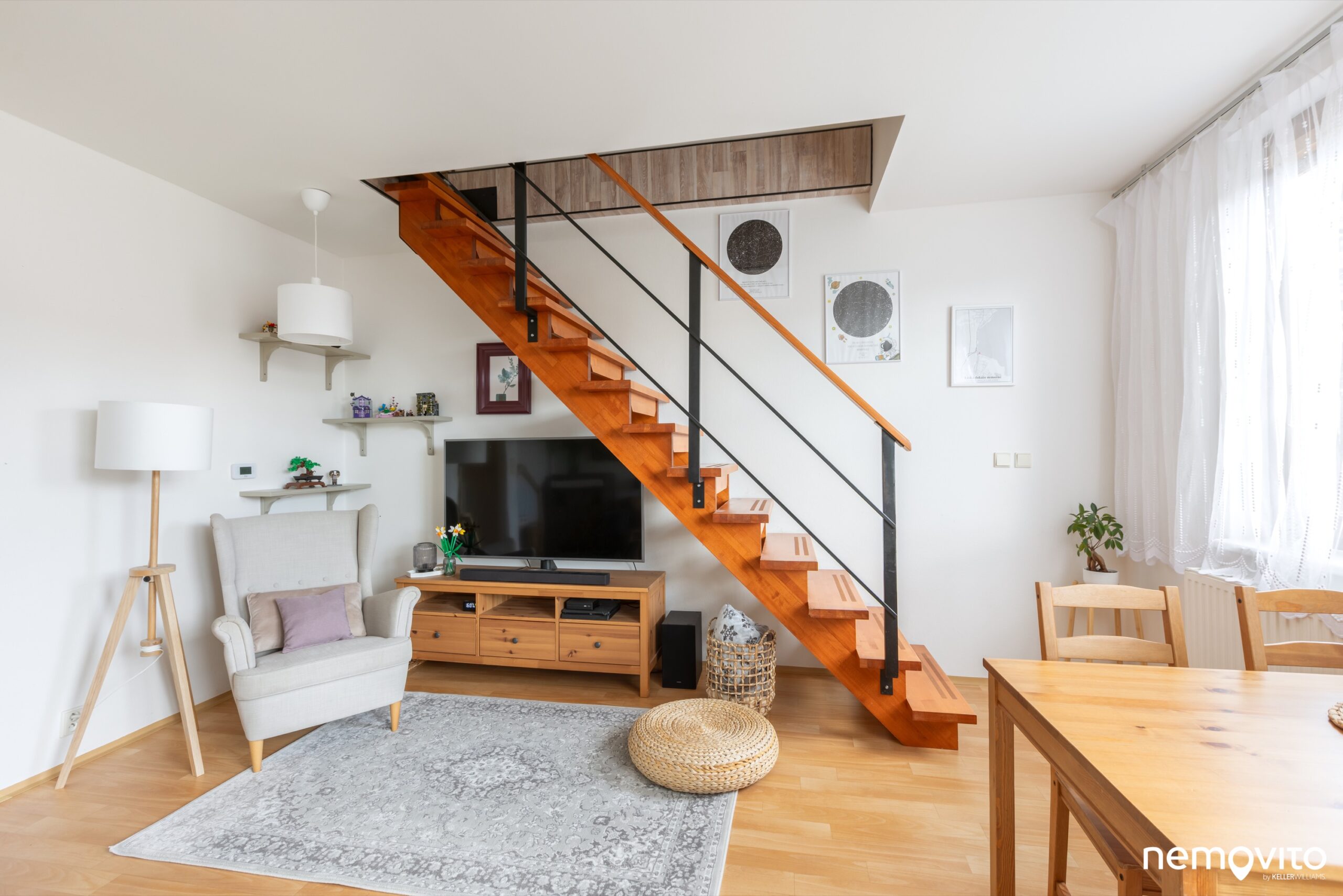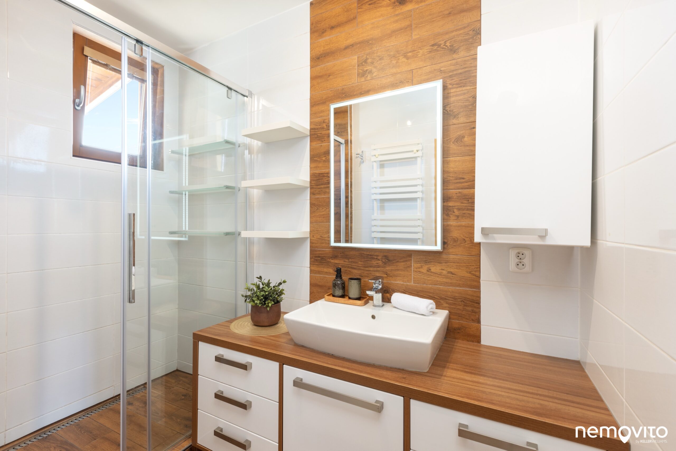 Dvě podlaží, obě ložnice nahoře a dole hlavní obytný prostor. Konkrétně v obýváku došlo k větší změně, kterou byl přesun kuchyňské linky do samostatné kuchyně. Trend, který se opět postupně vrací, má rozhodně svoje výhody. Samostatná kuchyně s jídelnou umožňuje vášnivějším kuchařům rozmach s větší linkou, těm hravým pak zase víc místa v obýváku na gauč nebo dětský plácek. Praktické překvapení pak přináší samostatná prádelna, která je navíc na jiném podlaží než ložnice. A možná úsměvný bonus, ale to jen do první vážné situace - je tu dvakrát WC a v obou případech je oddělené. Koupelna je nová a do sprchového koutu se vejdou nejen trpaslíci. Stojíte před ním a říkáte si - není moc malý? Pak ale vstoupíte dovnitř a uvědomíte si, že plocha zvenčí a zevnitř vypadá úplně jinak. A zejména pak dnes, kdy byty 3+kk v novostavbách začínají na výměrách kolem 65 m2, je tahle skoro devadesátimetrová tři plus jednička vlastně ještě velká. A to ještě nevíte, že další domy na vás čekají na zahradě 🙂