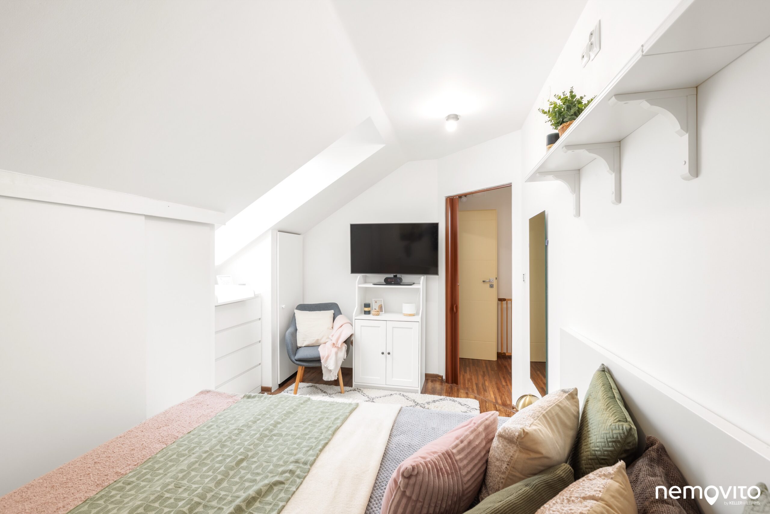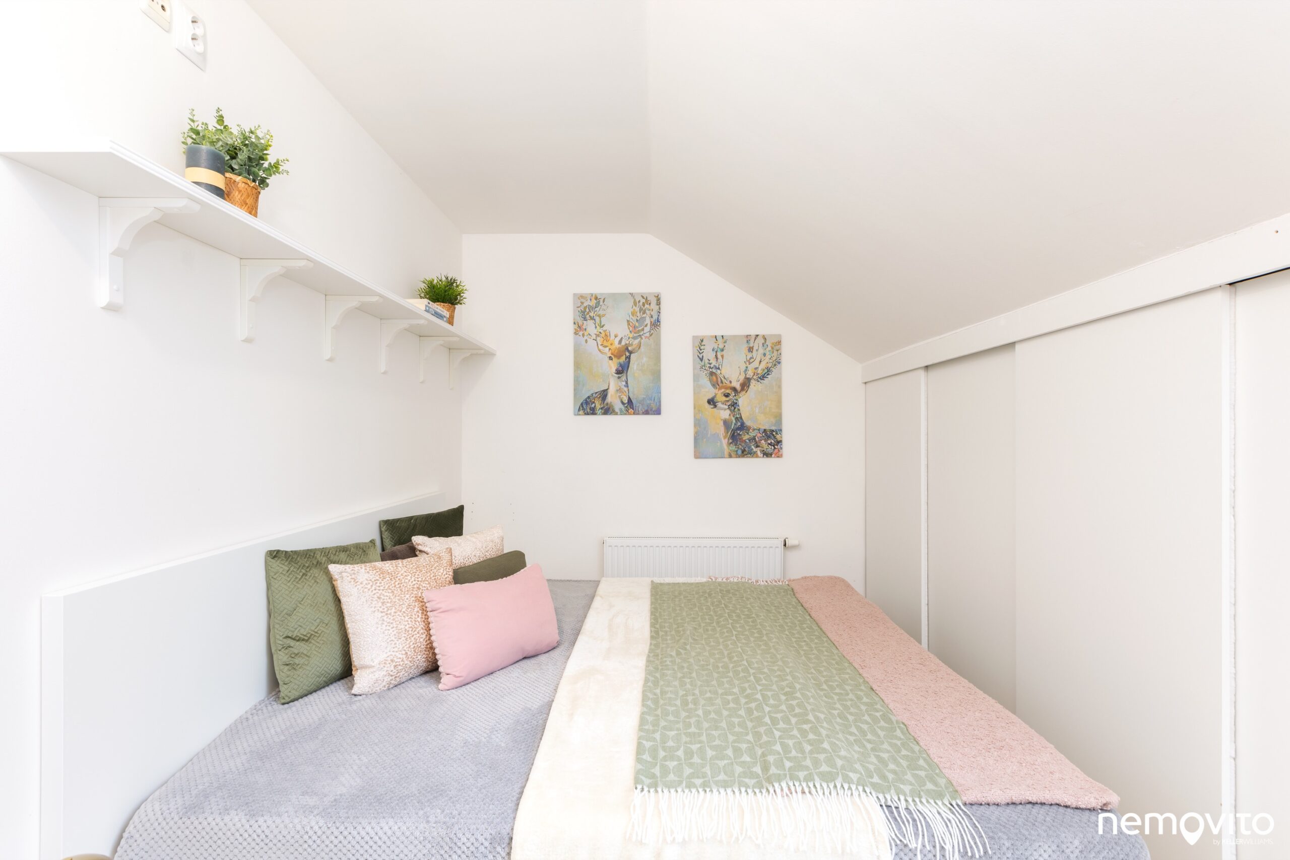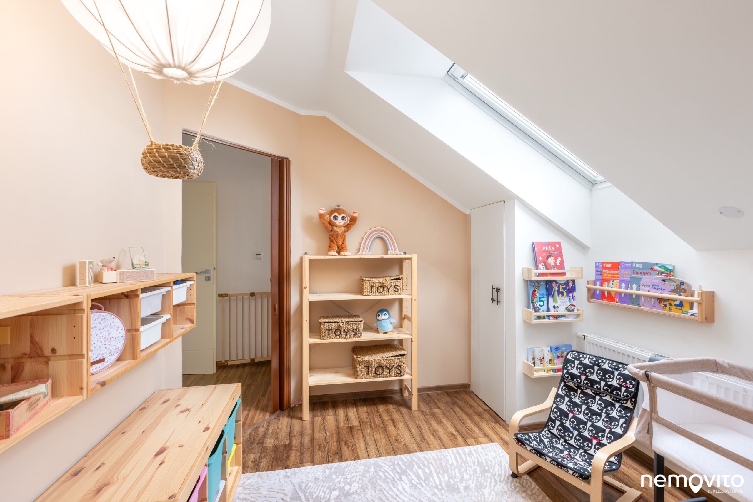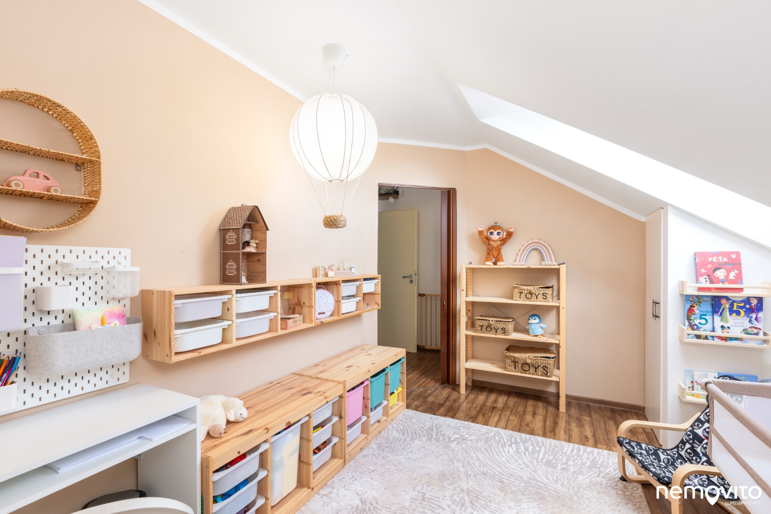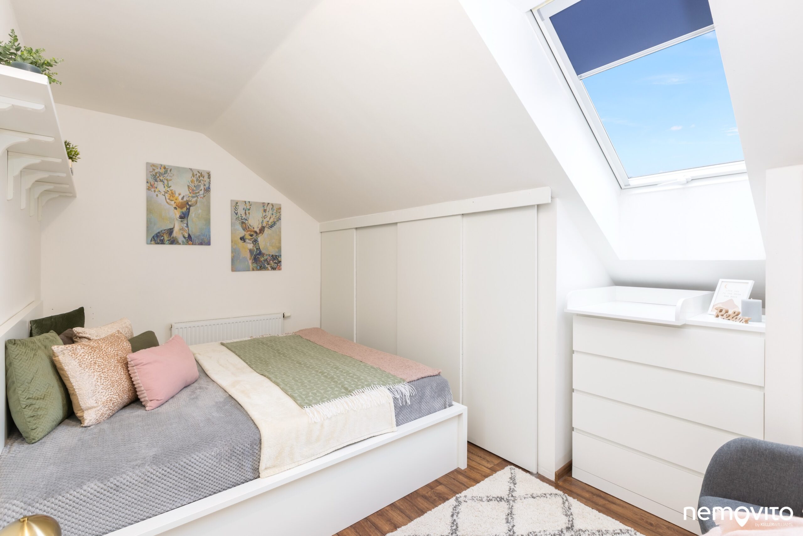 Dětský pokoj má velikost lehce přes 11 m2 a také zde došlo na úpravu. Pod šikminou střechy totiž byly ukryté prostory, které původně byly bez využití. Velká škoda. Proto po levé straně okna vznikla vestavěná skříň a po pravé pak zase dlouhý prostor, kam lze schovat třeba hromadu hraček. Nejlépe to uvidíte na virtuální prohlídce, kterou určitě doporučuji projít.