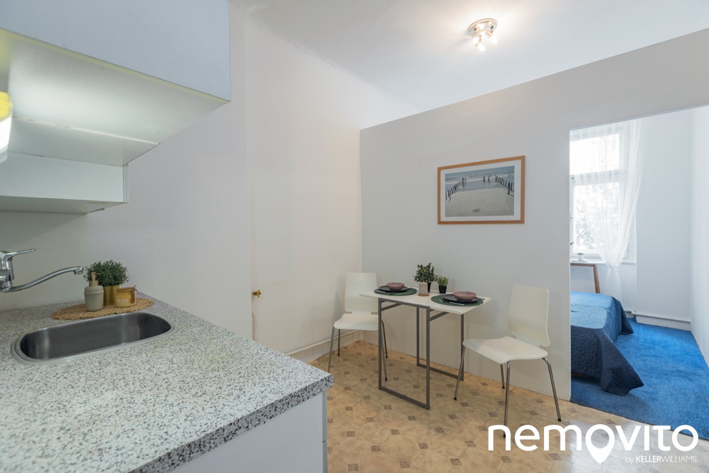 Kuchyňská linka je skromného provedení, avšak na dosavadní pronájem postačovala. Druhá místnost bytu je přepažená polo příčkou tak, aby byl prostor ložnice částečně oddělený. Tato místnost je užší, plocha dohromady je kolem 15 m2.