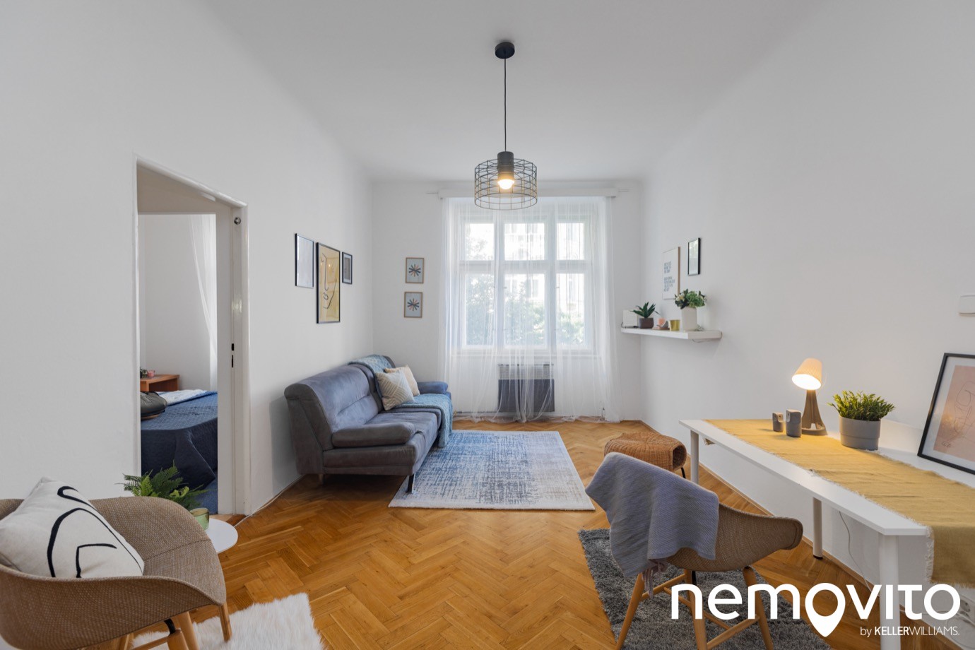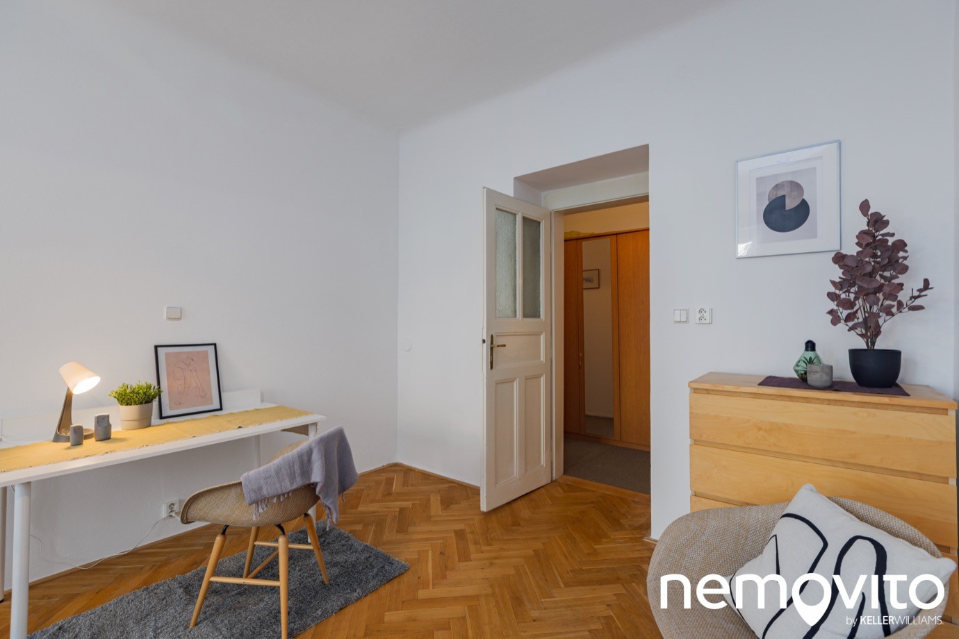 Vysoké stropy, velká okna, původní dveře a dřevěné parkety. Nezbytné interiérové prvky, které charakterizují vinohradské byty. Variabilní dispozice tohoto bytu navíc umožňuje hned několik variant. Důležité je, že na rozdíl od mnoha bytů na Vinohradech tento netrpí nedostatkem světla. Umístění domu na rohu s velkým odstupem od sousedních staveb společně se západní orientací velkých oken zaručuje, že v tomto bytě nebudete jako v tmavé kobce. Velehradská ulice je jednosměrná, vytíženější Ondříčkova je zase dostatečně daleko na to, aby vám provoz nejezdil pod okny.