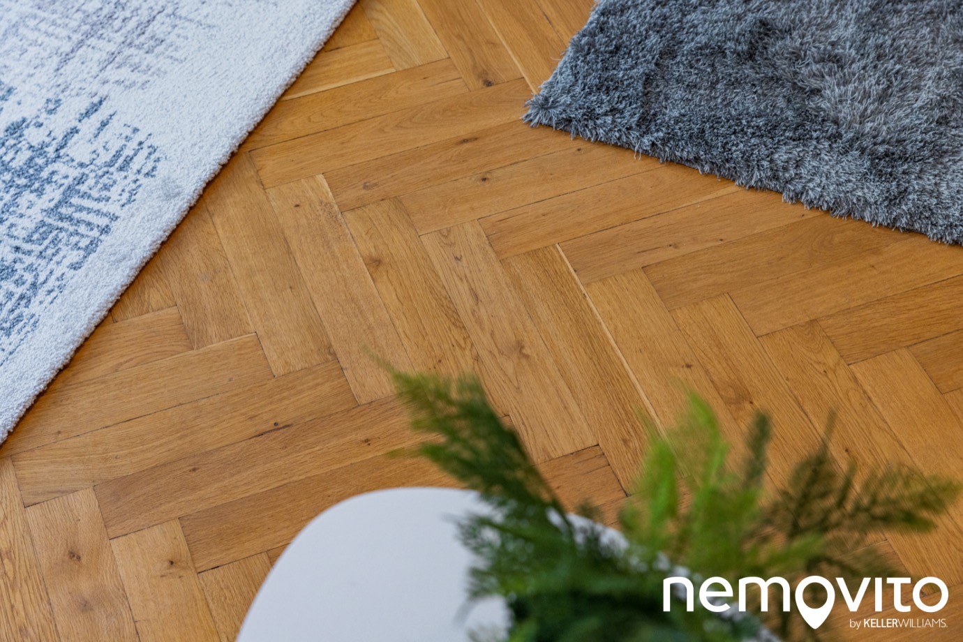 V hlavní místnosti vás mimo vysokého stropu čeká i další typický prvek vinohradských bytů - dřevěné parkety a původní dveře. Za zmínku taktéž stojí, že dělící příčka mezi místnostmi je velmi tenká a možné je přinejmenším její částečné odstranění. V zadní části pokoje se nachází dostatek místa na pracovní kout.