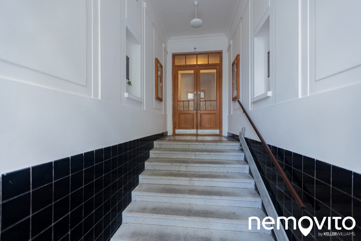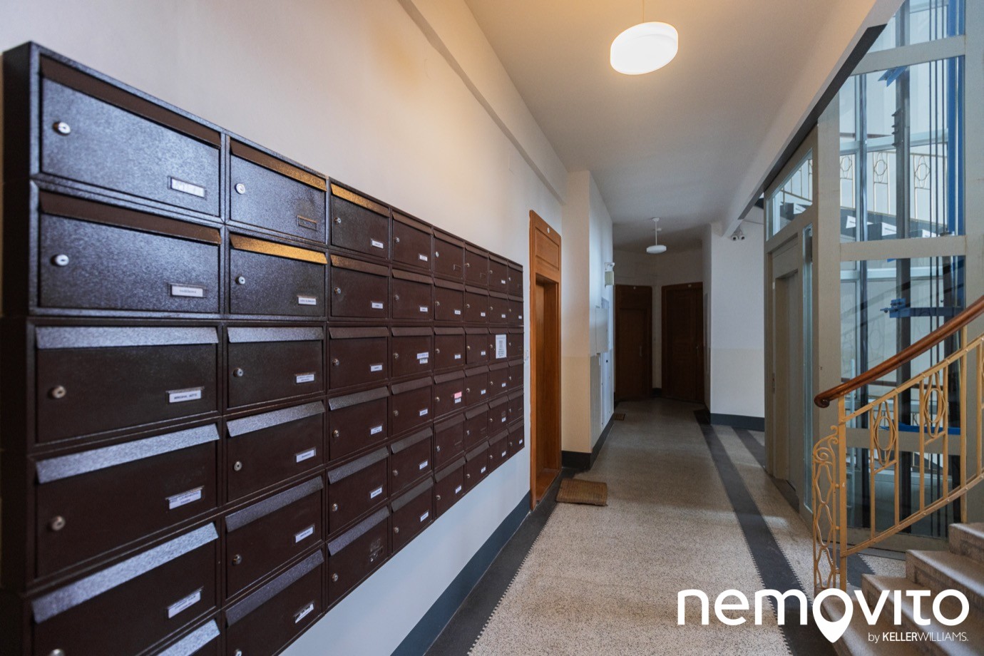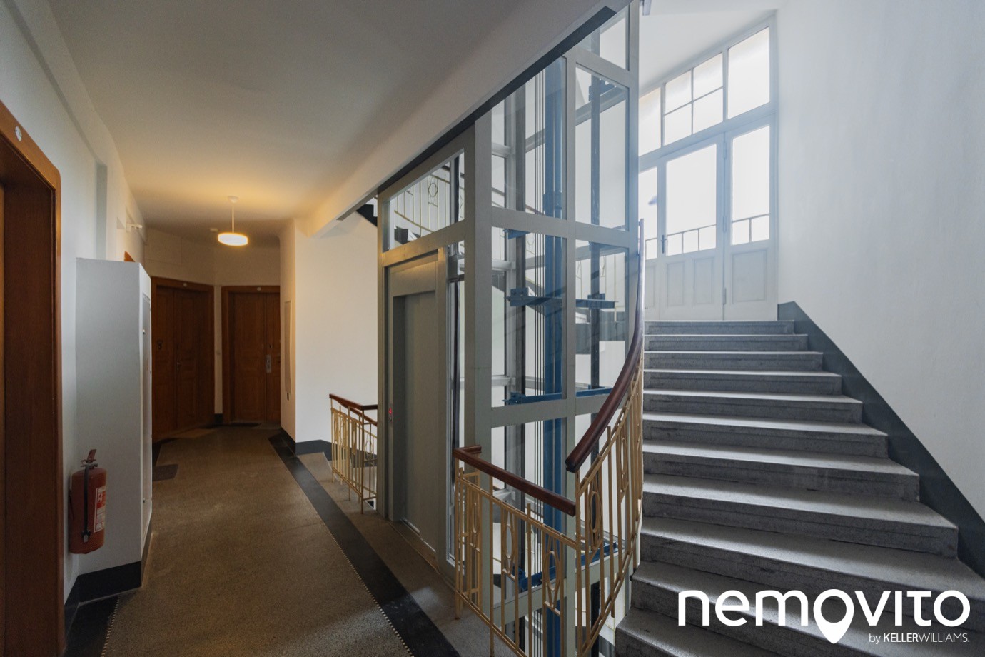 Rohový dům je v mimořádném stavu a skvěle udržovaný. Puntičkáře potěší, že vstupní dveře do bytů drží jednotnou podobu. Jistě jsme po Vinohradech navštívili pár domů, jejichž chodby hyzdí nesourodá podoba dveří z různých etap přestaveb a přerozdělování bytů. Tady má všechno svůj řád, žádný mišmaš. V domě nechybí výtah a sklepy, jeden z nich patří i k tomuto bytu.