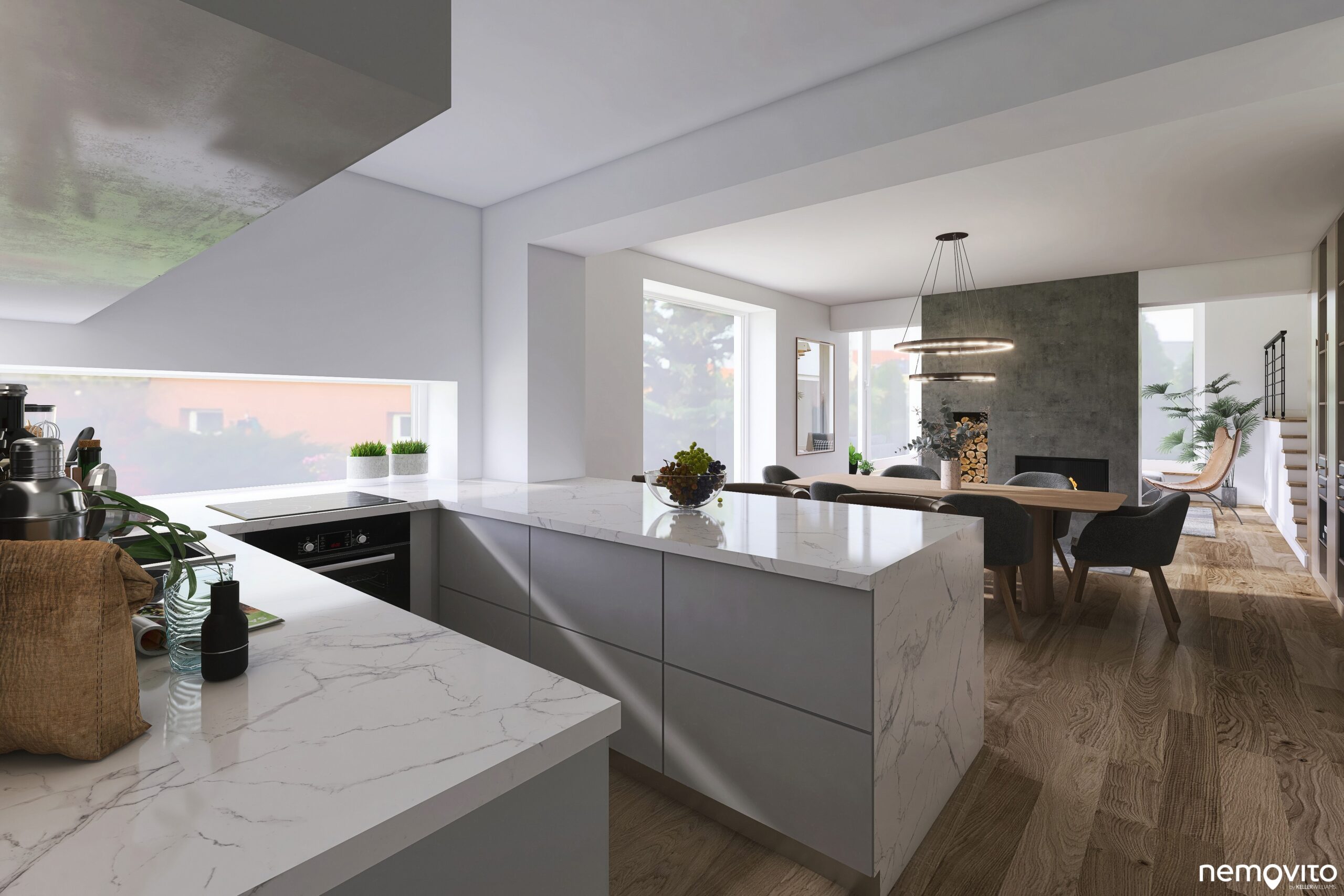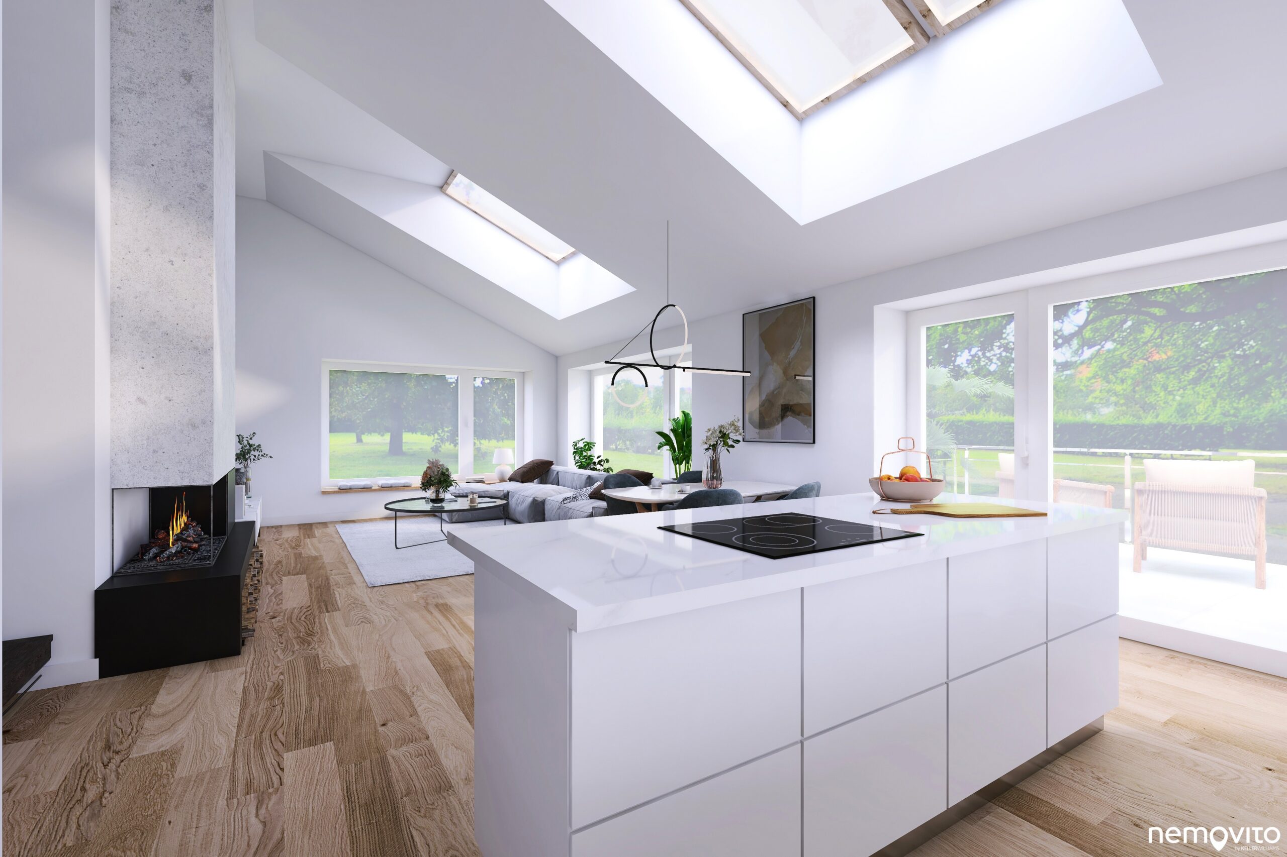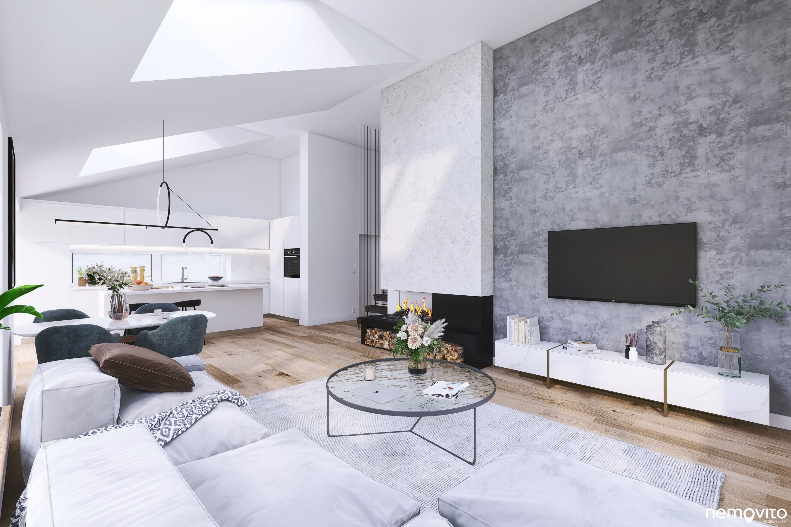 Prostor kuchyně je oddělený polo příčkou, která má v sobě zabudovaný komín. Celou tuto spodní část bytu charakterizují velká okna.
