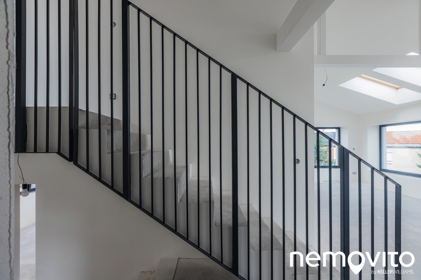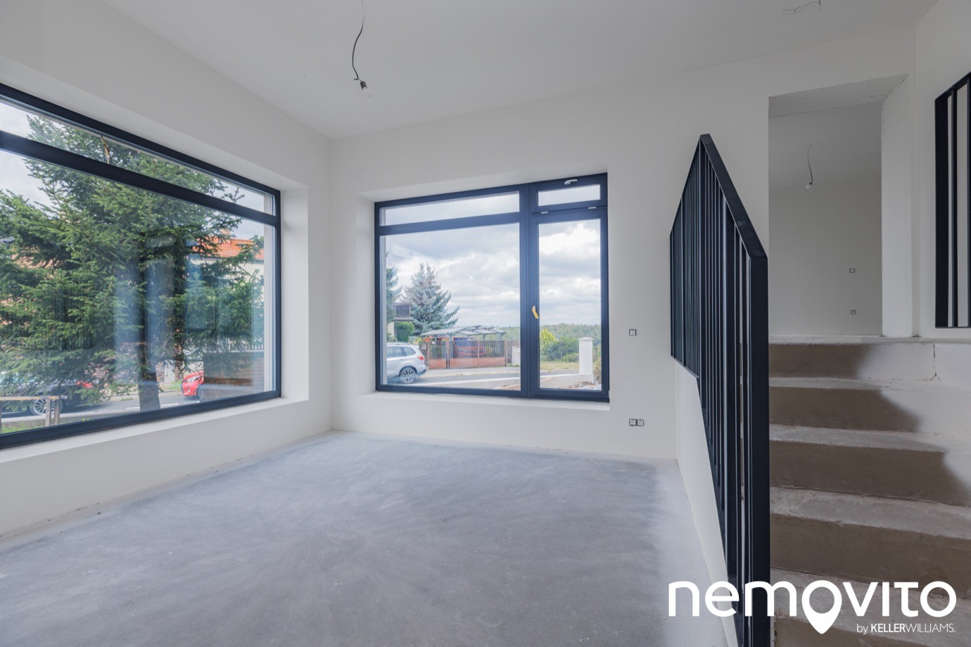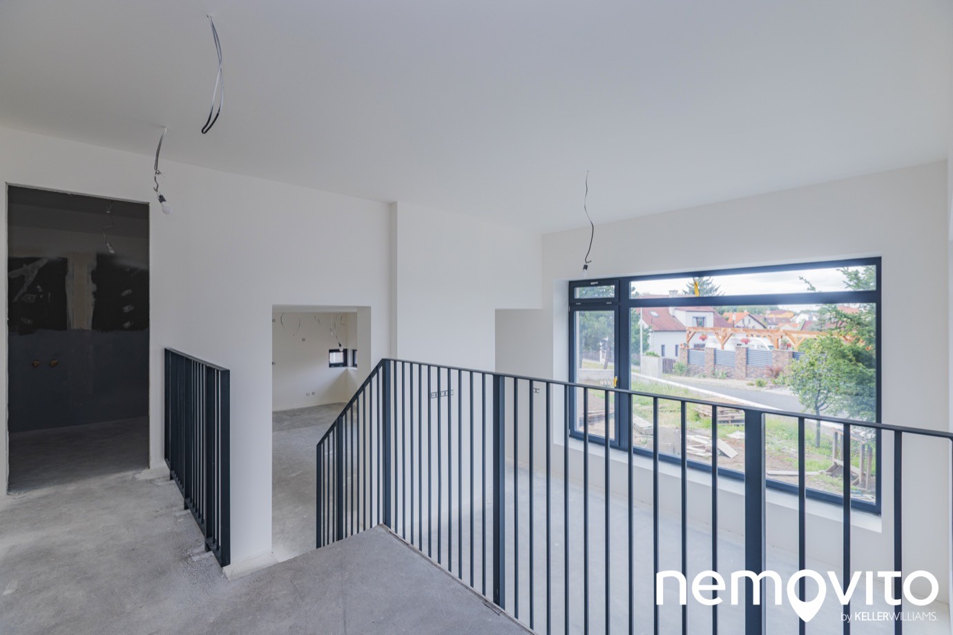 Ložnice se nachází ve druhé úrovni, tedy o 7 schodů výše. Konstrukce zábradlí je ocelová, lakovaná do černého matu, který ladí k rámům oken a pravděpodobně se promítne i v dalších prvcích dokončeného interiéru. Minimalistické provedení je univerzální k široké škále interiérových návrhů.