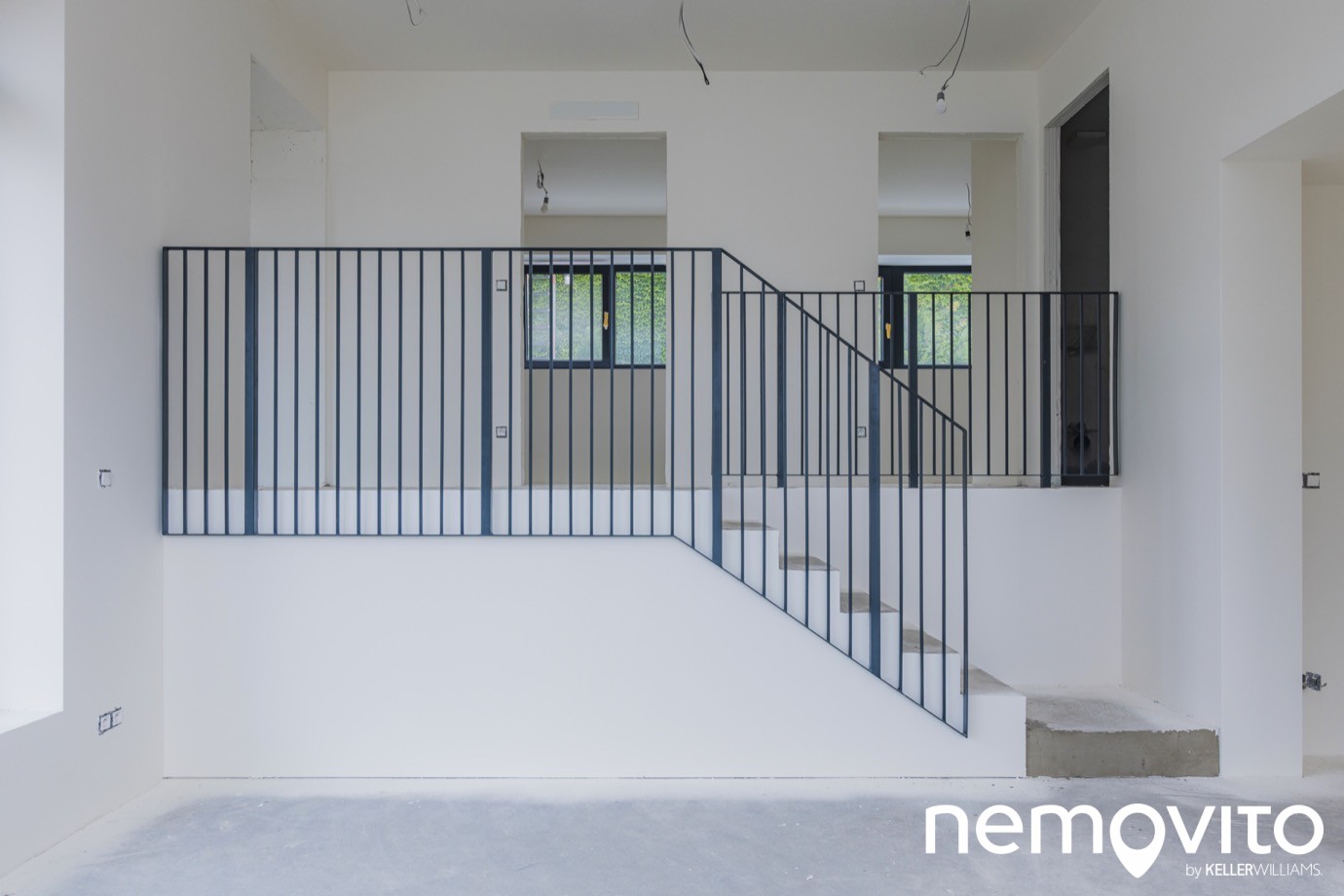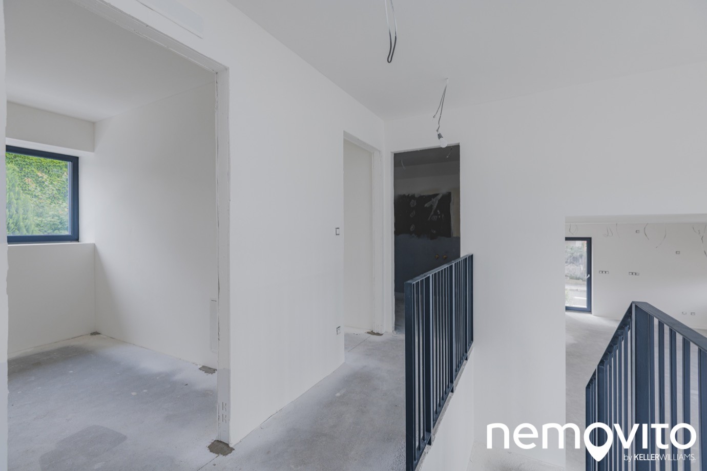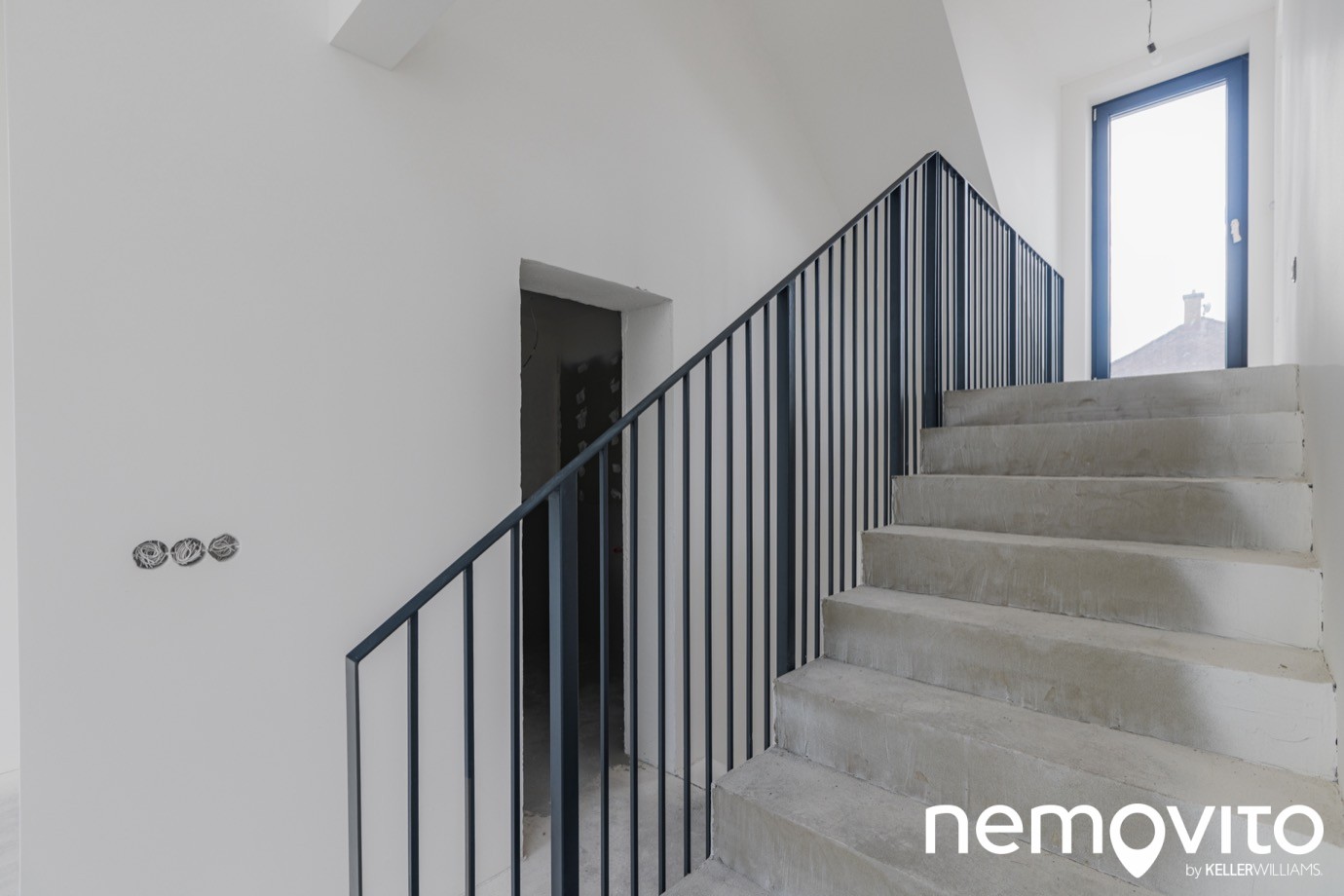 Ložnice se nachází ve druhé úrovni, tedy o 7 schodů výše. Konstrukce zábradlí je ocelová, lakovaná do černého matu, který ladí k rámům oken a pravděpodobně se promítne i v dalších prvcích dokončeného interiéru. Minimalistické provedení je univerzální k široké škále interiérových návrhů.