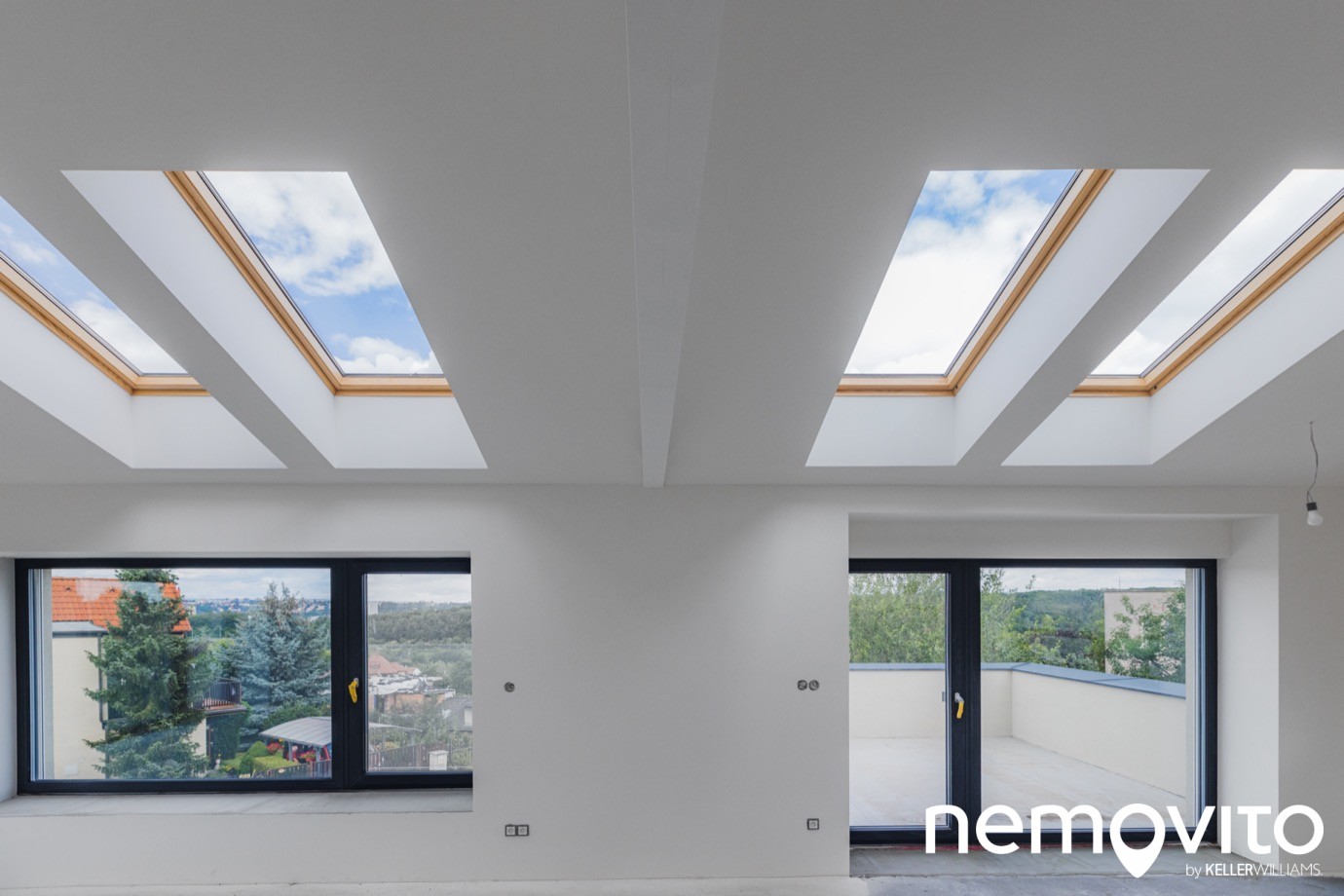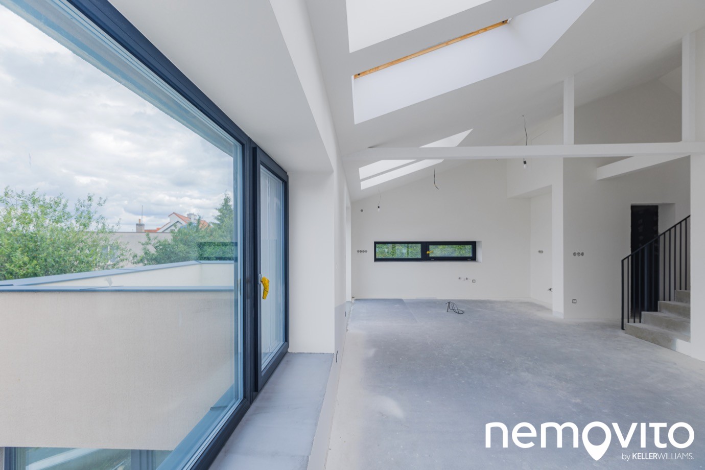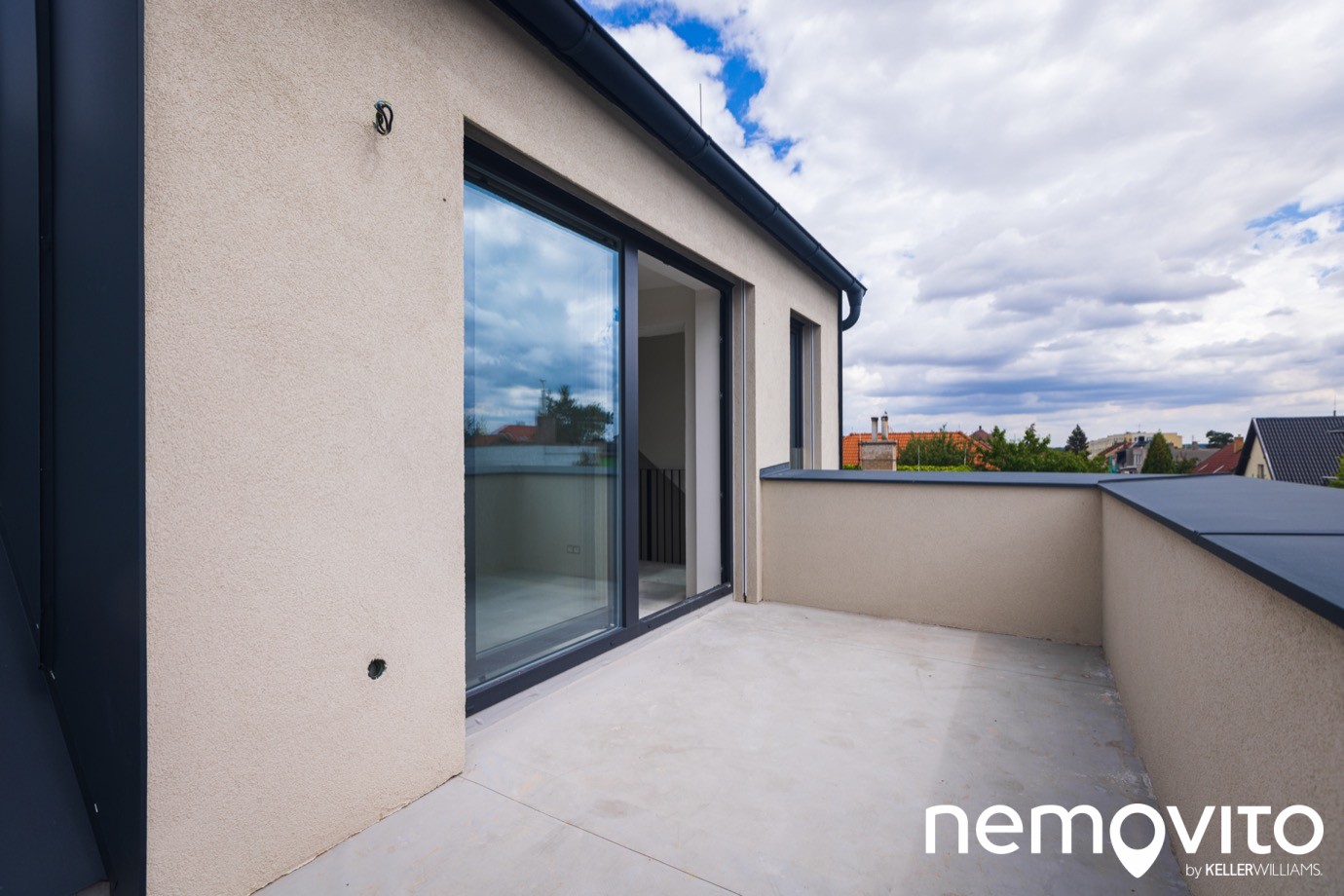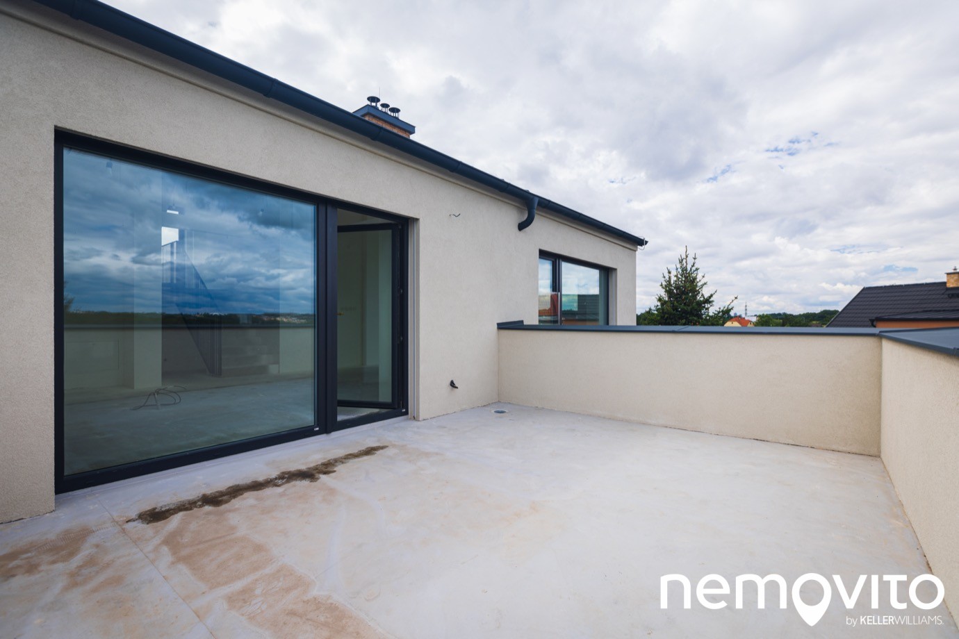 Doménou horního bytu jsou terasy a výhled. Tato větší je přístupná od kuchyně, její plocha je 17 m2. Odvod dešťové vody i kompletní hydroizolace je hotová, chybí jen poslední vrstva. Zda budete volit dlažbu na terčích, dřevo nebo cokoliv jiného, to už necháváme na vašem vkusu.