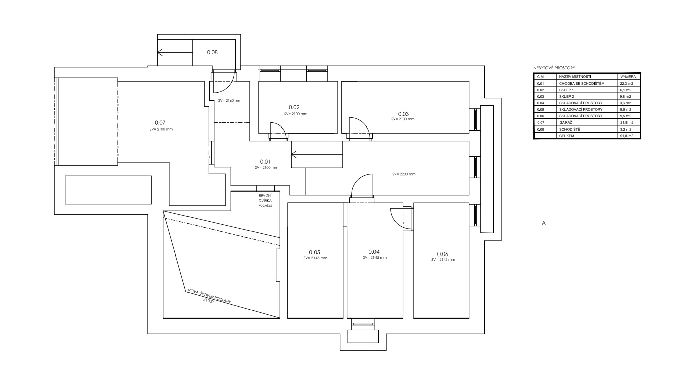 Plán společných částí budovy, které se finišují a proto je na fotkách prozatím nenajdete. Ke spodnímu bytu náleží 22 m2 garáž s bočním úložným výklenkem. Každá jednotka má k dispozici vlastní zděný sklep. Zbylé dvě volné místnosti mohou majitelé využít pro posilovnu, saunu nebo cokoliv dalšího. Ve sklepě se taktéž nachází kotelna domu, tedy jednotka tepelného čerpadla se všemi rozvody a zásobníkem na teplou vodu..